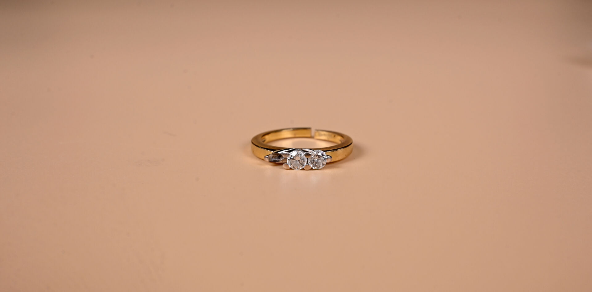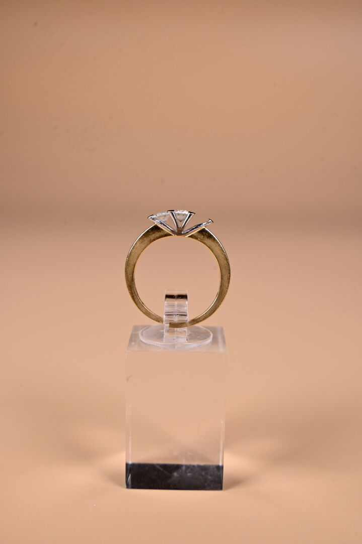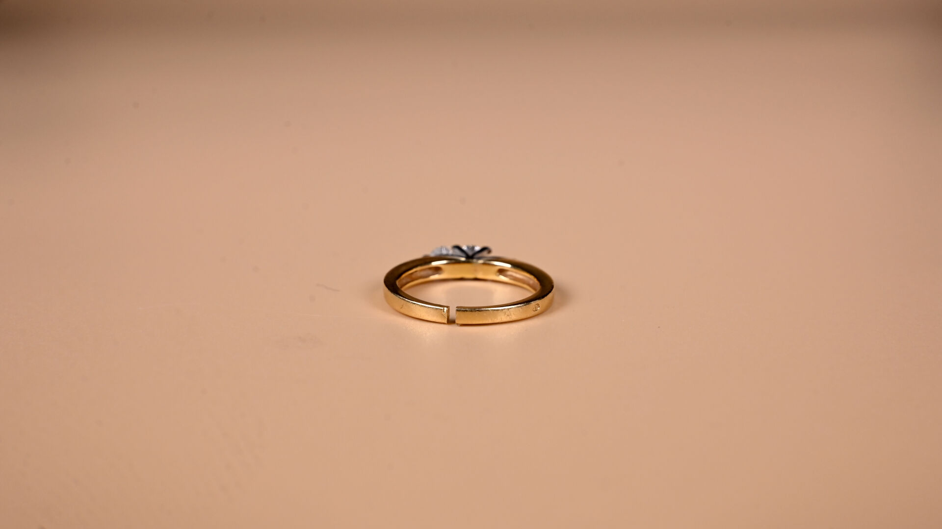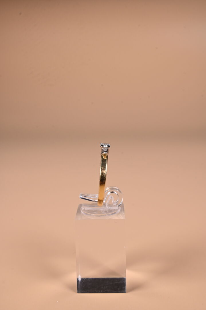 Bague en deux ors 18K 750/1000e, sertie de 3 diamants taille moderne d’environ 0,20 carat chacun (un décroché). TDD. 56 (sciée). Poids brut. : 4,6 g.