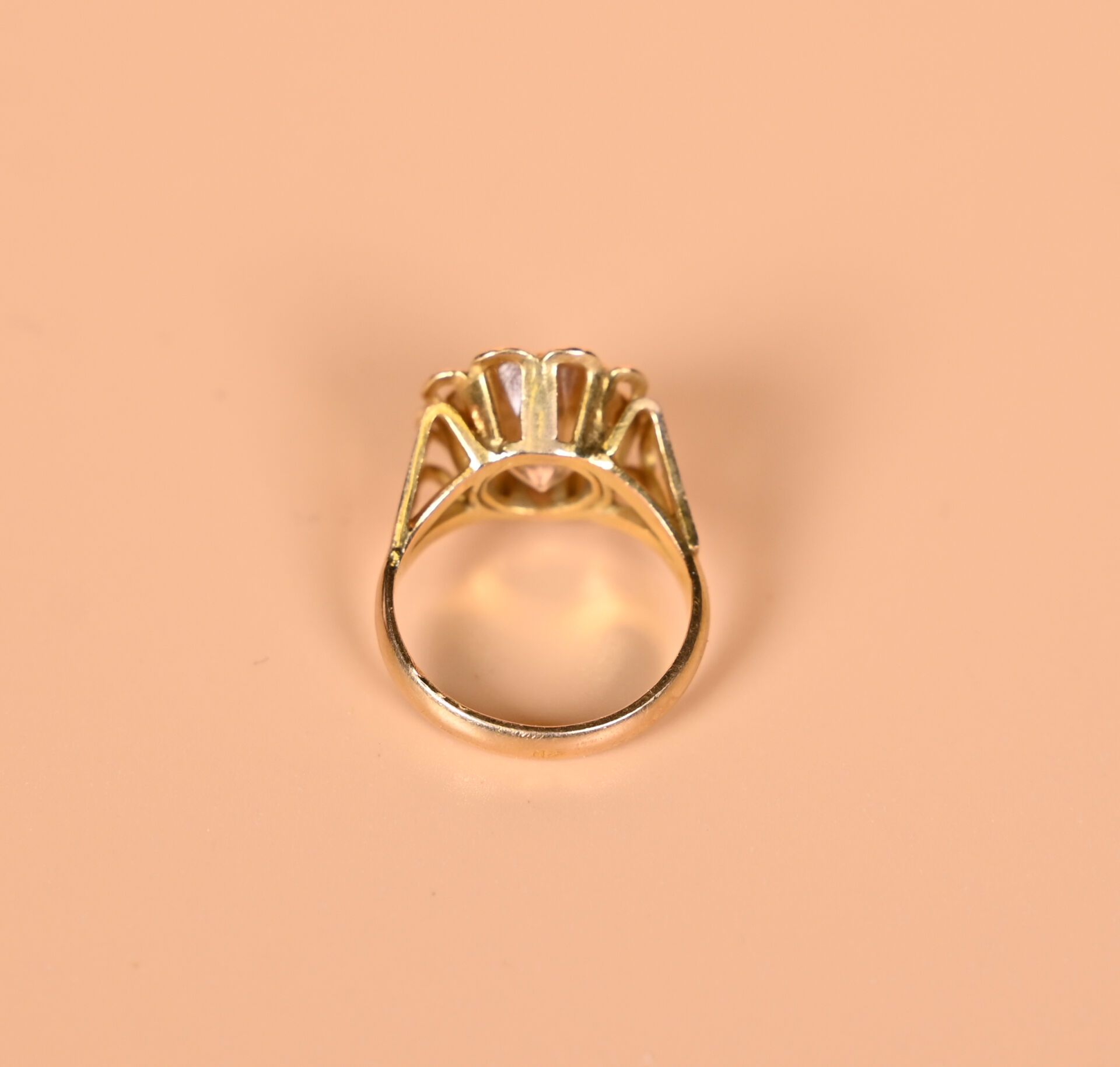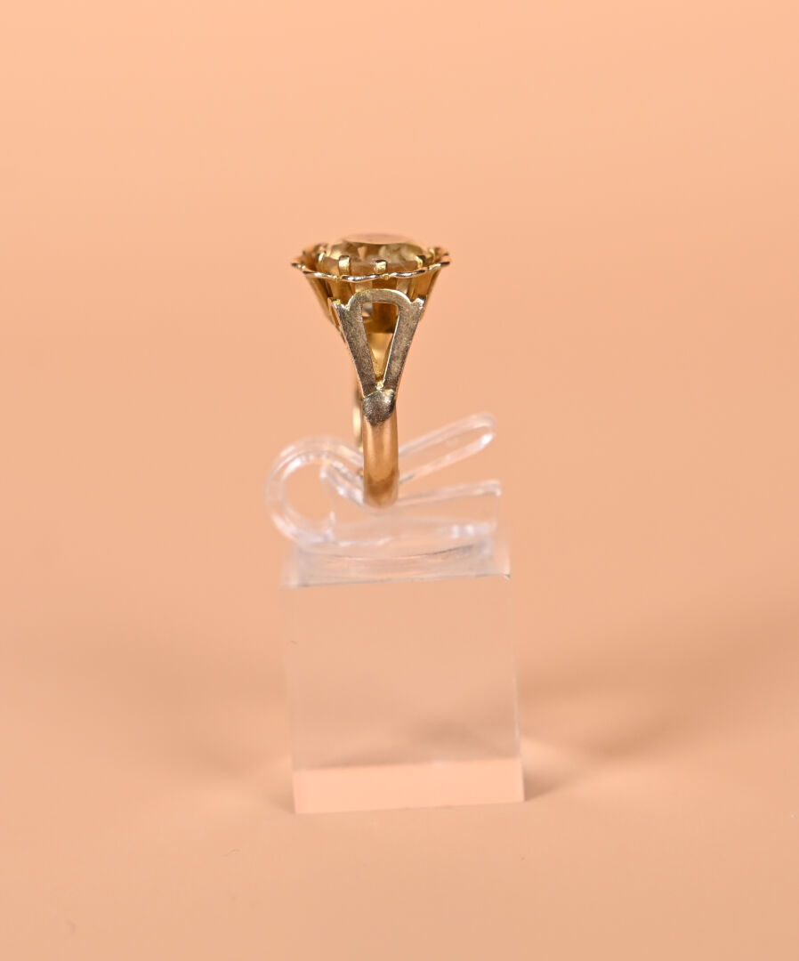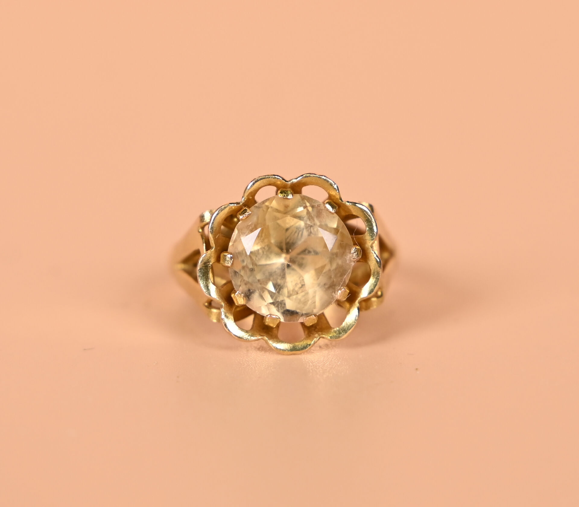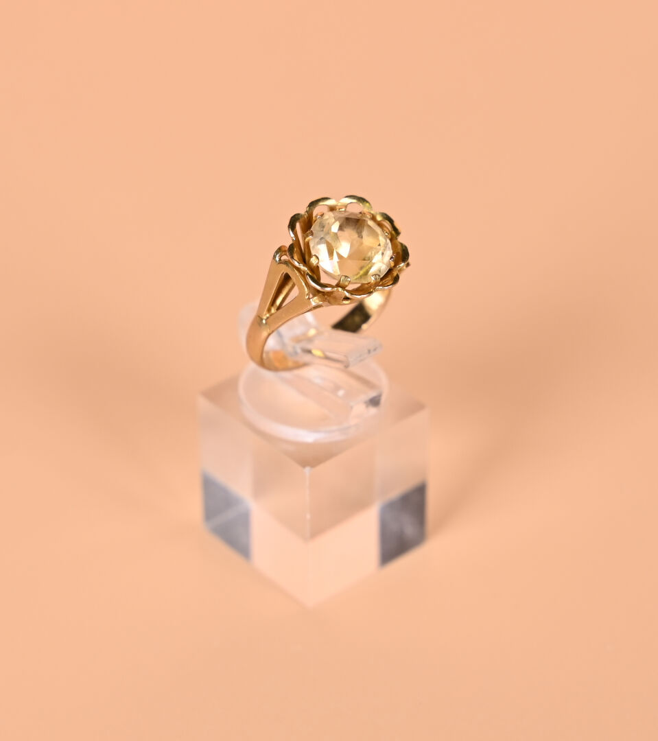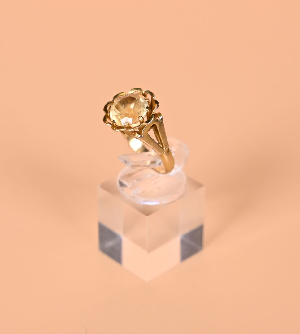 Bague en or 18K 750/1000e à plateau style fleur avec pierre jaune d’imitation. TDD 52. Poids brut : 5,9 g.