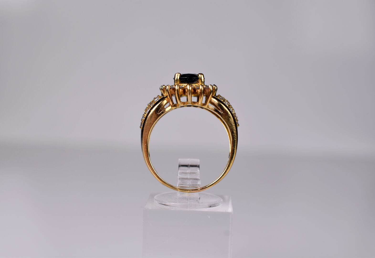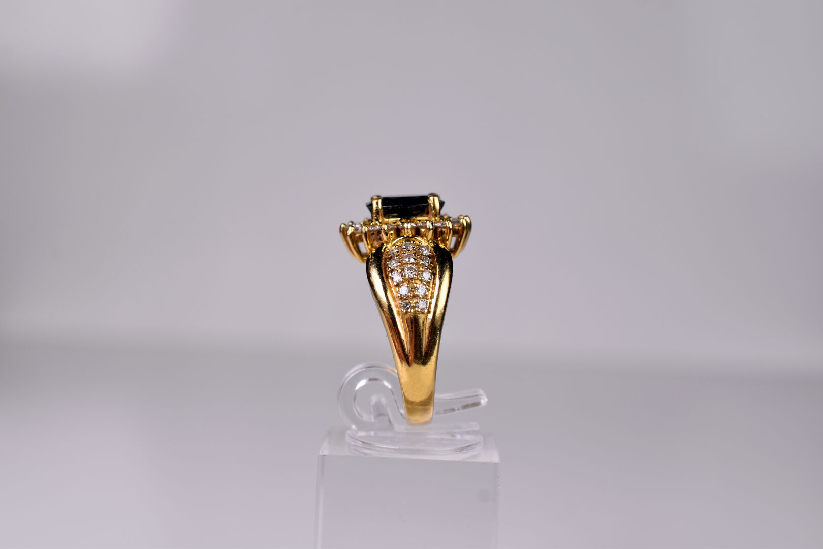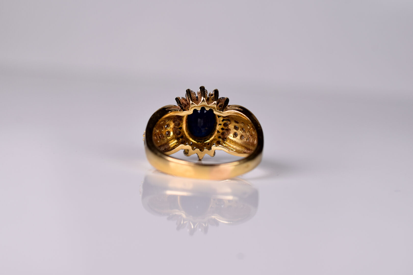 Bague en or 18K 750/1000e centrée d’un saphir ovale (traité) dans un entourage de 16 petits diamants de taille moderne sur un épaulement de diamants en pavage. TDD 58. Poids brut. : 7,7 g.