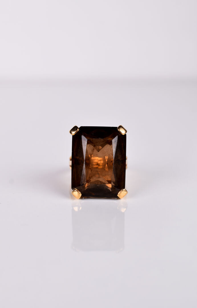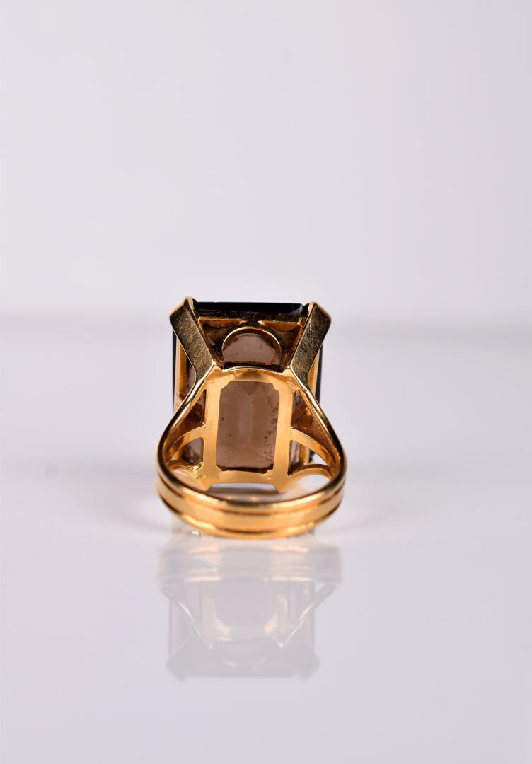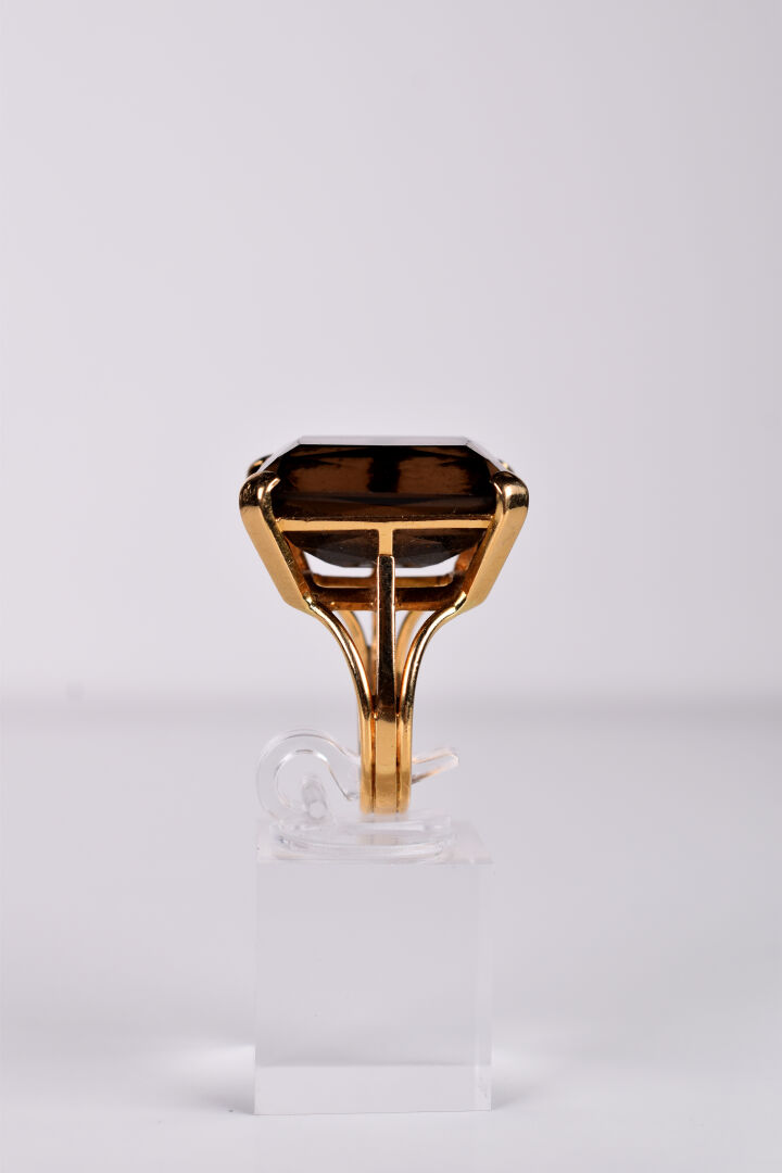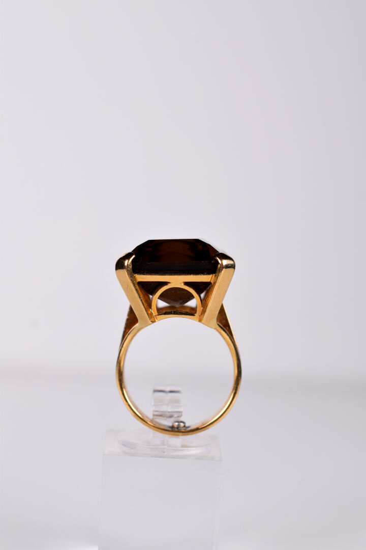 Bague en or 18K 750/1000e ornée d’un important quartz fumé taille ciseaux (22,2 x 17 mlm environ) rayures. TDD 55. Poids brut. : 15,3 g.