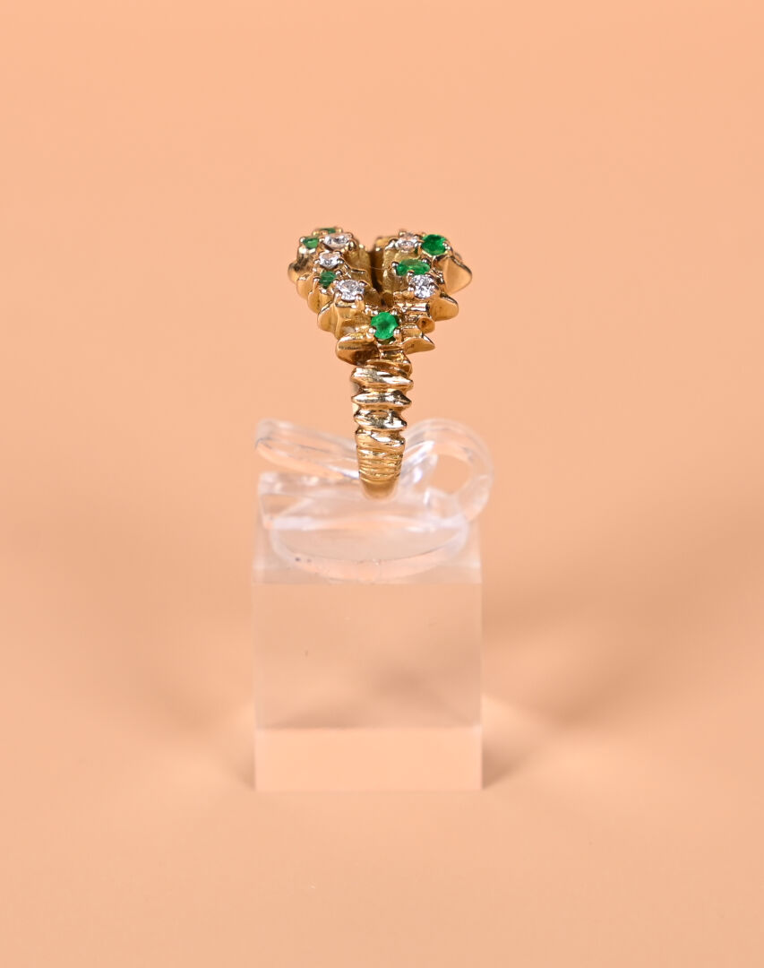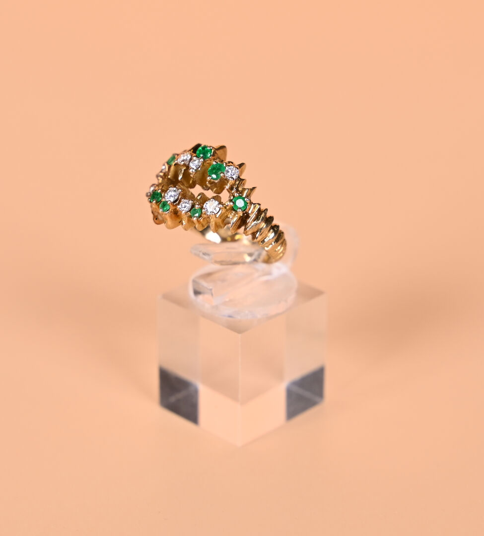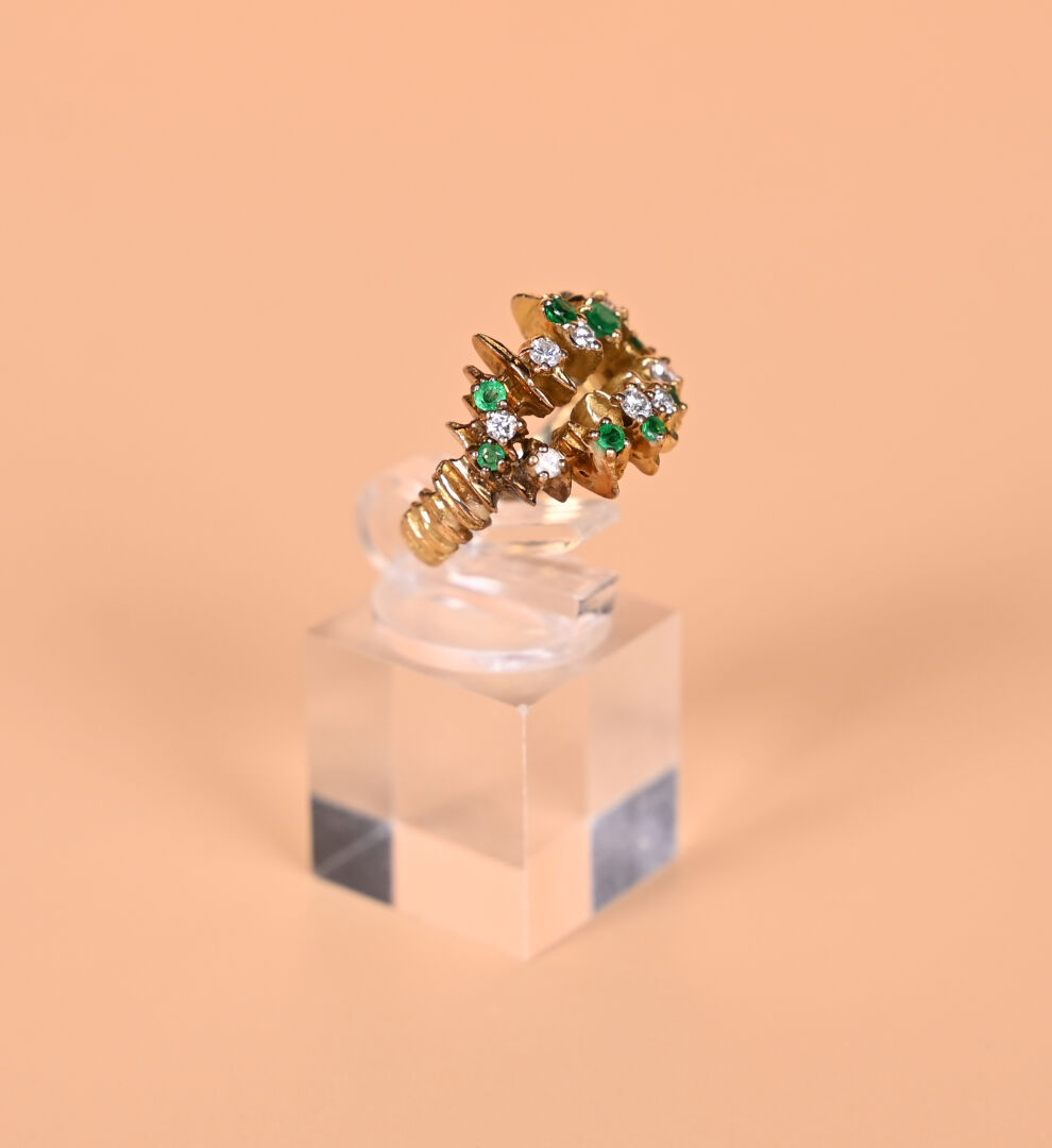 Bague en or 18K 750/1000e sertie d’émeraudes et de diamants. Monture texturée et mouvementée. Travail des années 70. TDD 54. Poids brut : 9,2 g.