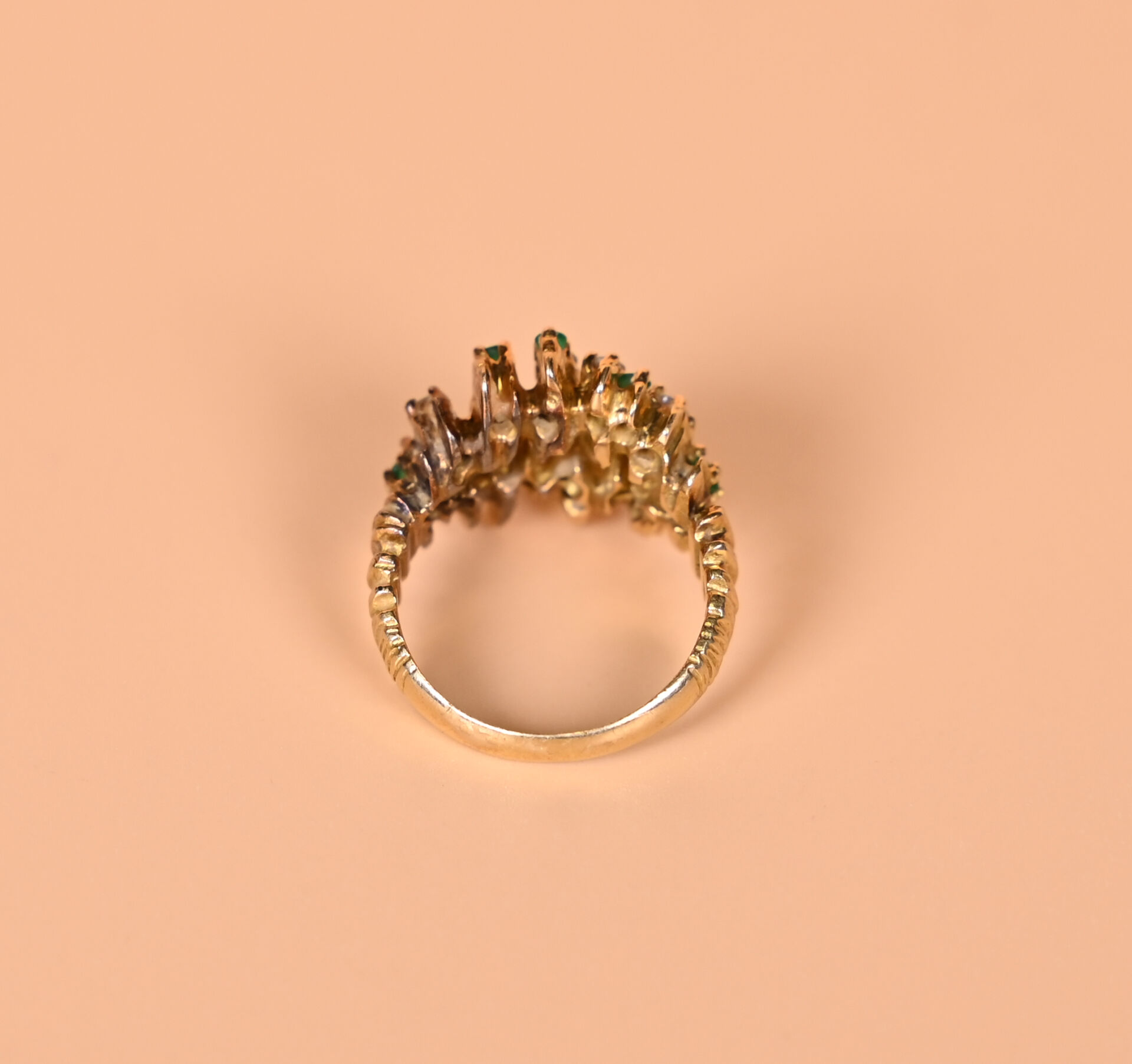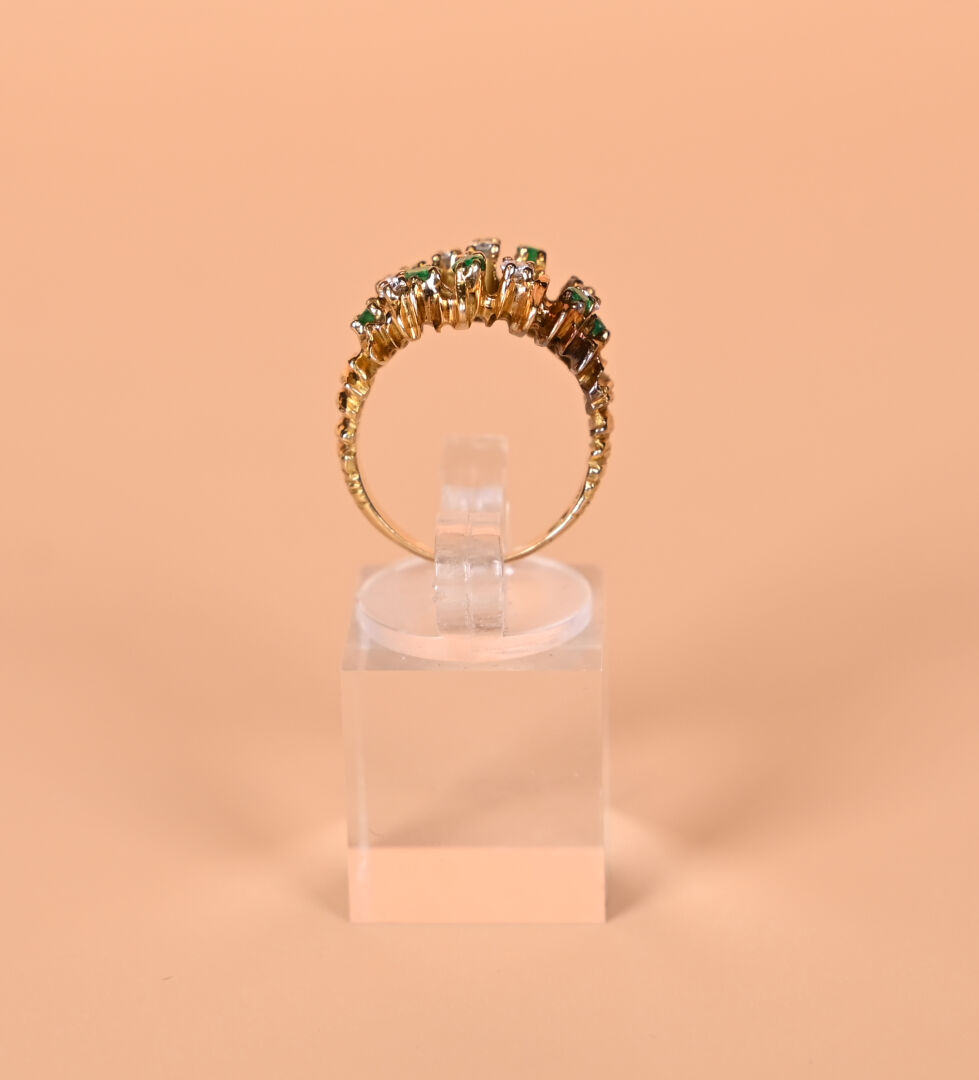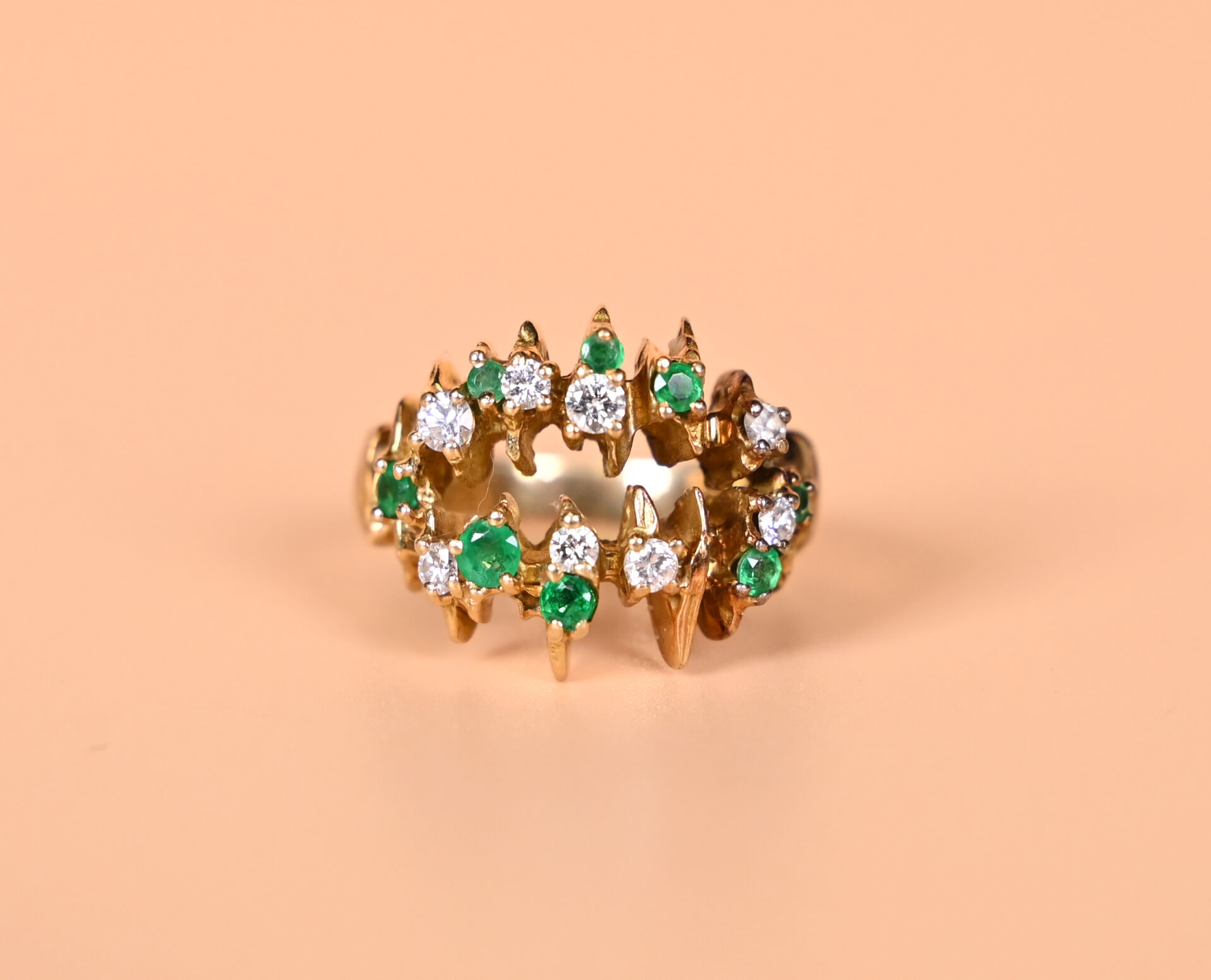 Bague en or 18K 750/1000e sertie d’émeraudes et de diamants. Monture texturée et mouvementée. Travail des années 70. TDD 54. Poids brut : 9,2 g.
