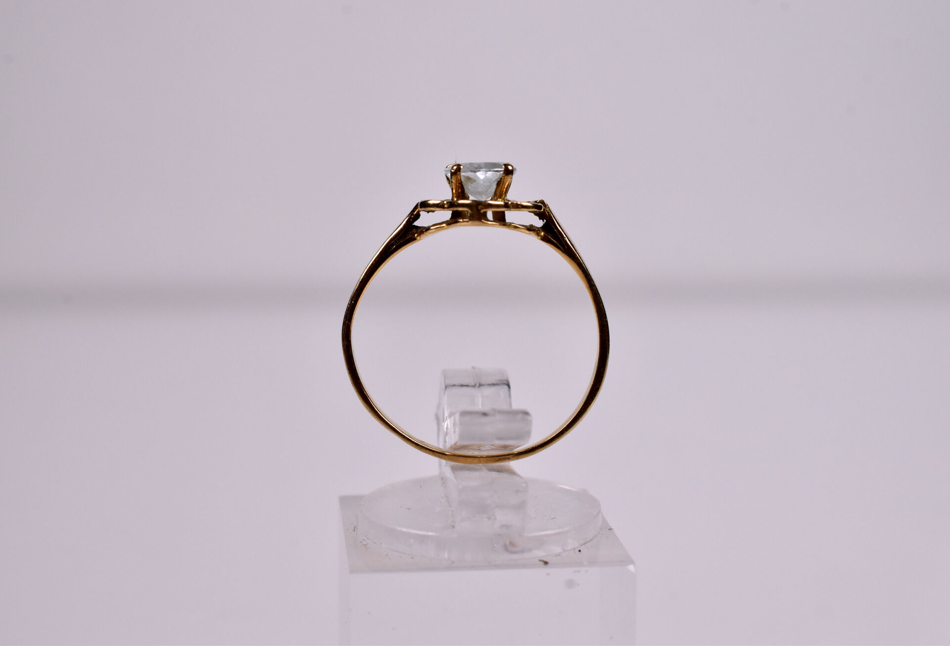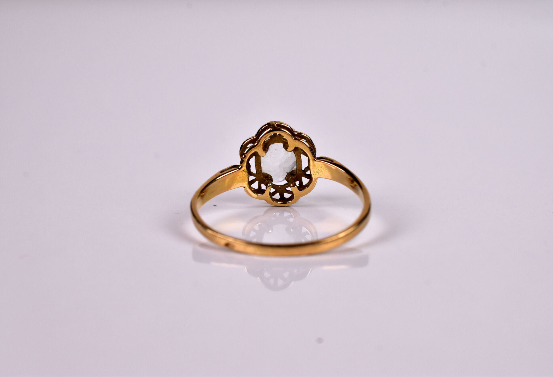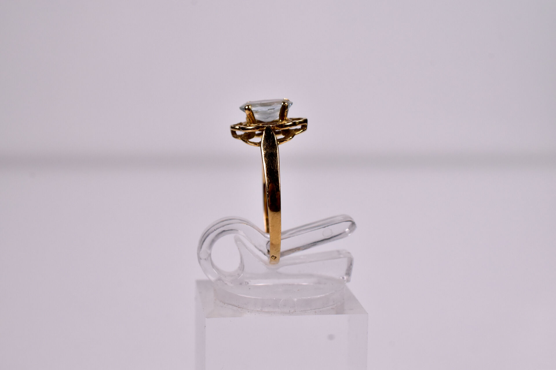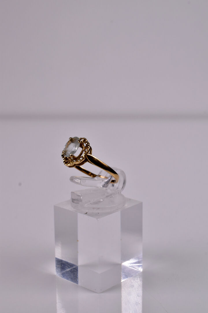 Bague en or 750/1000e et aigue-marine sur un panier ajouré. Tdd : 54. Poids brut : 1,6 g.