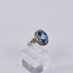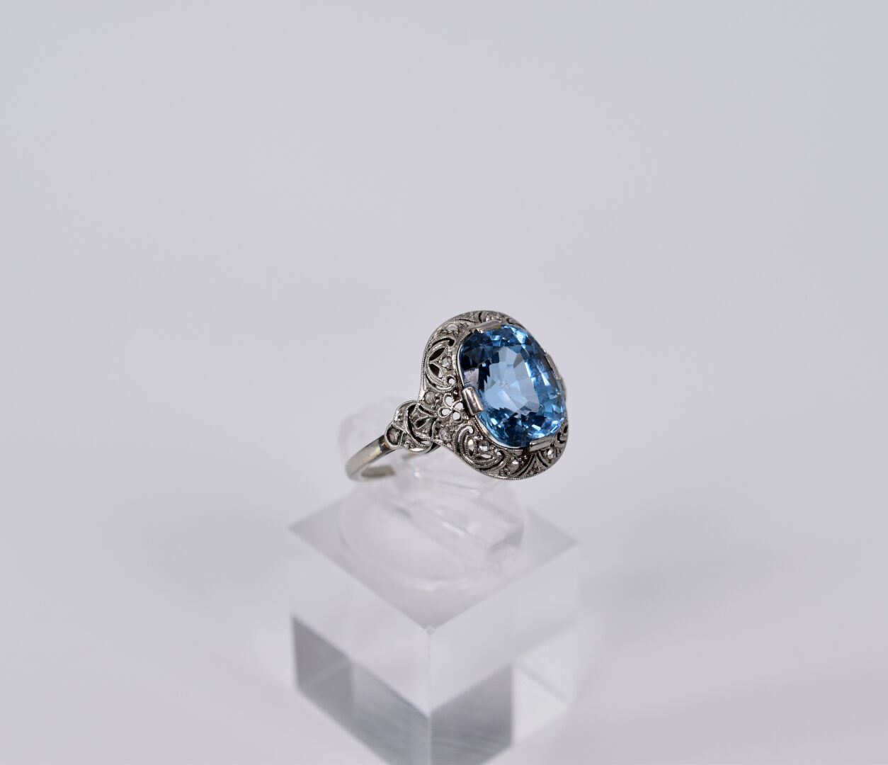 Bague en or gris 18K 750/1000e le chaton ciselé ajouré orné en son centre d’une aigue-marine de taille ovale (usures) et quelques éclats de diamants. Vers 1900. TDD. : 52. Poids brut : 4,29 g.