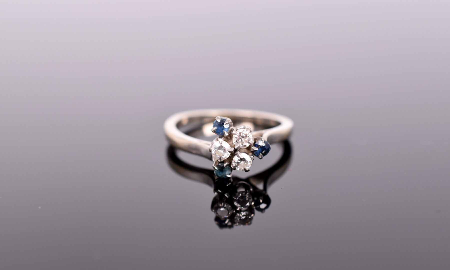 Bague en or gris 18K 750/1000e, le chaton orné d’une trilogie de petits diamants d’environ 0,05 carat chacun et de trois petits saphirs (usures). TDD : 51,5. Poids brut : 3 g.