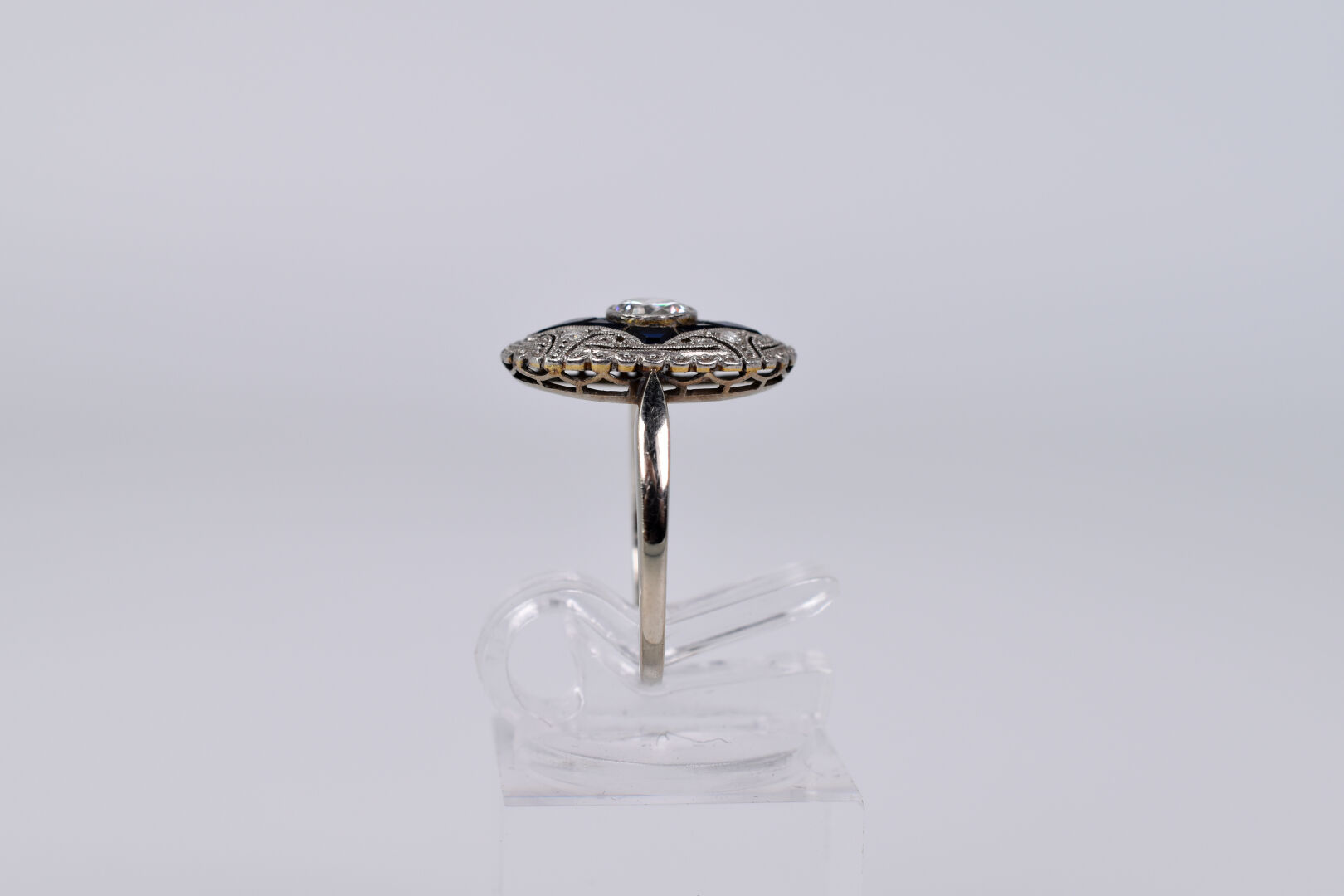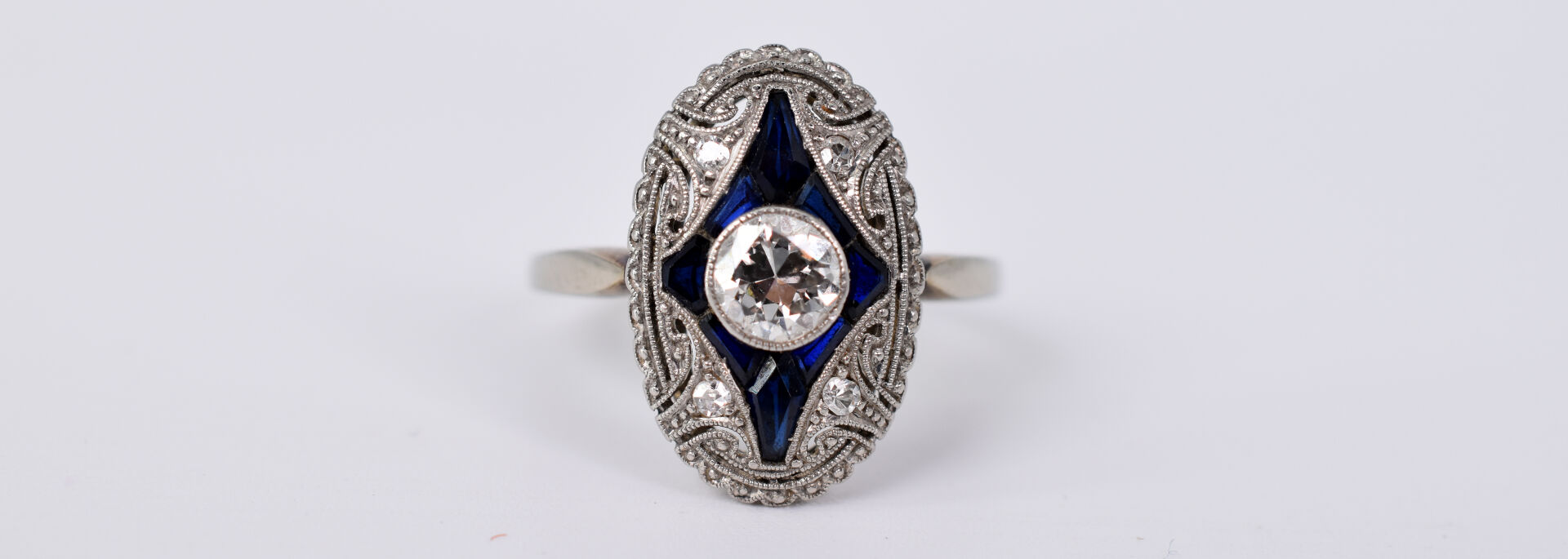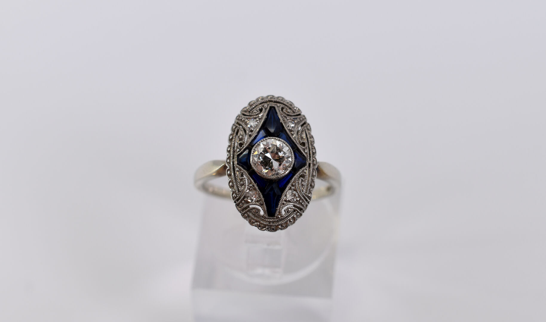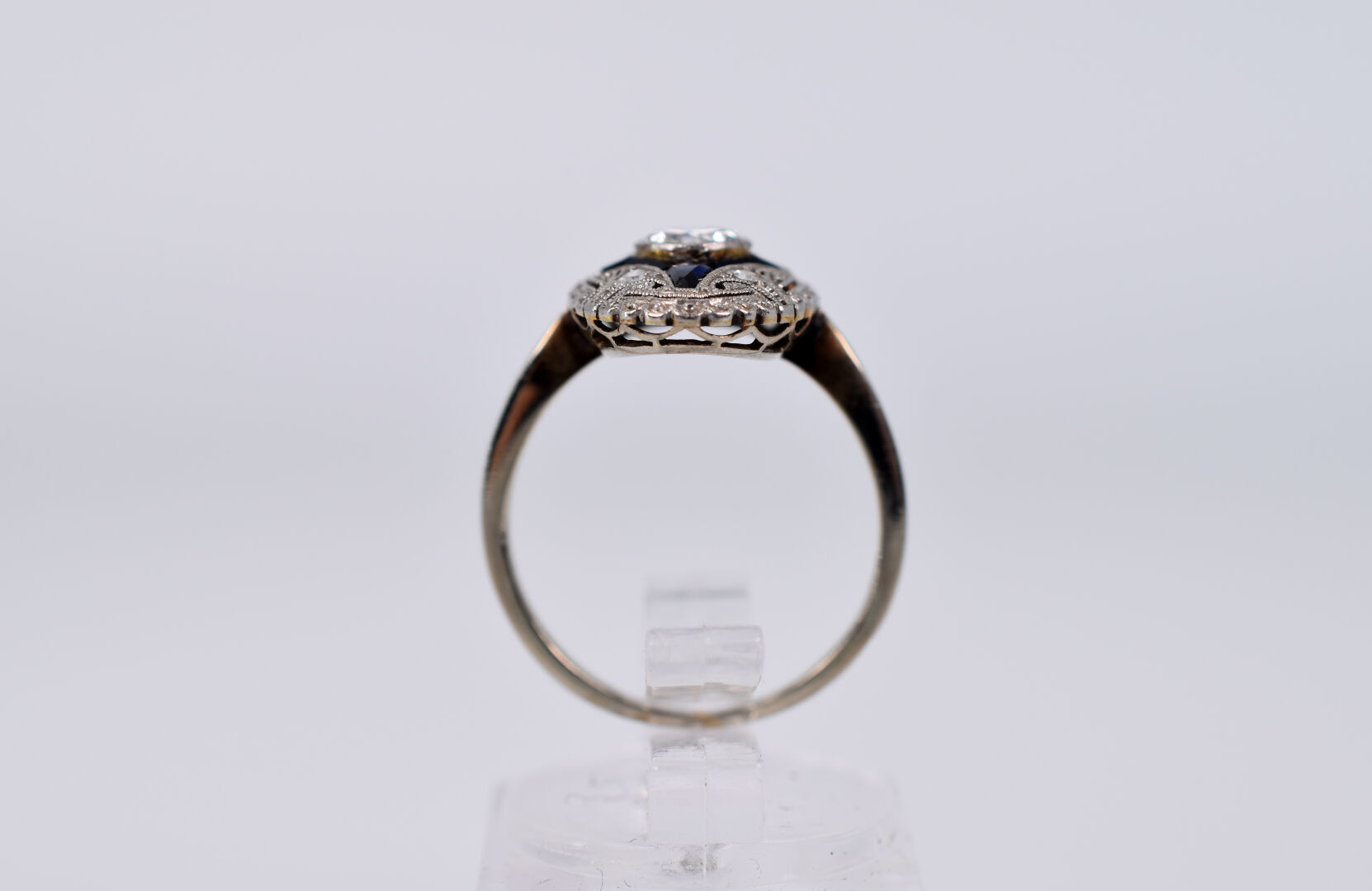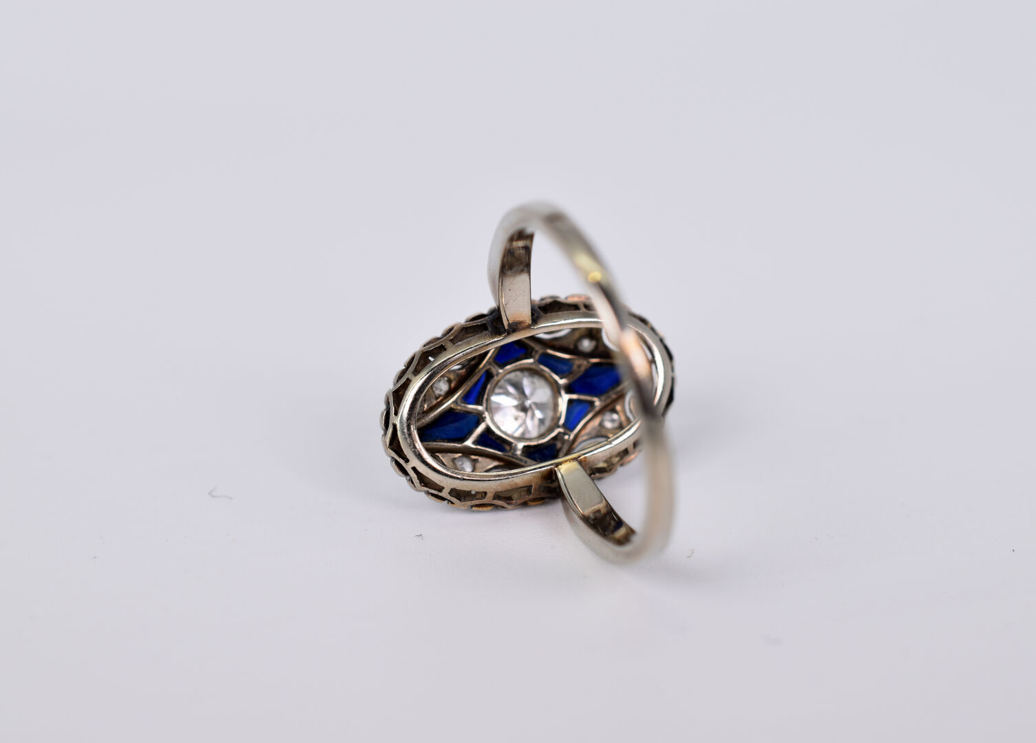 Bague en or gris 18K 750/1000e, le chaton ovale finement ciselé ajouré sertie en son centre d’un diamant de taille semi ancienne d’environ 0,45 carat dans un entourage de petits saphir et éclats de diamants. vers 1930. TDD 52. Poids brut : 3,42 g.