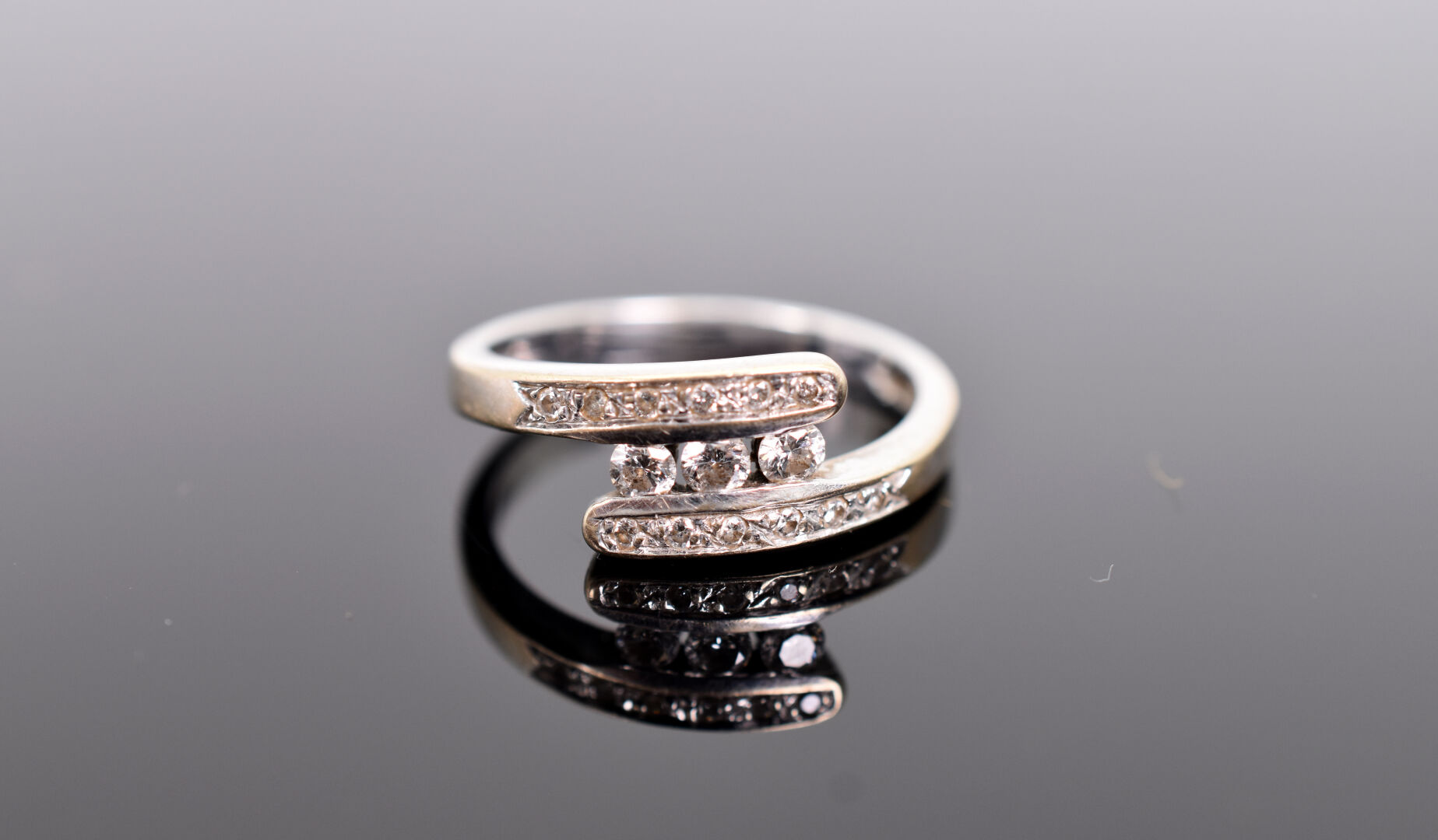 Bague en or gris 18K 750/1000e, petits diamants en pavage entourant 3 diamants de taille moderne de 0,05 carat chacun. TDD 54. Poids brut. : 3,4 g.