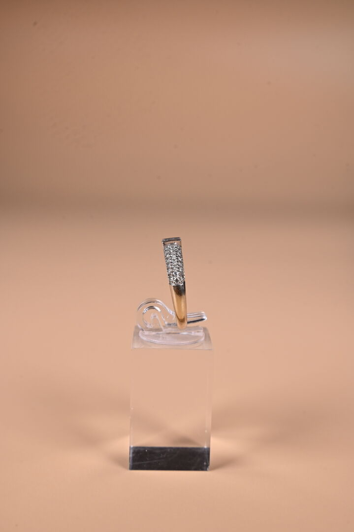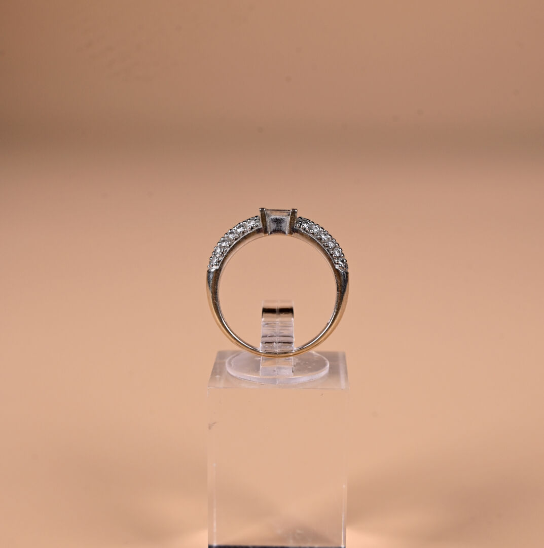 Bague en or gris 18k 750 millièmes centrée d’un diamant princesse d’env. 0,25 ct épaulé d’un pavage de diamants. TDD 53. Poids brut : 3,3 g.