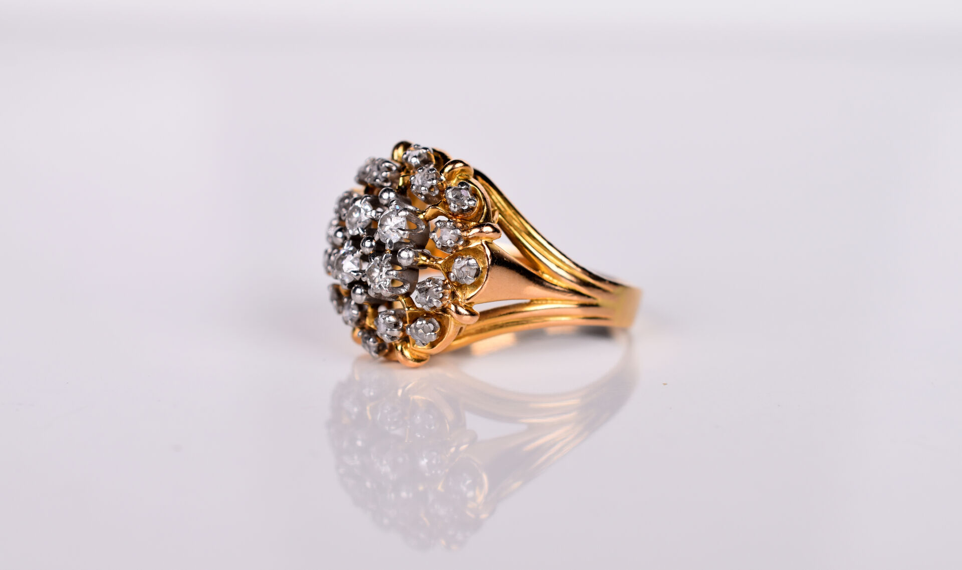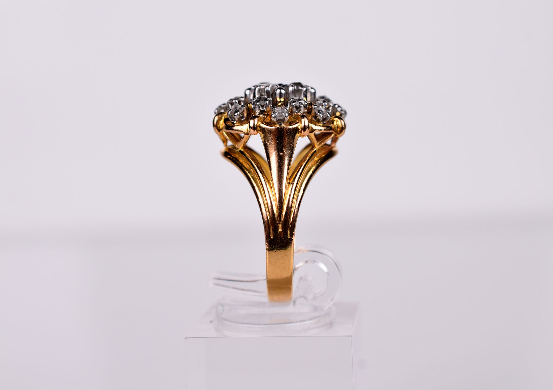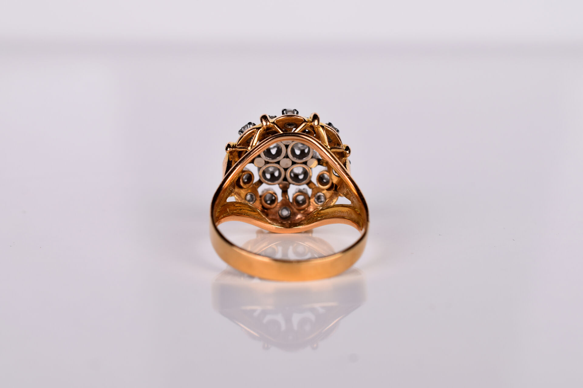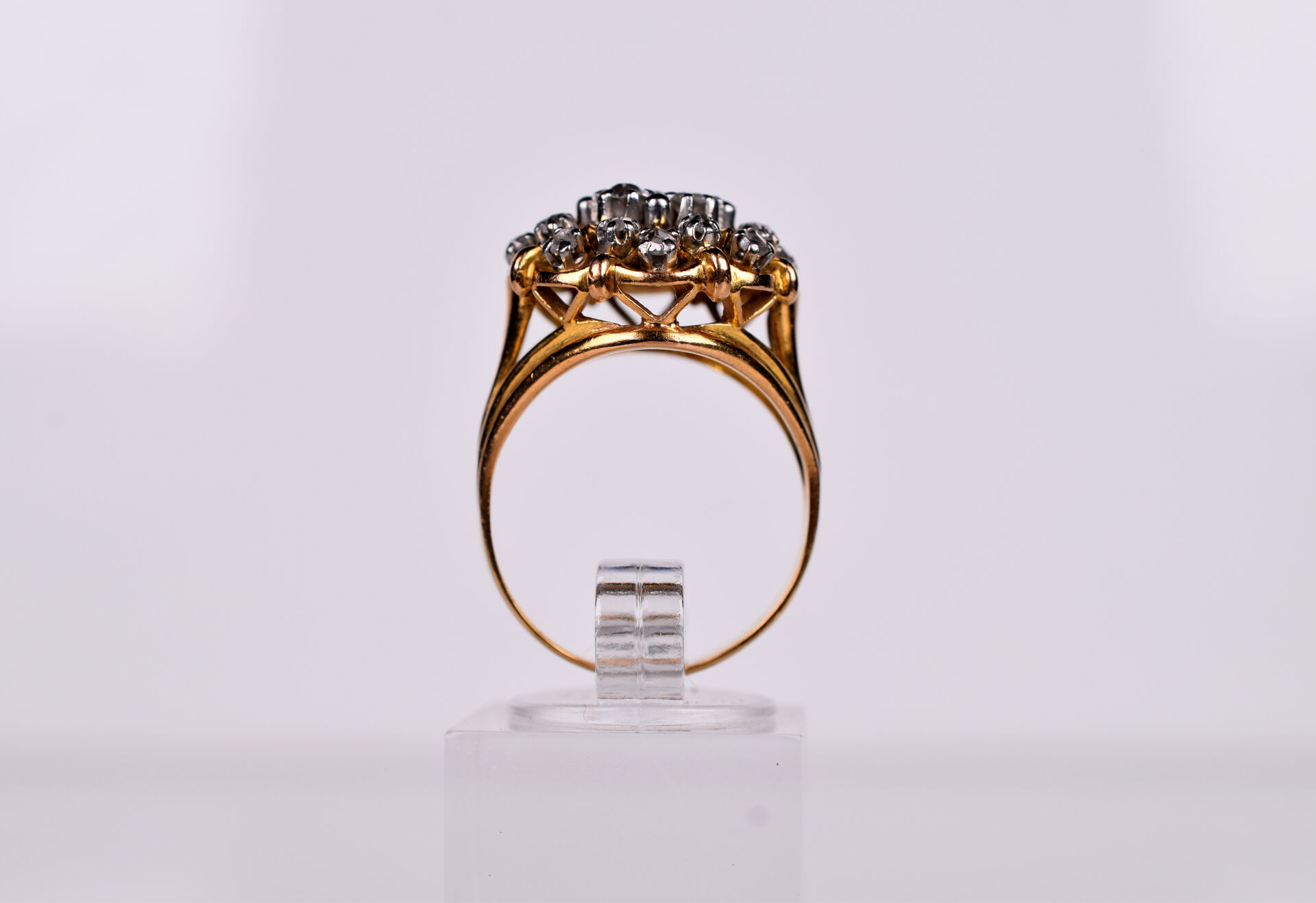 Bague en or jaune 18K 750/1000e à plateau rond serti de petits diamants taille ancienne et taille rose montés sur or gris. L’ensemble sur un serti ajouré. TDD. : 56. Poids brut. : 7,7 g.