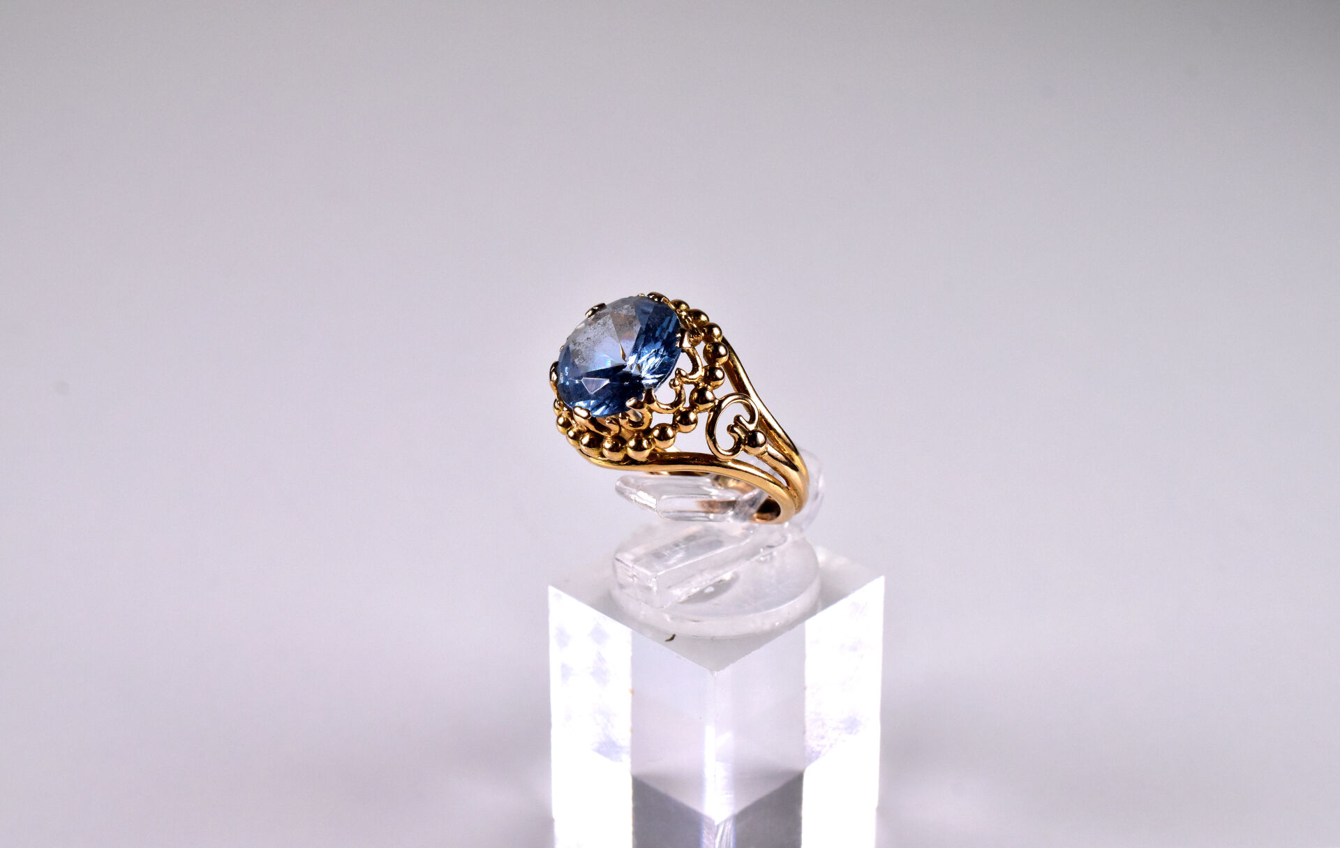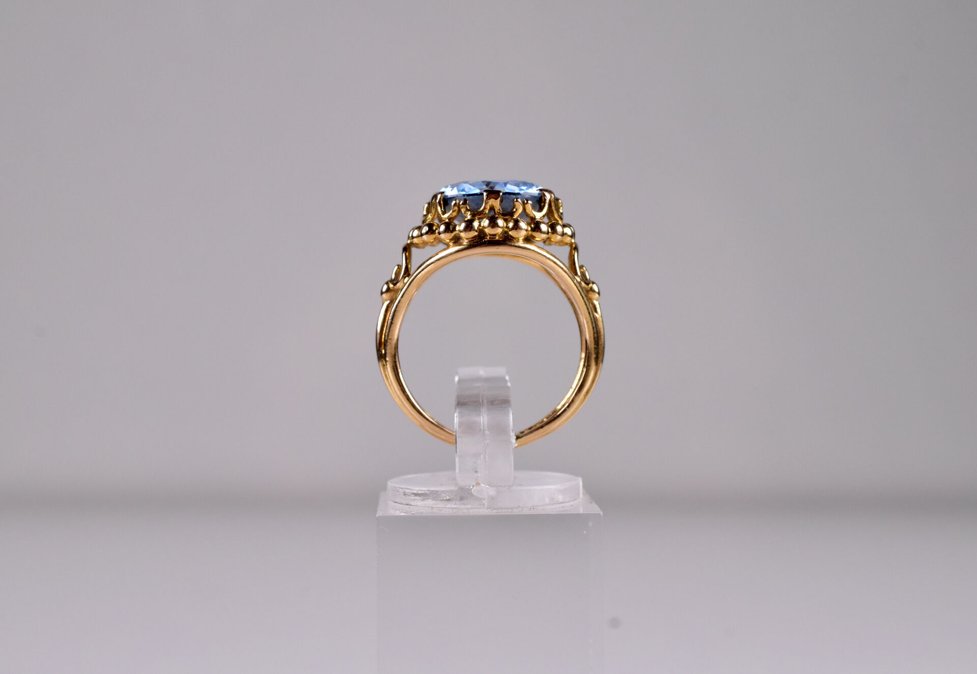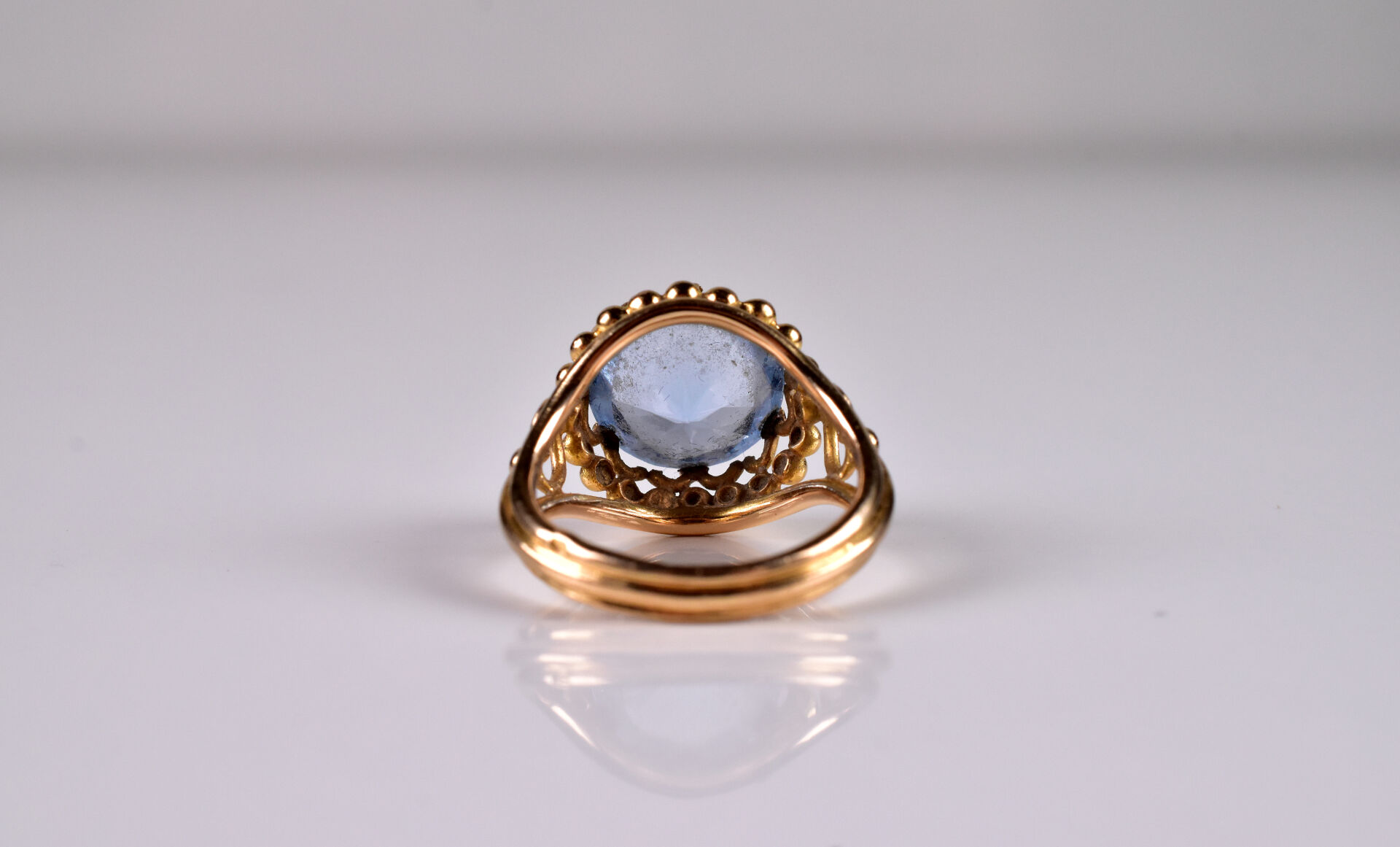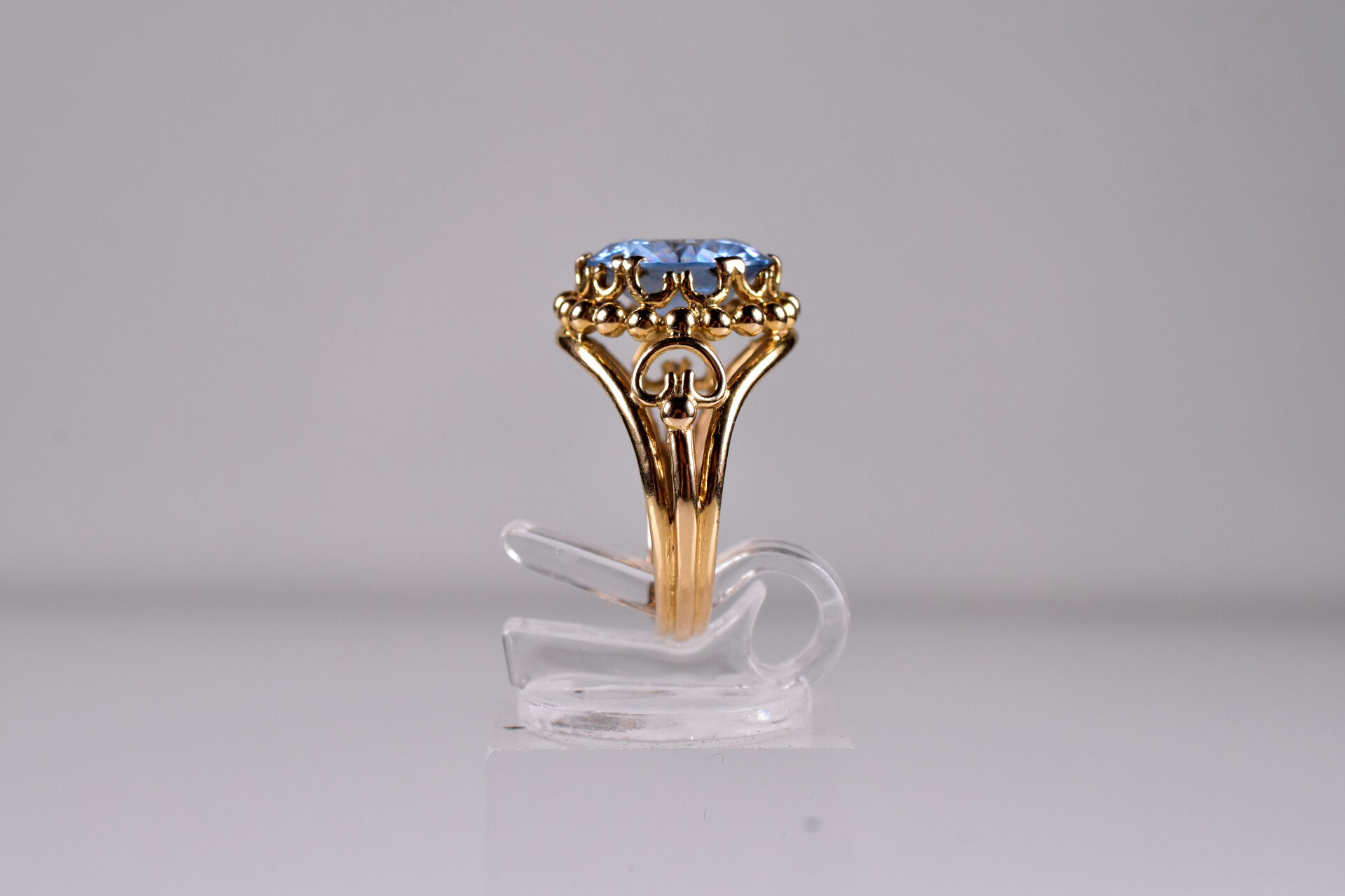 Bague en or jaune 18K 750/1000e centrée d’un spinelle bleu synthétique. TDD 52. Poids brut. : 6 g.
