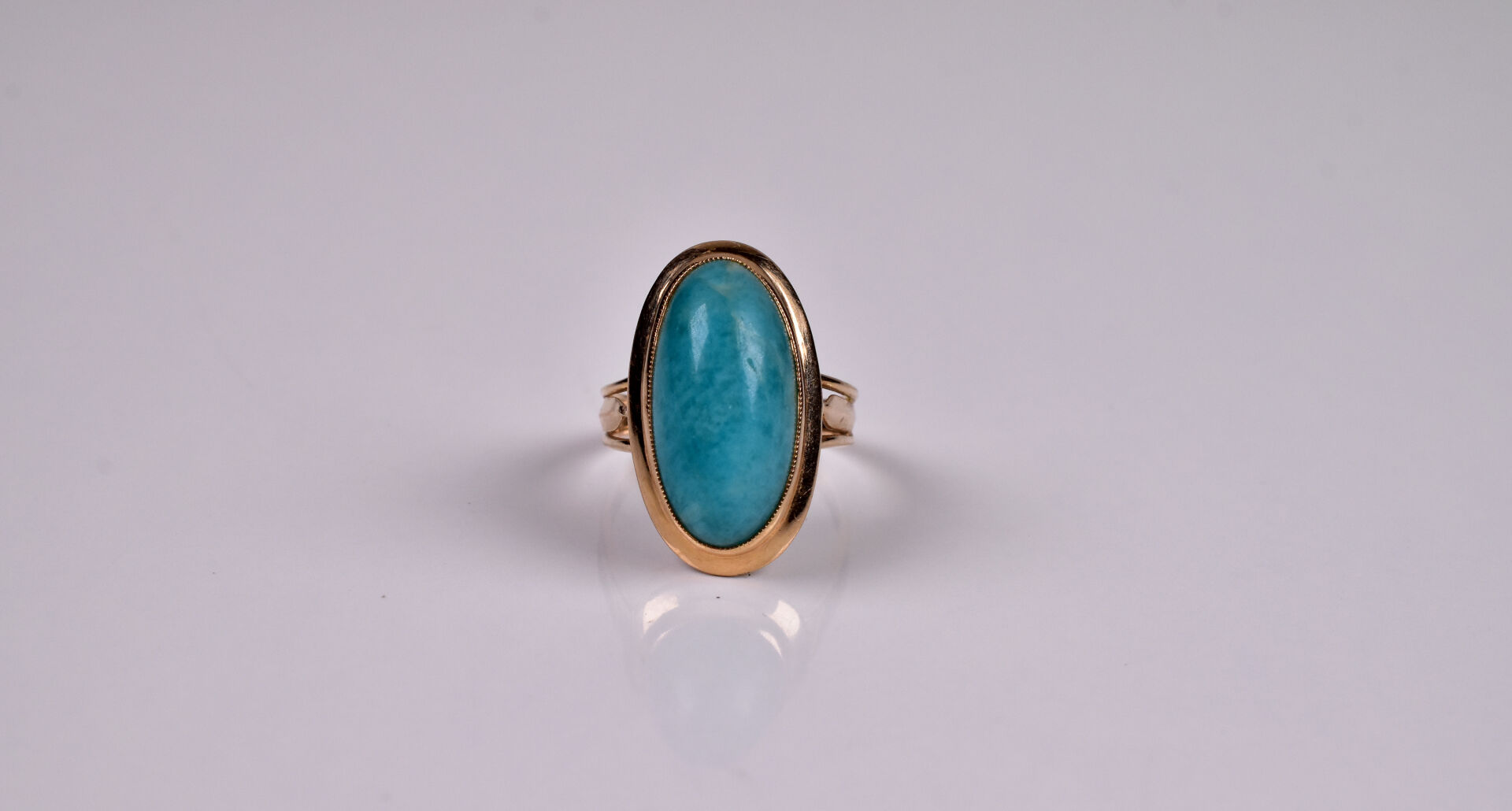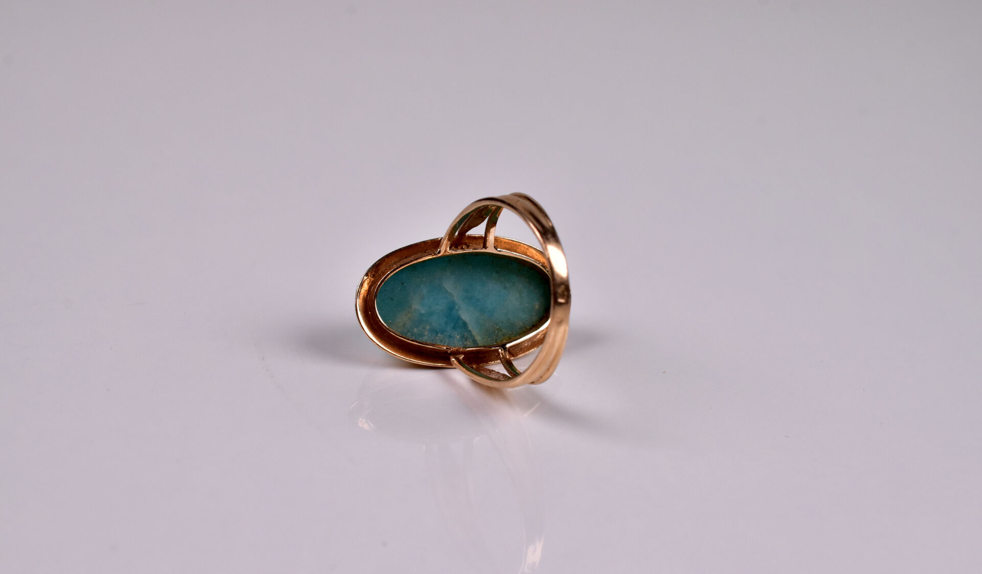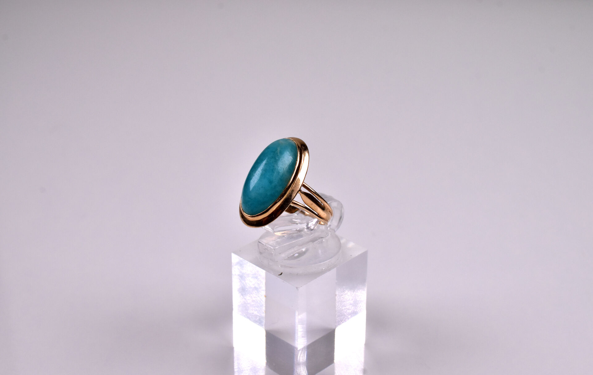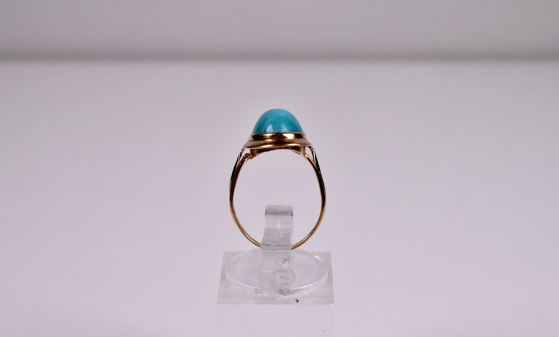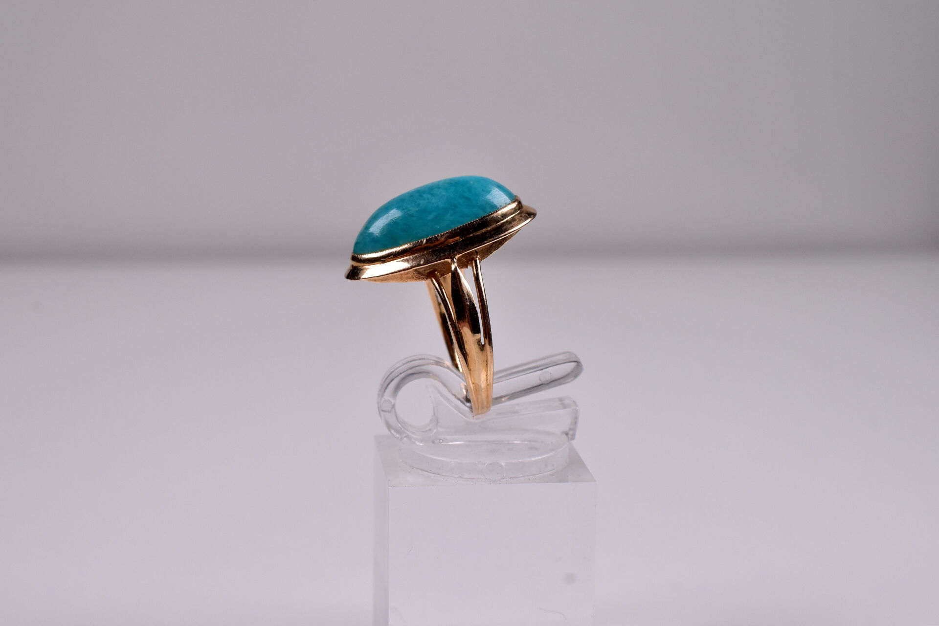 Bague en or jaune 18K 750/1000e et cabochon ovale d’amazonite. TDD. : 49. Poids brut. : 3,7 g.