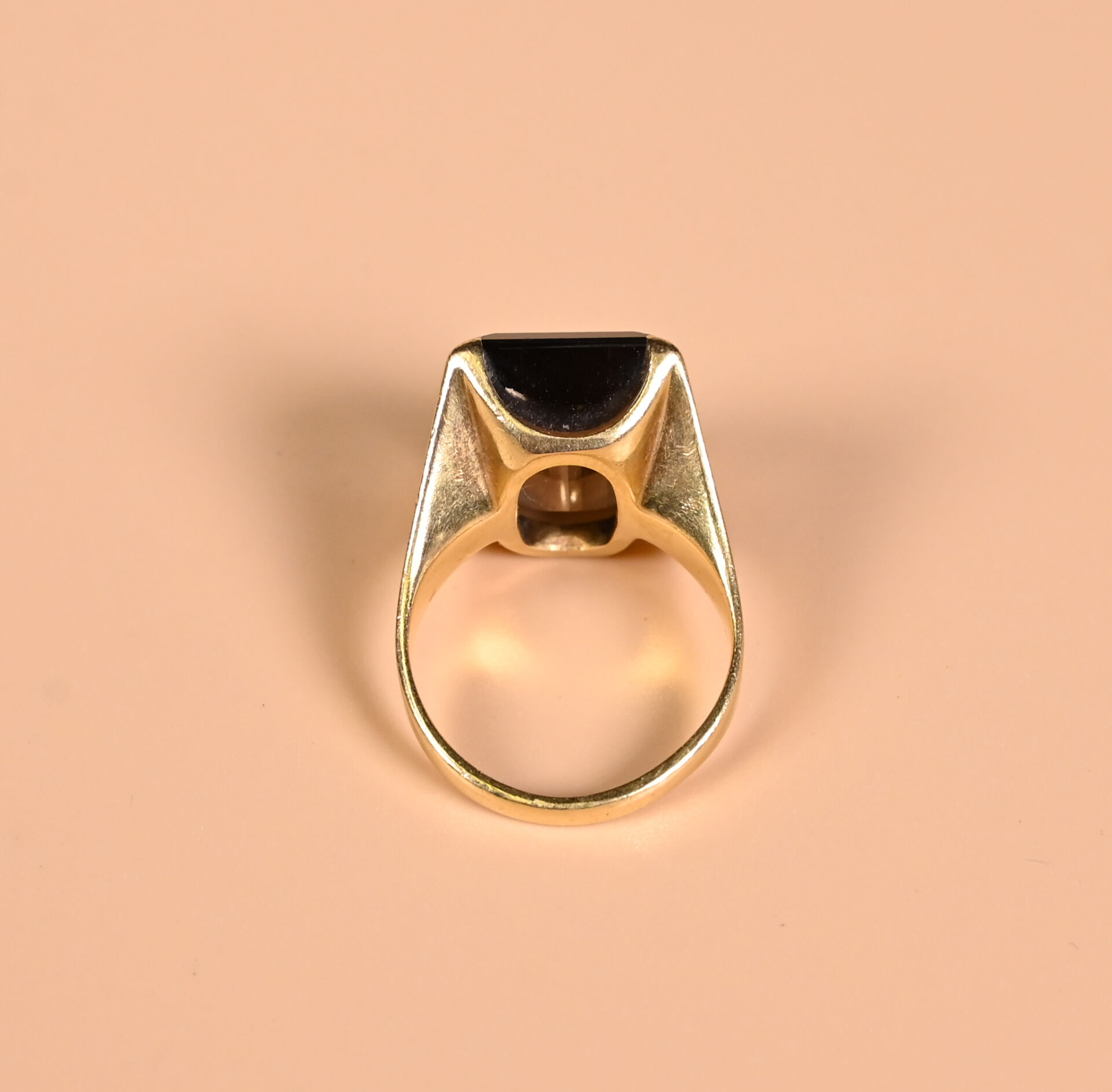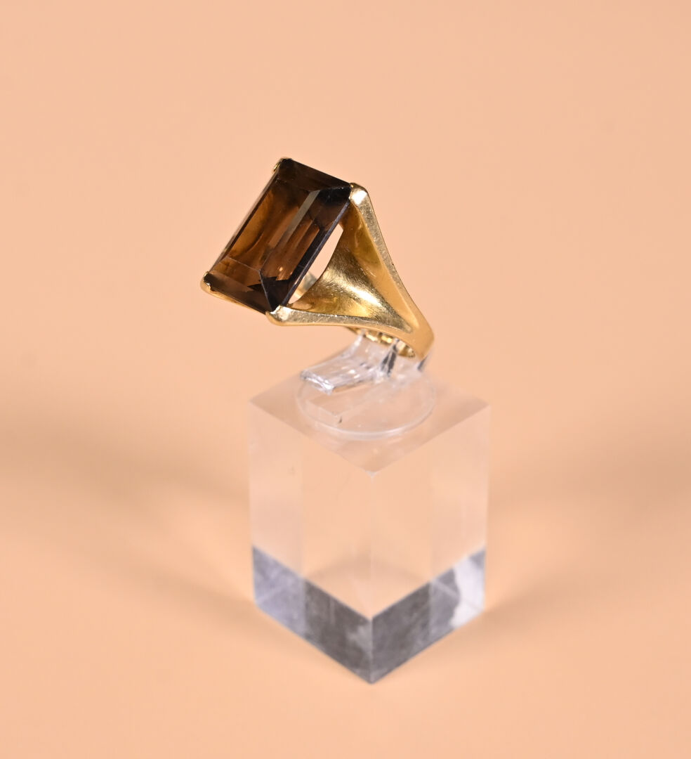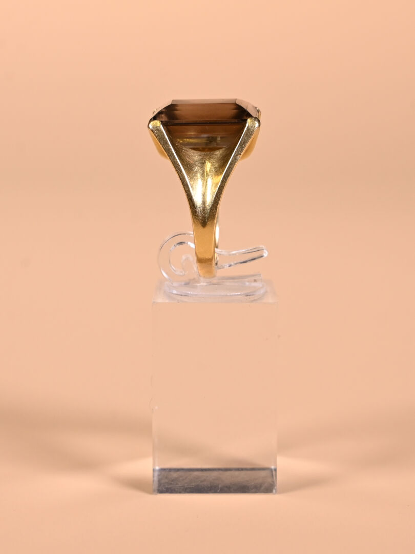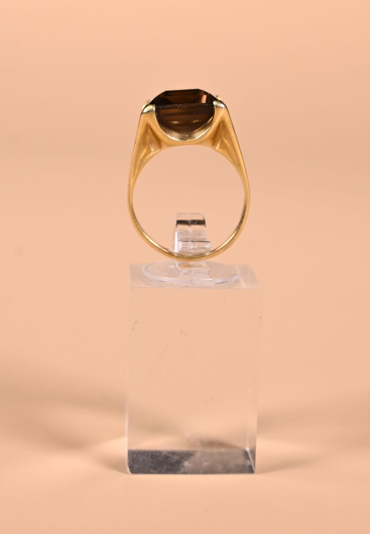 Bague en or jaune 18K 750/1000e et quartz fumé rectangle. TDD 55. Poids brut : 9,7 g.