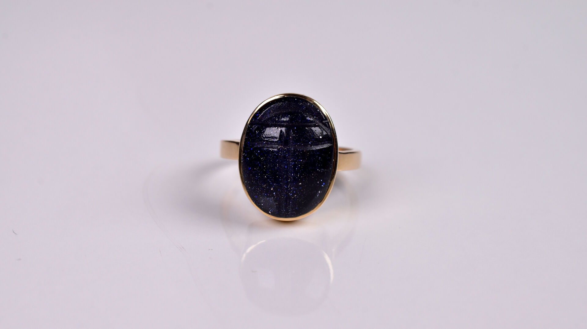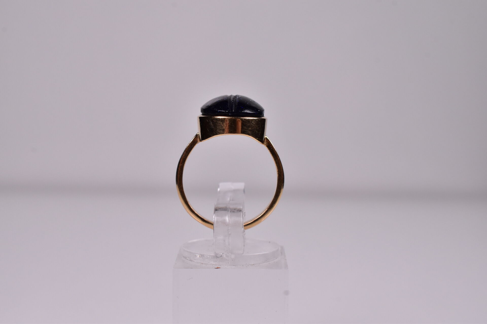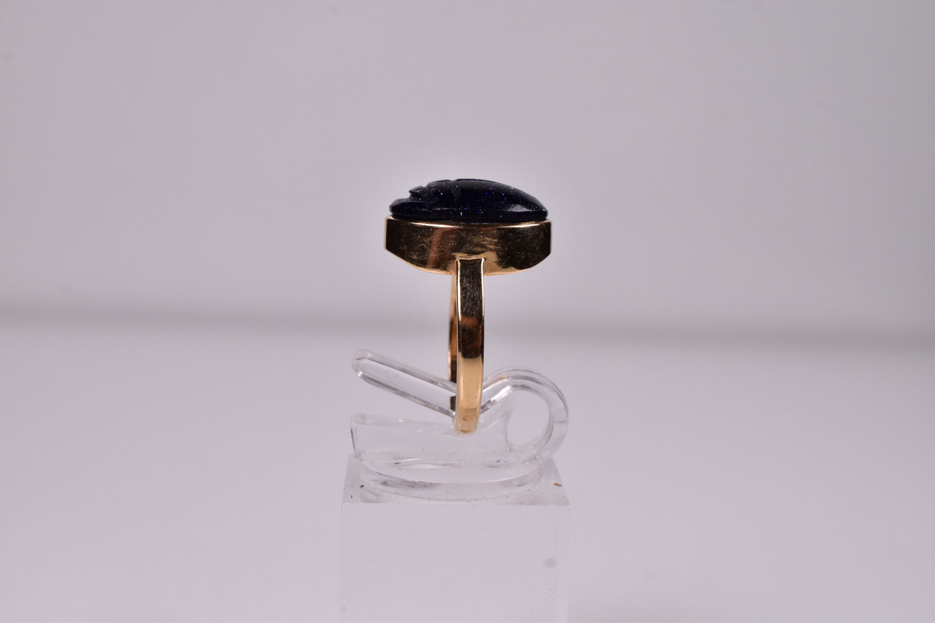 Bague en or jaune 18K 750/1000e et son scarabée en pierre synthétique bleu pailleté. TDD. : 52. Poids brut. : 5,3 g.