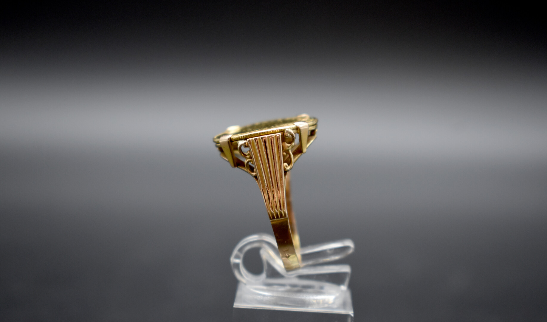 Bague en or jaune 18K 750/1000e, le chaton orné d’une pièce de 10 francs or au coq. TDD : 65. Poids : 7,35 g.