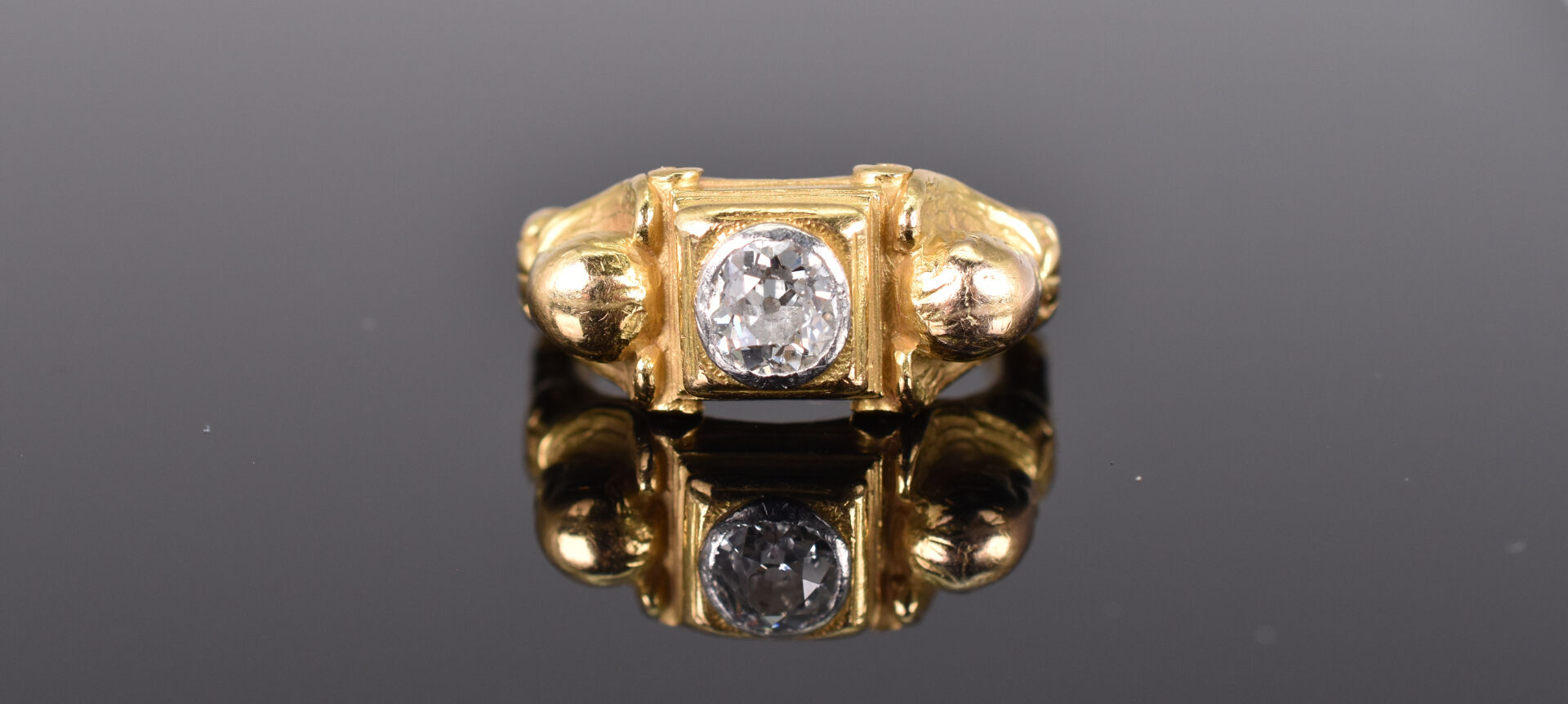 Bague en or jaune 18K 750/1000e ornée d’un diamant de taille ancienne d’environ 0,65/0,70 carat, avec de part et d’autre des séraphins. TDD. : 53 Poids brut. : 11,90 g.
