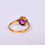 Bague en or jaune 18K 750/1000e, ornée d’un saphir rose rond synthétique en serti clos épaulement à décor de feuillage en ciselure. TDD 53. Poids brut. : 2,8 g.