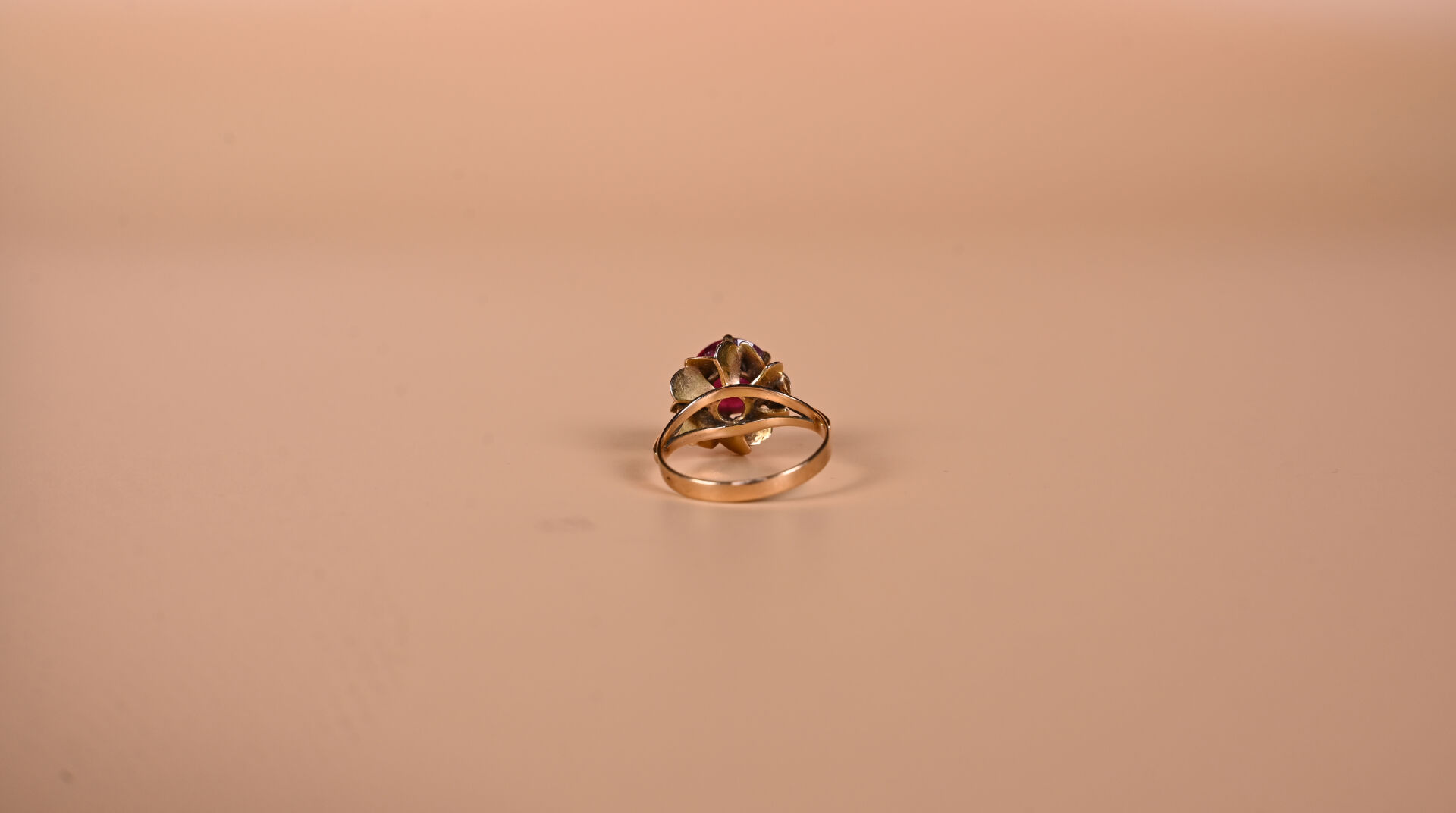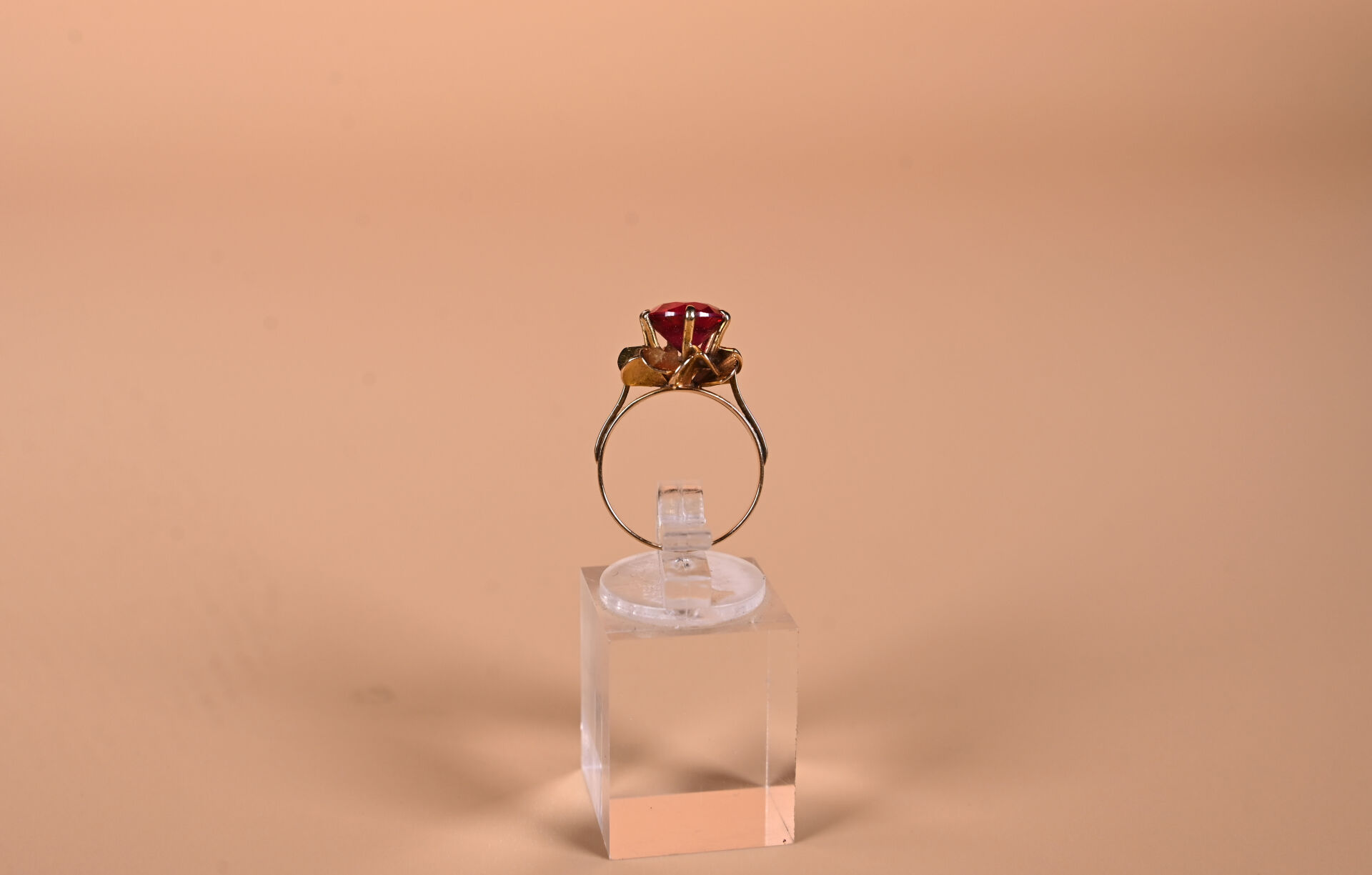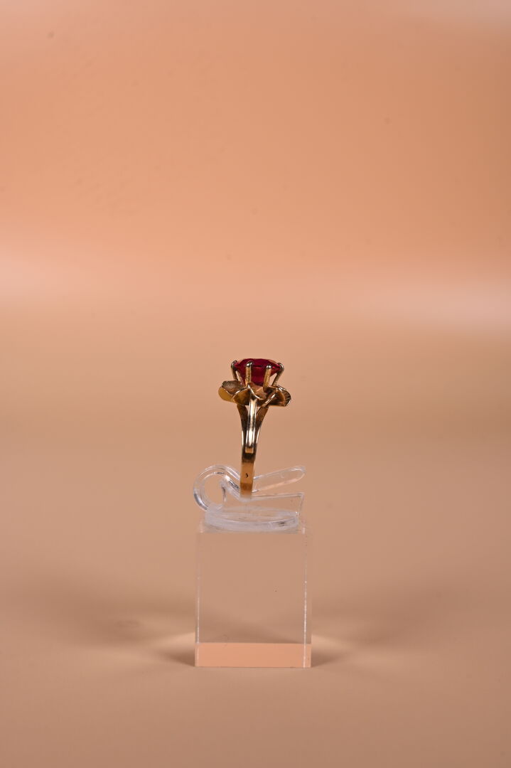 Bague en or jaune 18K 750/1000e ornée d’une pierre rouge (rubis synthétique ? ). Poids brut. : 3,73 g. Pour expertise : la fiche sera et les estimations seront actualisées prochainement.