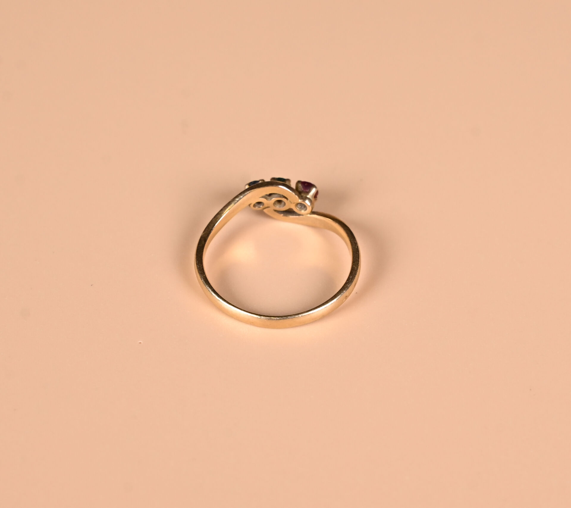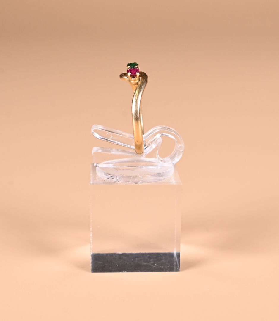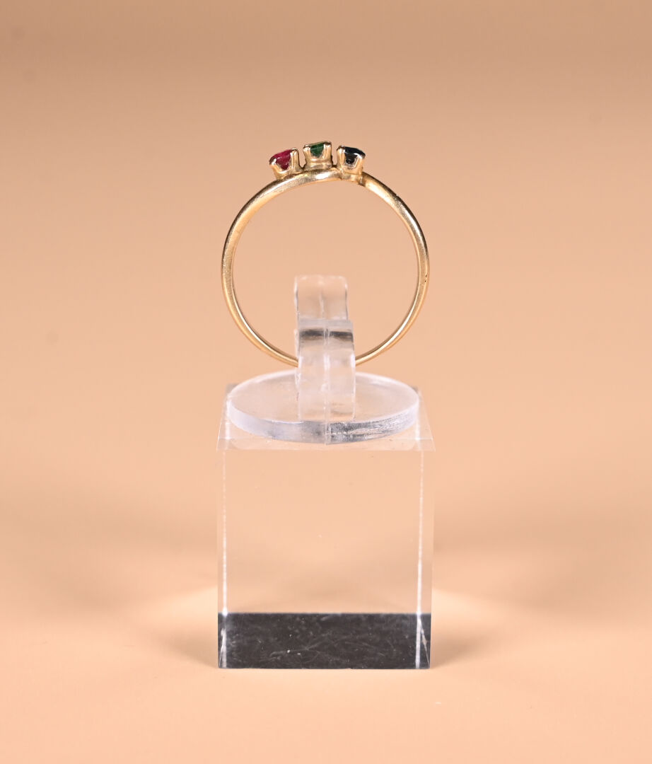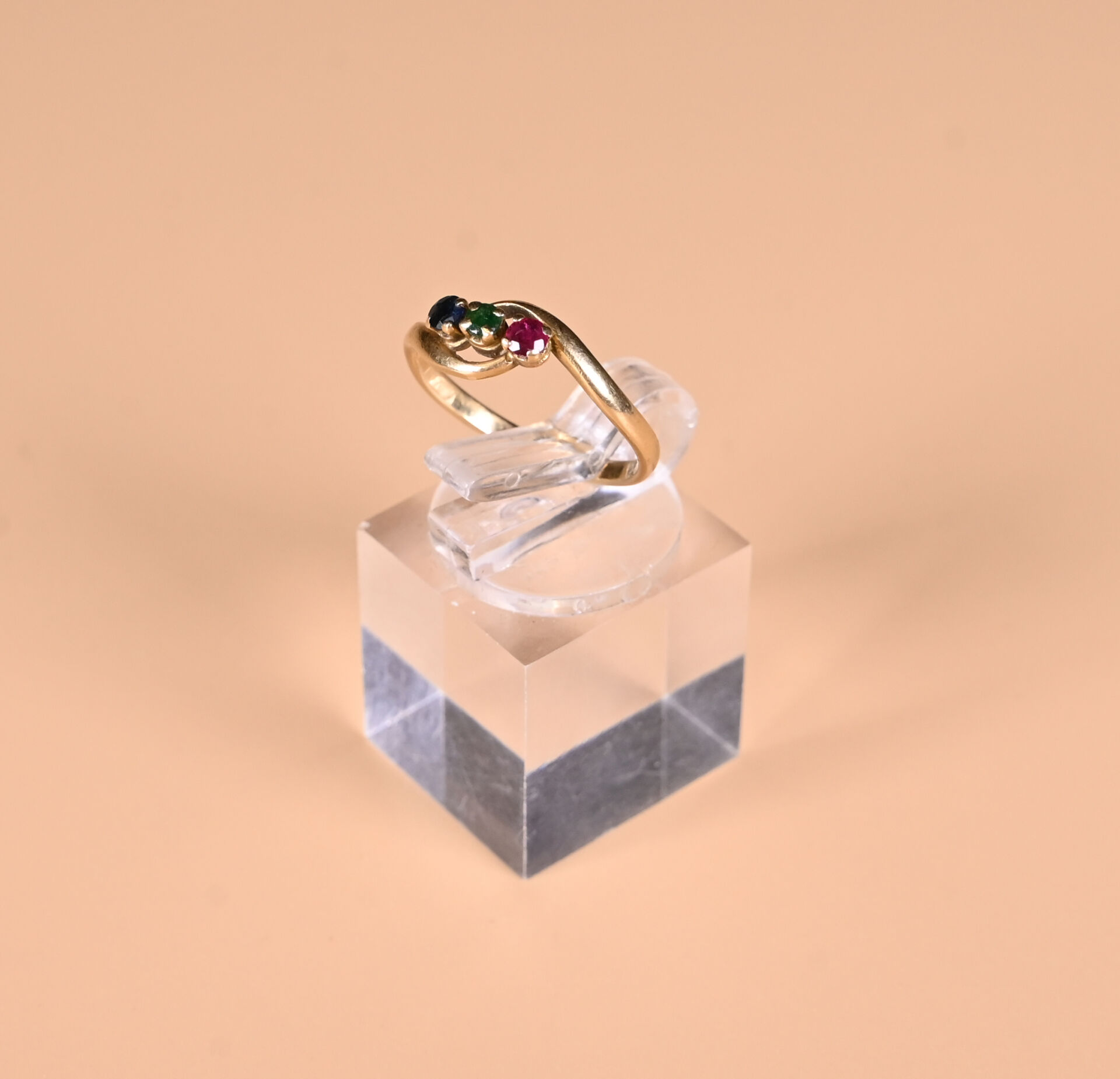 Bague en or jaune 18K 750/1000e ornée d’une trinité de pierre soit un saphir, une émeraude et un rubis. TDD. : 52. Poids brut. : 2,01 g.