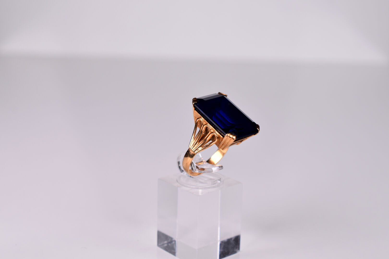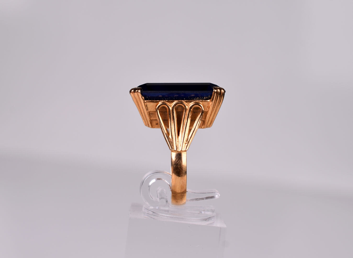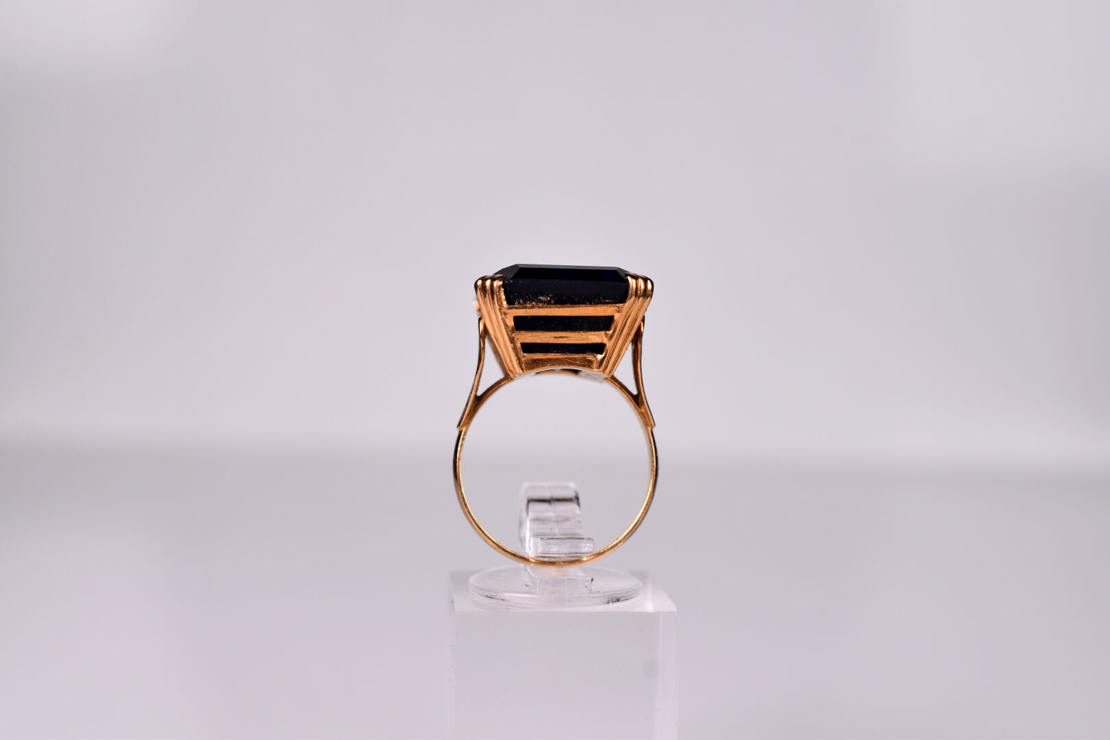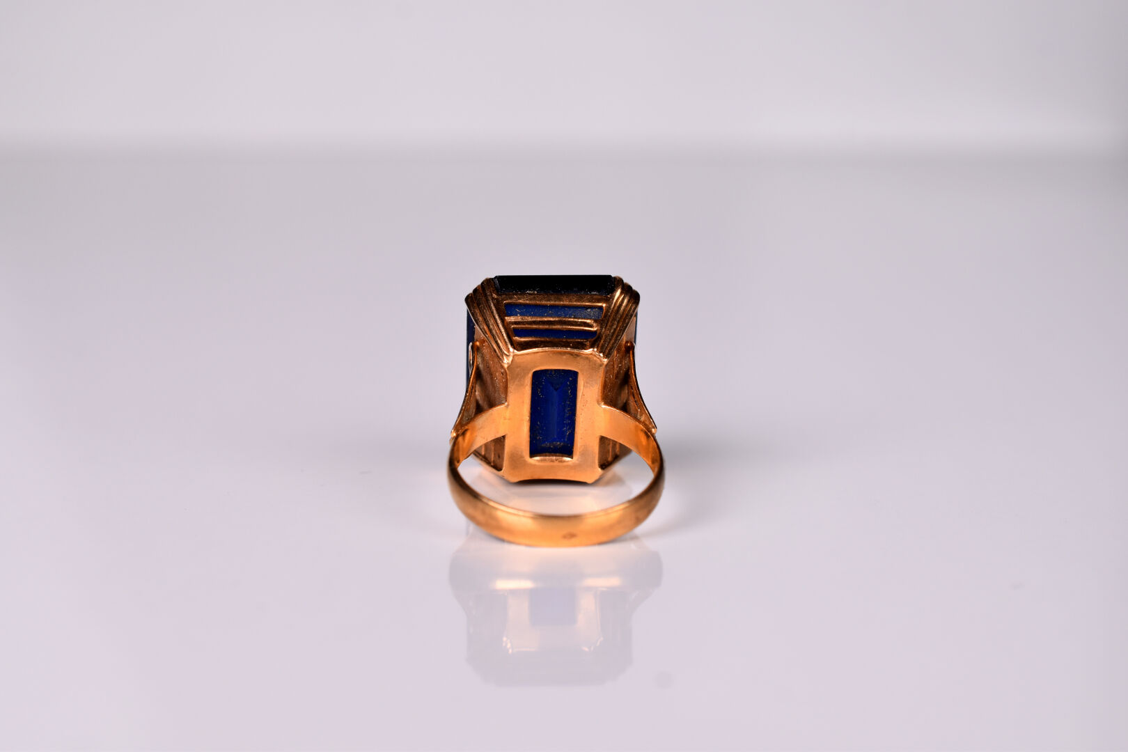 Bague en or jaune 18K 750/1000e sertie d’un important verre bleu. TDD 53. Poids brut. : 9,4 g.
