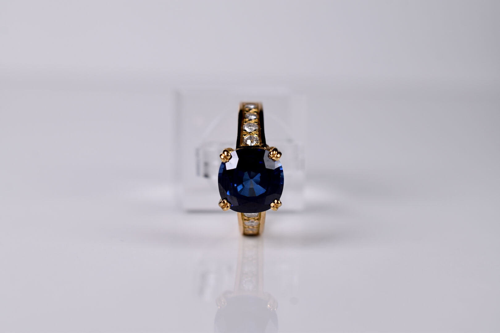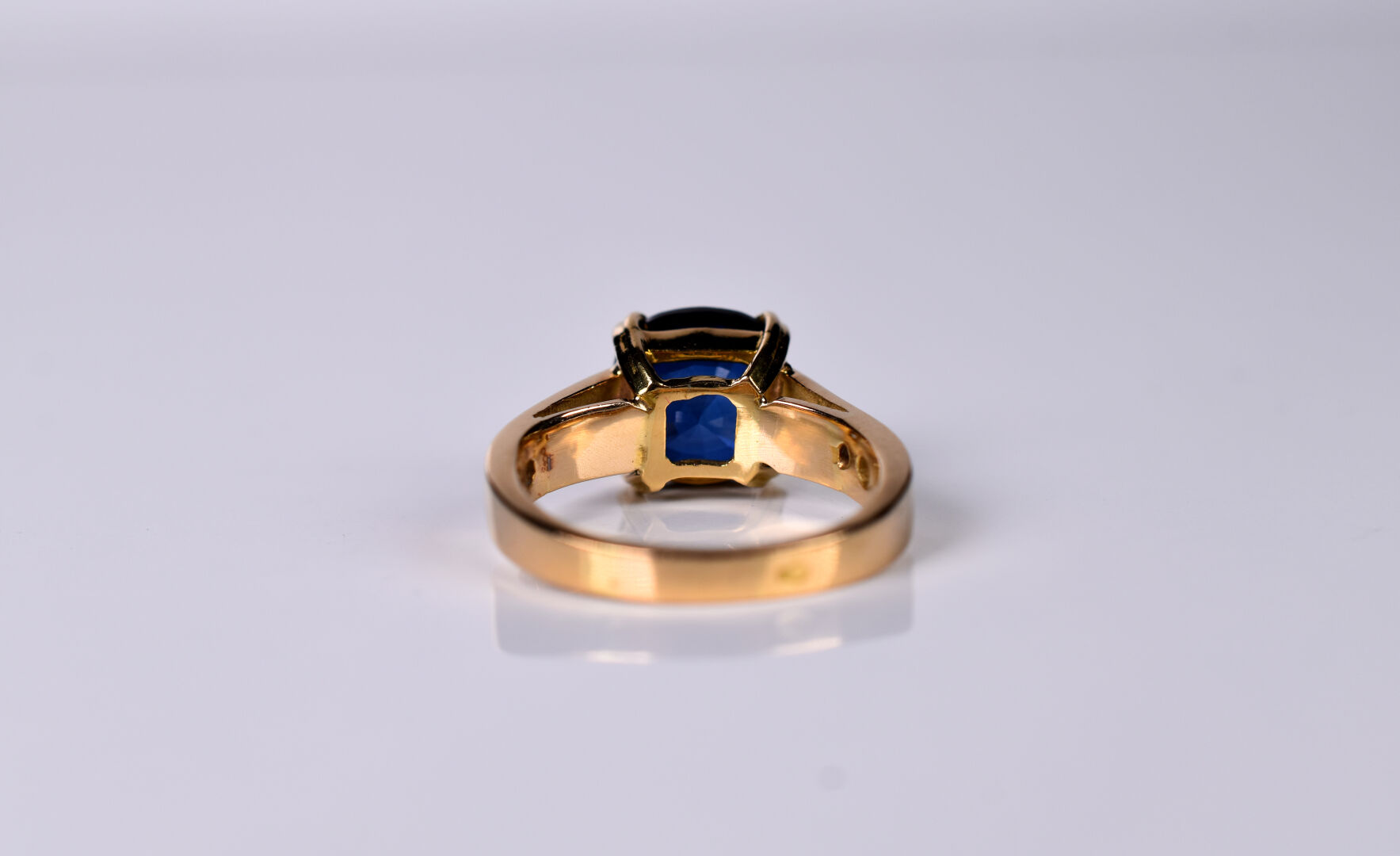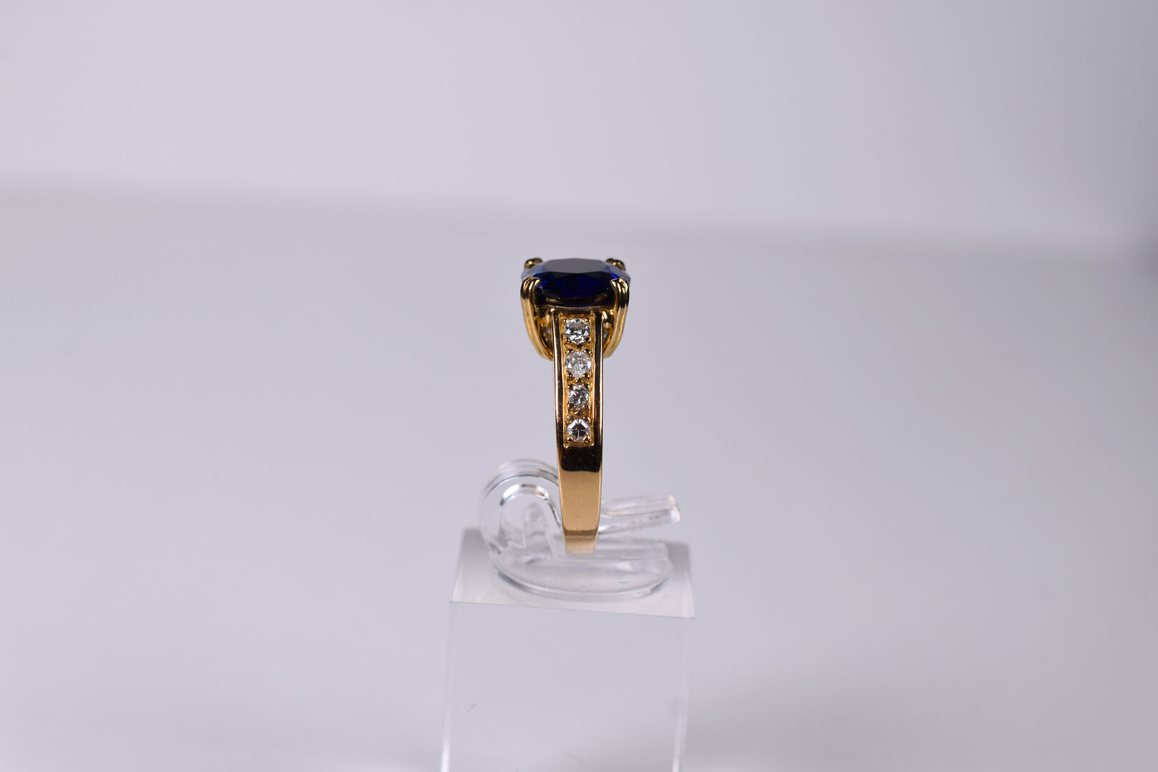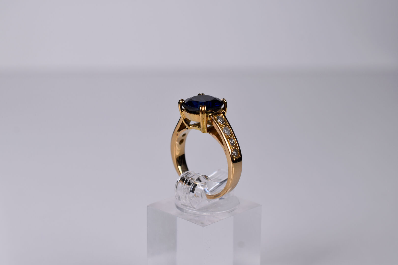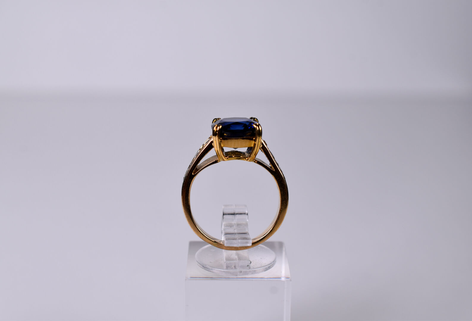 Bague en or jaune 18K 750/1000e sertie d’un saphir synthétique coussin en taille mixte sur un épaulement de 8 petits diamants taille moderne. TDD. : 52. Poids brut. : 5,9 g.