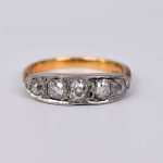 Bague en or jaune et gris 18K 750/1000e ornée d’un rang de diamants de taille ancienne, le plus important d’environ 0,20 carat deux autres d’environ 0.15 carat. TDD. 53. Poids brut : 3,50g.