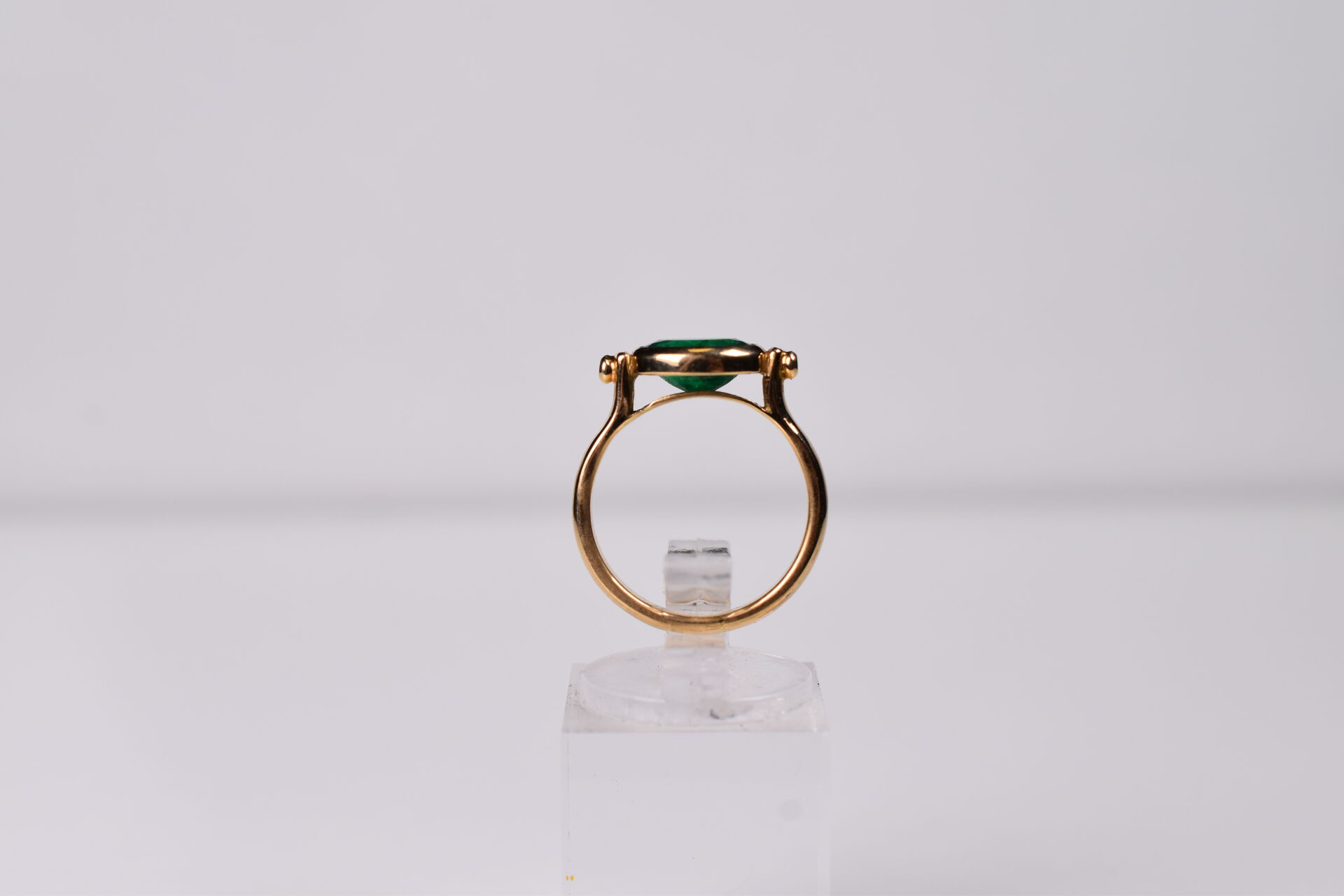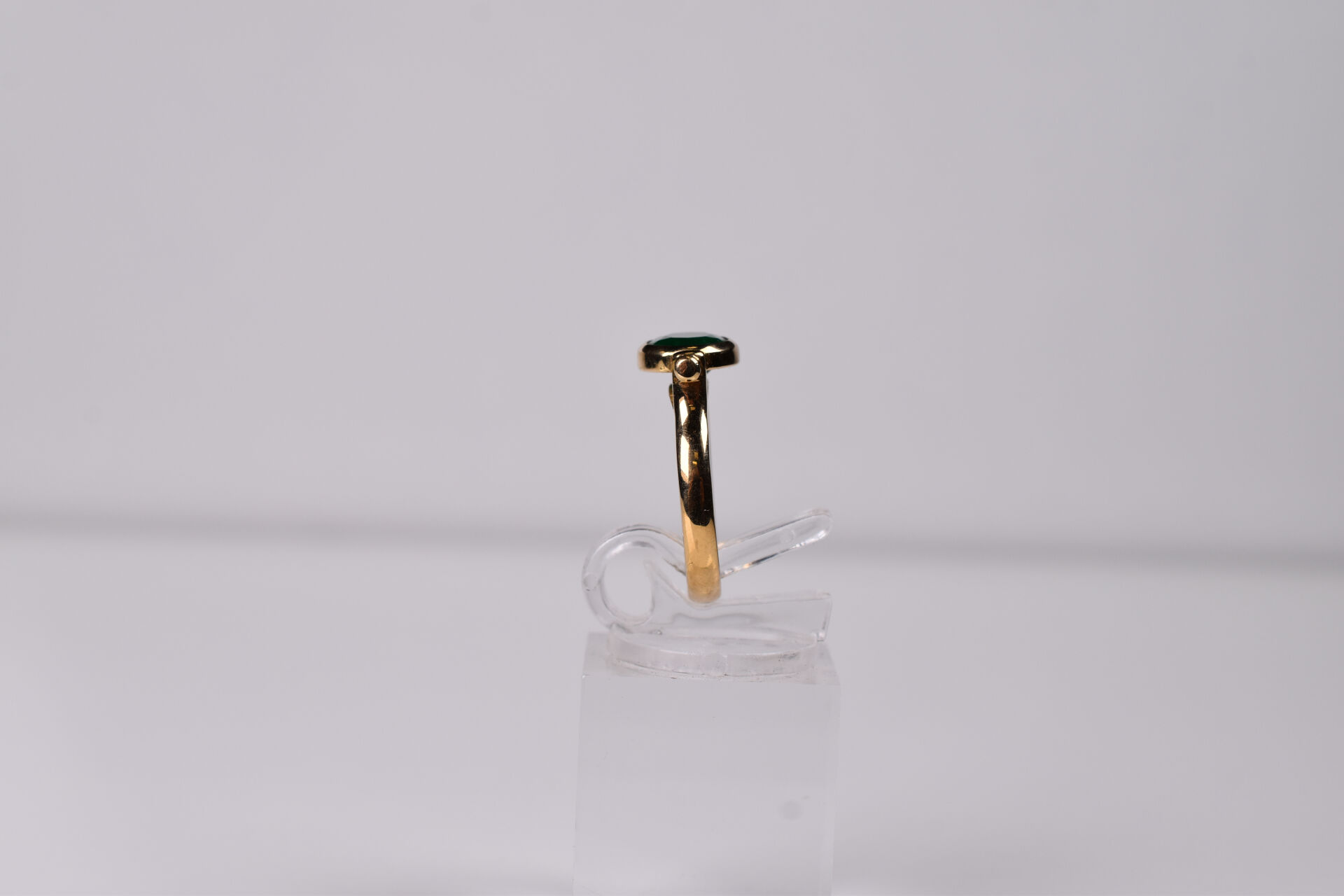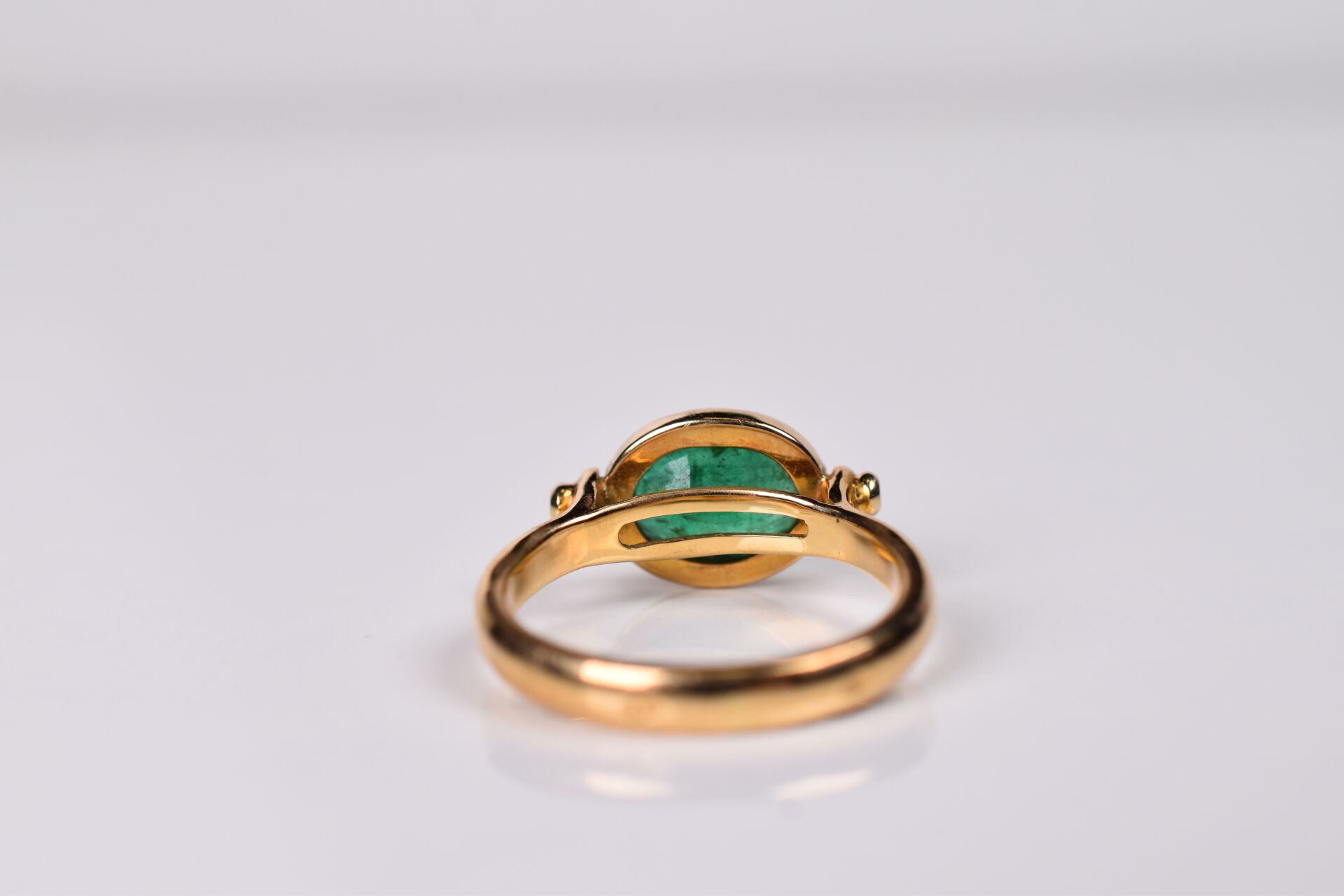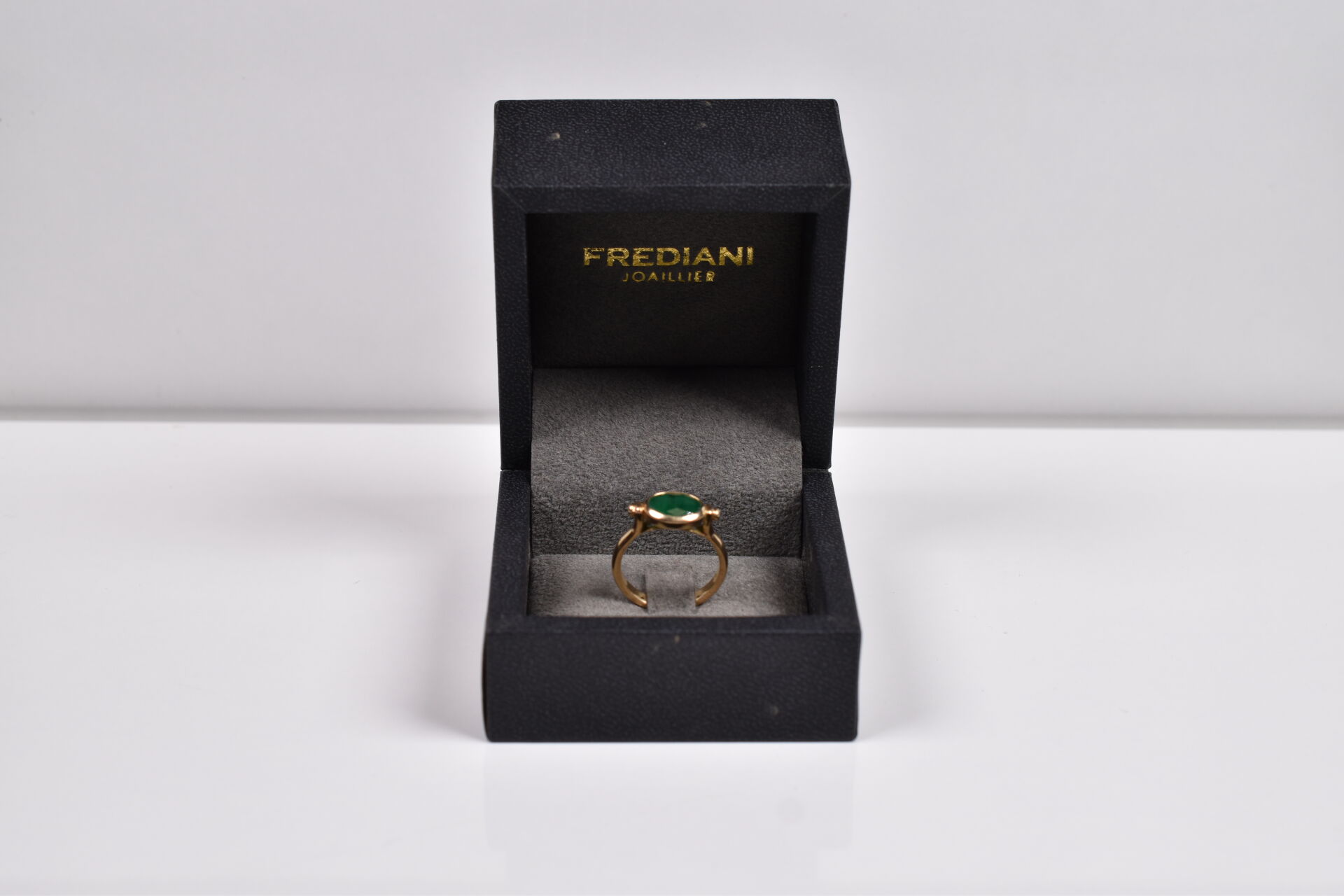 Bague en or jaune18K 750/1000e centrée d’une émeraude ovale d’environ 1,58 carat dans un serti clos. TDD. : 52. Poids brut. : 4,6 g. Travail du joaillier FREDIANI (valeur d’achat 3 560 euros). Ecrin d’origine.