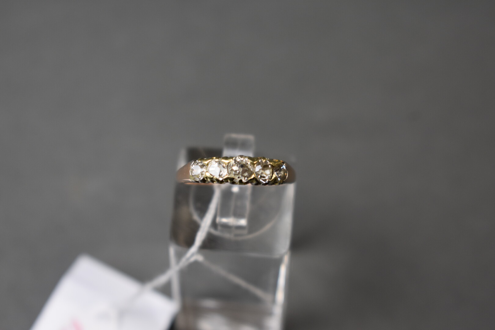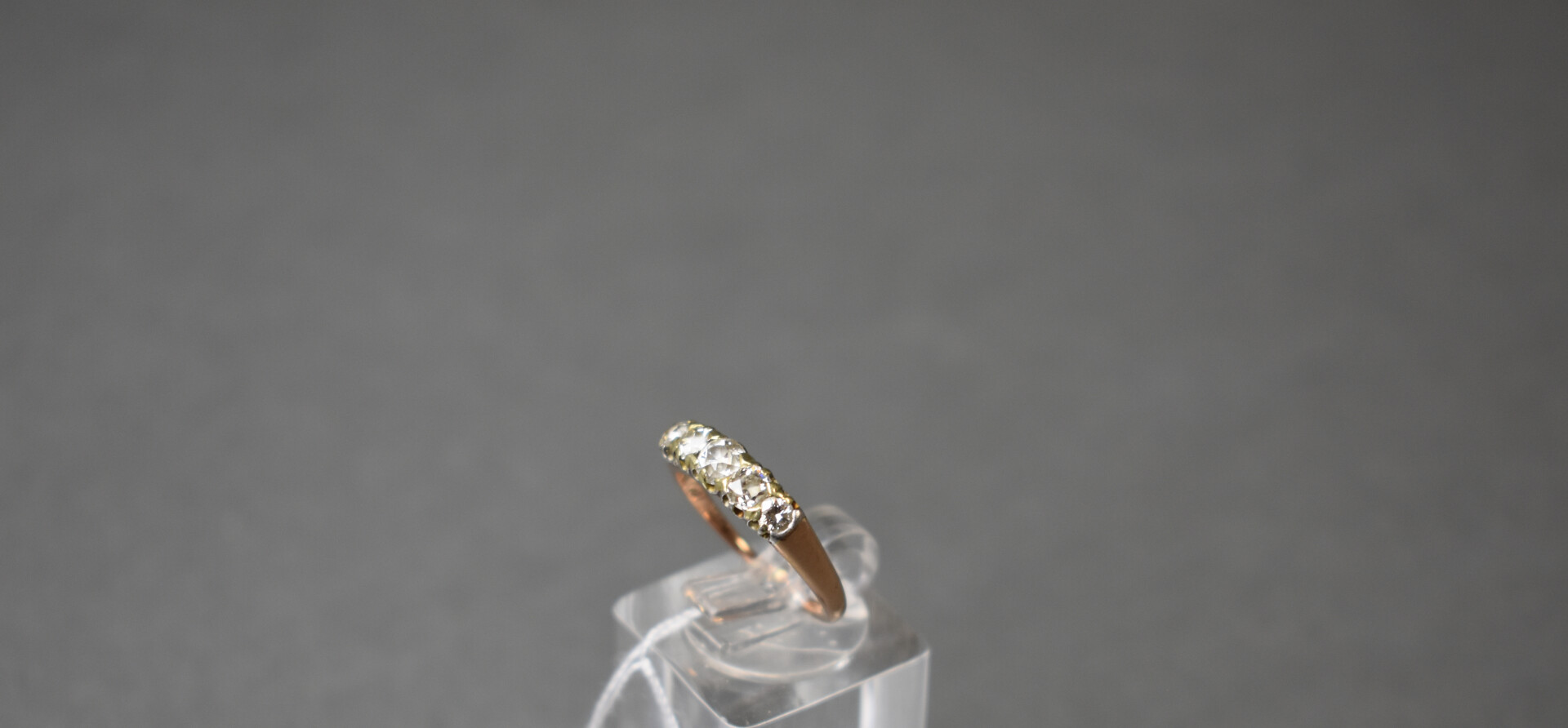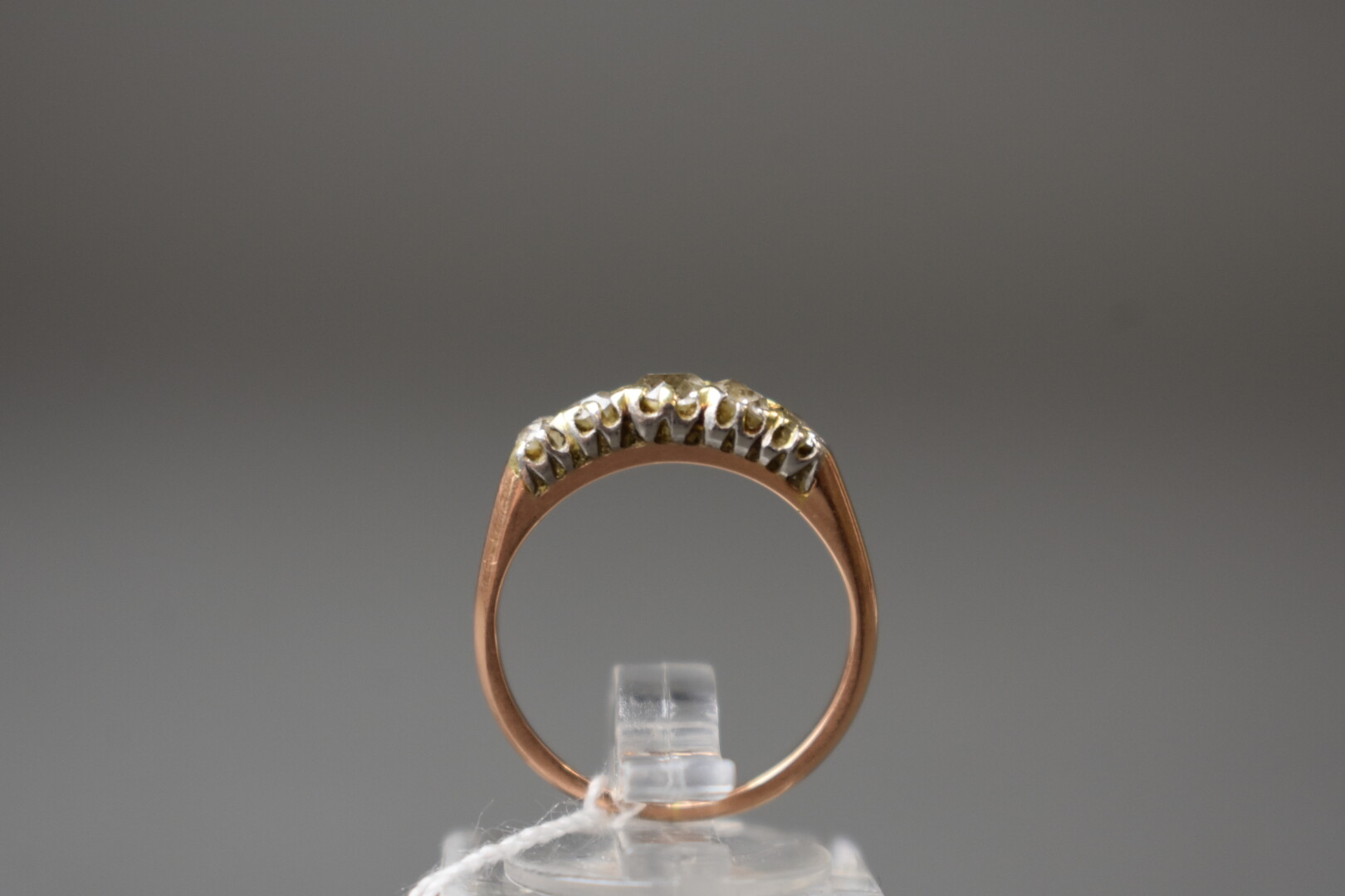 Bague en or rose 18K 750/1000e ornée de 5 diamants de taille ancienne, le plus gros d’environ 0,15 carat. TDD : 50. Poids brut : 2,70 g.