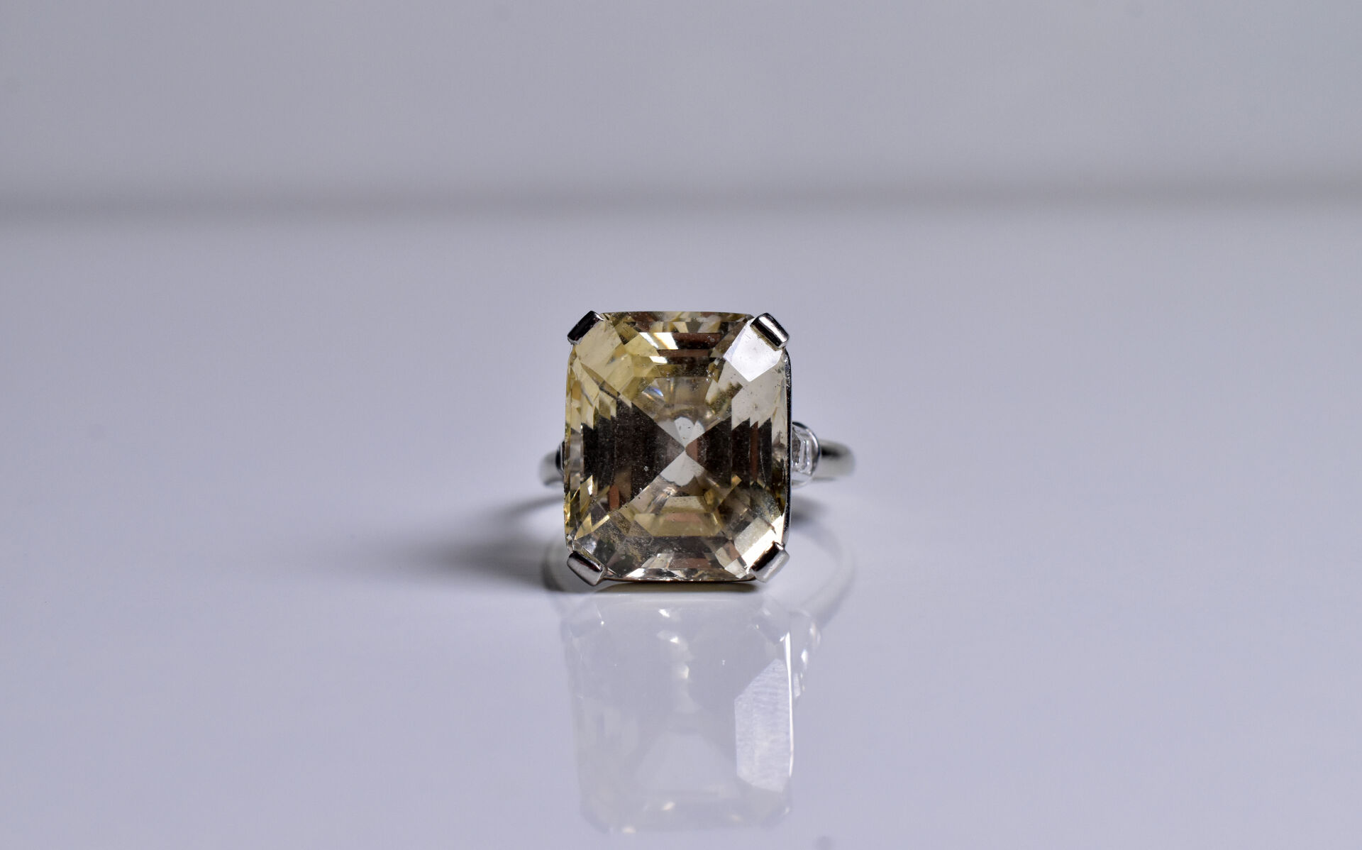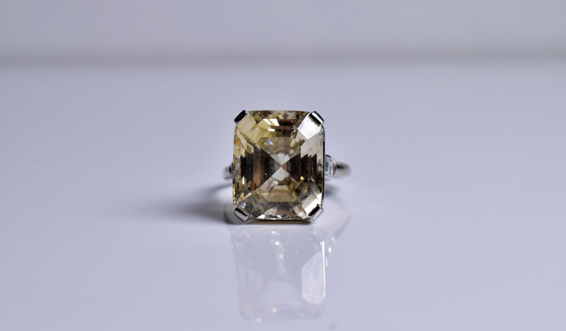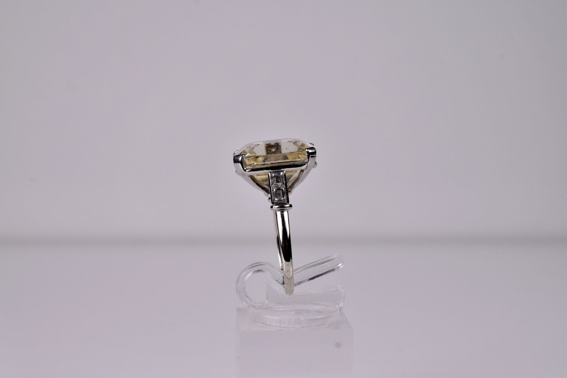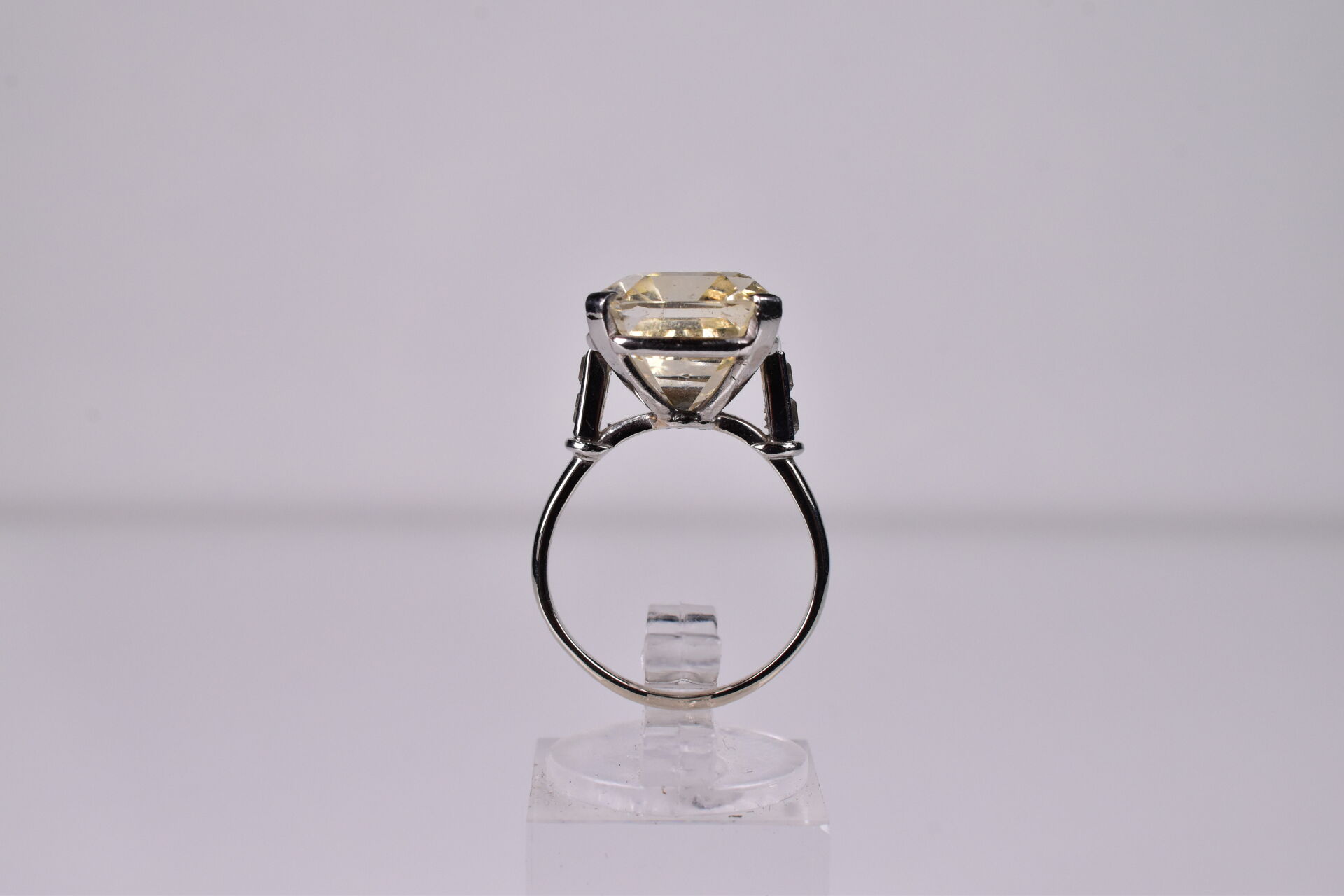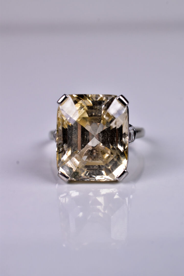Bague en platine 950/1000e ornée d’un important saphir jaune taille émeraude d’environ 18,80 carats épaulé de 4 diamants baguette d’environ 0,15 carat chacun. Qualité estimée du saphir : probablement non chauffé, couleur jaune pale. Dimensions : 15,5 x 12,7 x 10 mm environ. TDD. : 55. Poids brut. : 9,3 g.