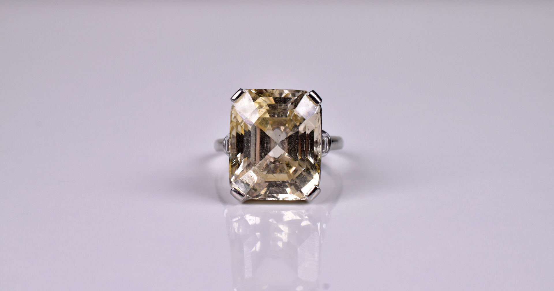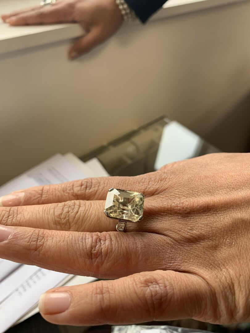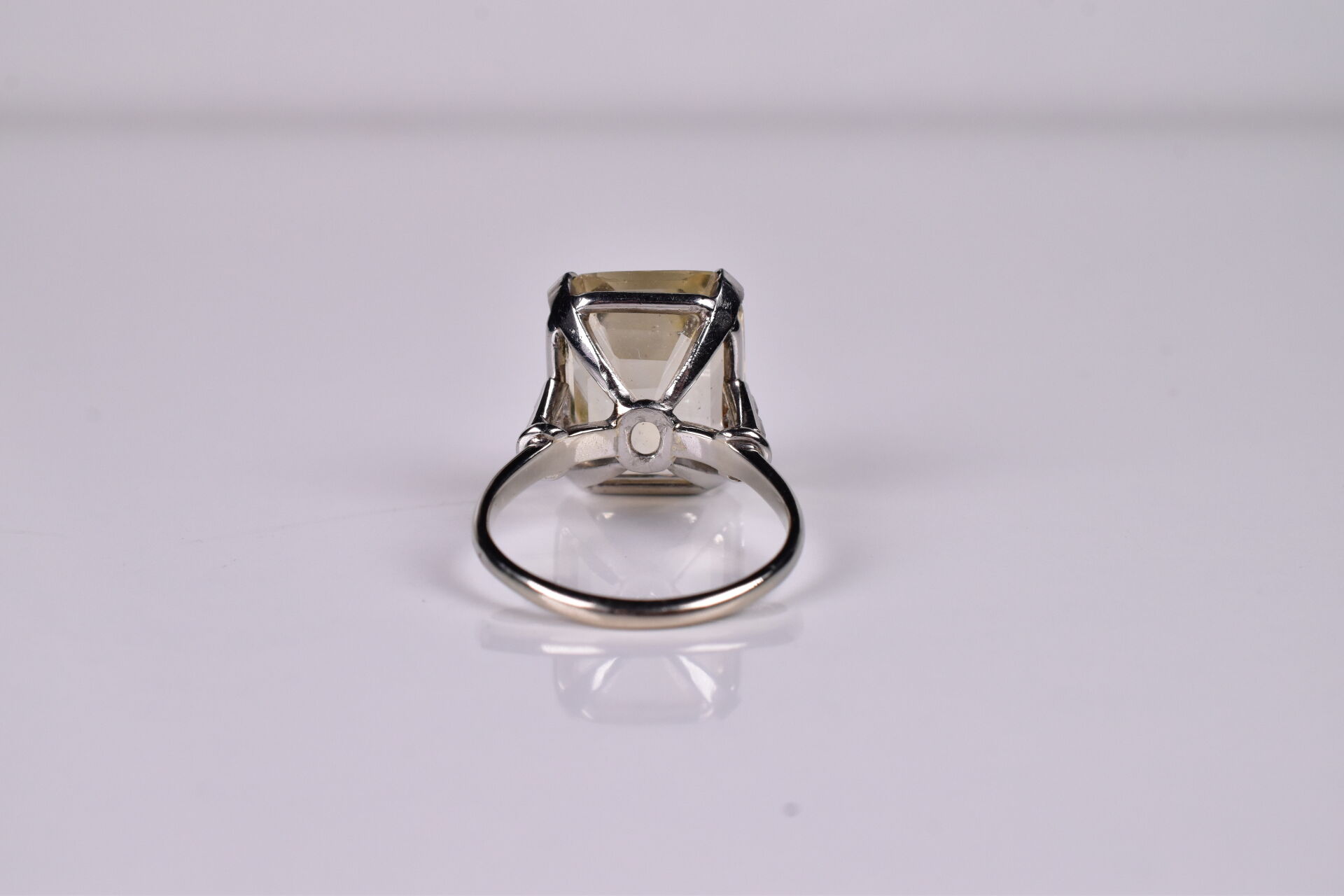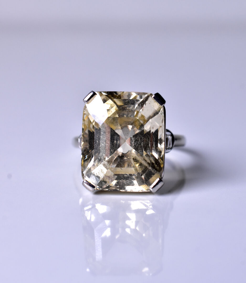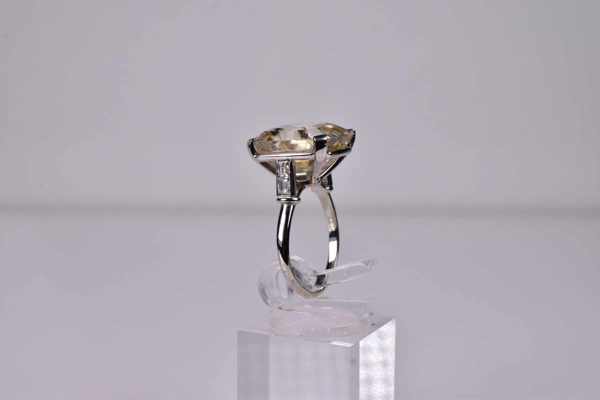 Bague en platine 950/1000e ornée d’un important saphir jaune taille émeraude d’environ 18,80 carats épaulé de 4 diamants baguette d’environ 0,15 carat chacun. Qualité estimée du saphir : probablement non chauffé, couleur jaune pale. Dimensions : 15,5 x 12,7 x 10 mm environ. TDD. : 55. Poids brut. : 9,3 g.