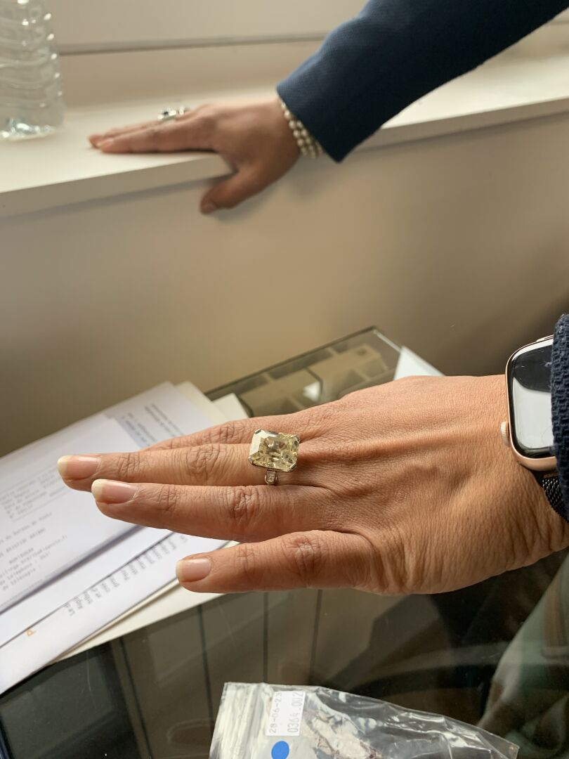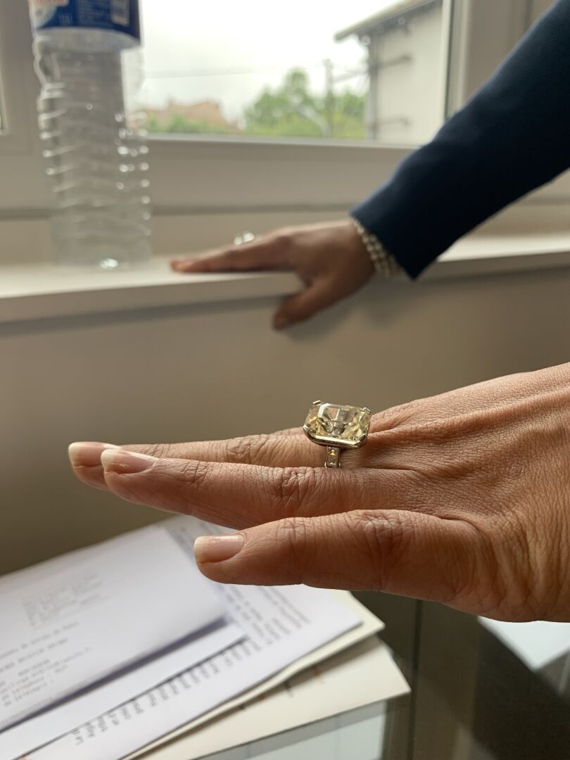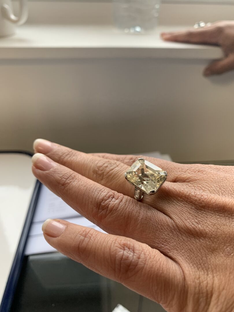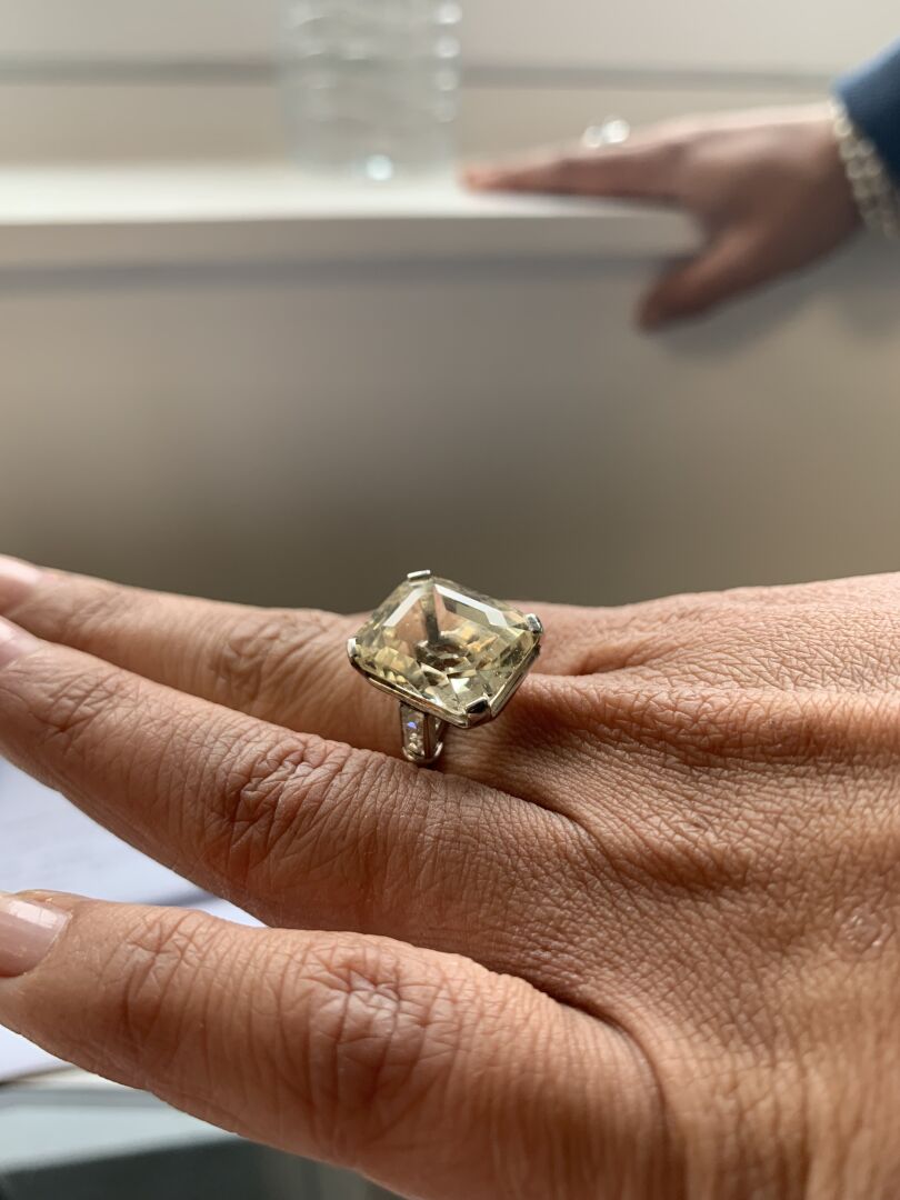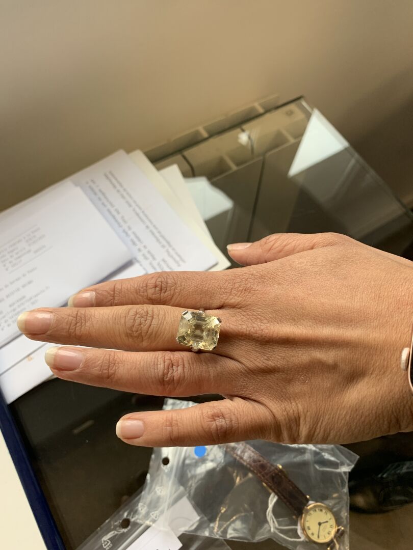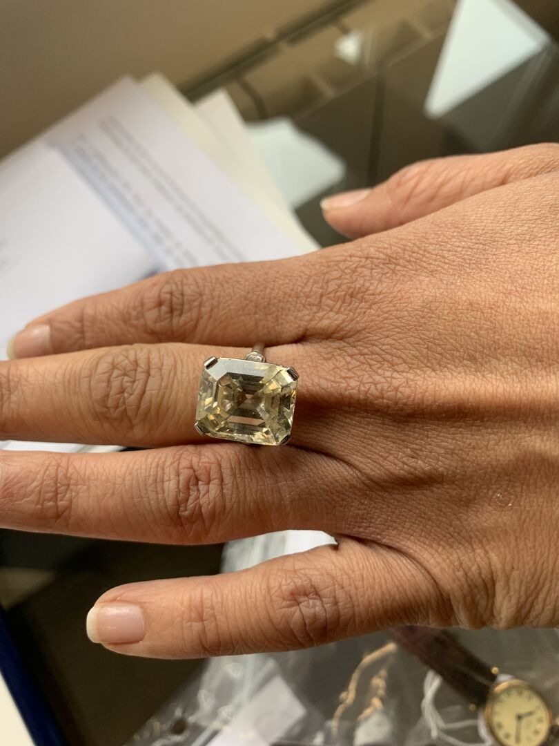 Bague en platine 950/1000e ornée d’un important saphir jaune taille émeraude d’environ 18,80 carats épaulé de 4 diamants baguette d’environ 0,15 carat chacun. Qualité estimée du saphir : probablement non chauffé, couleur jaune pale. Dimensions : 15,5 x 12,7 x 10 mm environ. TDD. : 55. Poids brut. : 9,3 g.