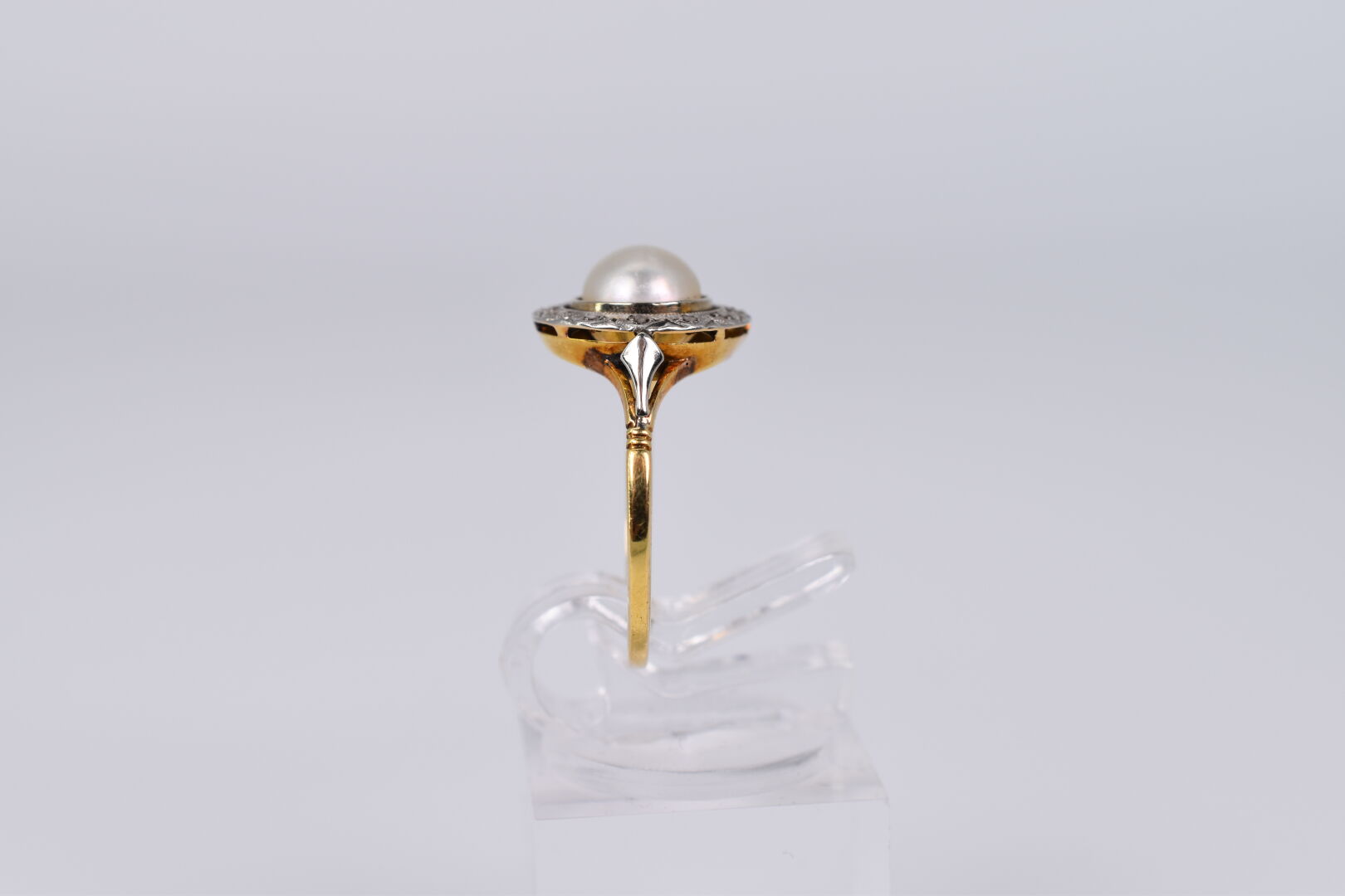 Bague fleur en or jaune et gris 18K 750/1000e, ornée en son centre d’une demi perle dans un entourage d’éclats de diamants. TDD. : 56. Poids brut : 2,94 g.