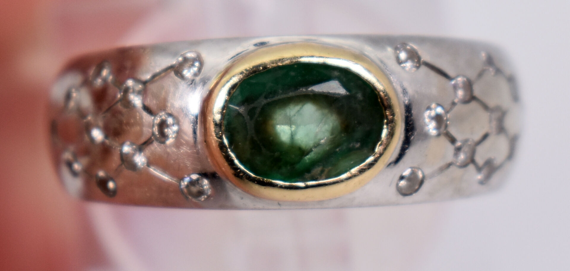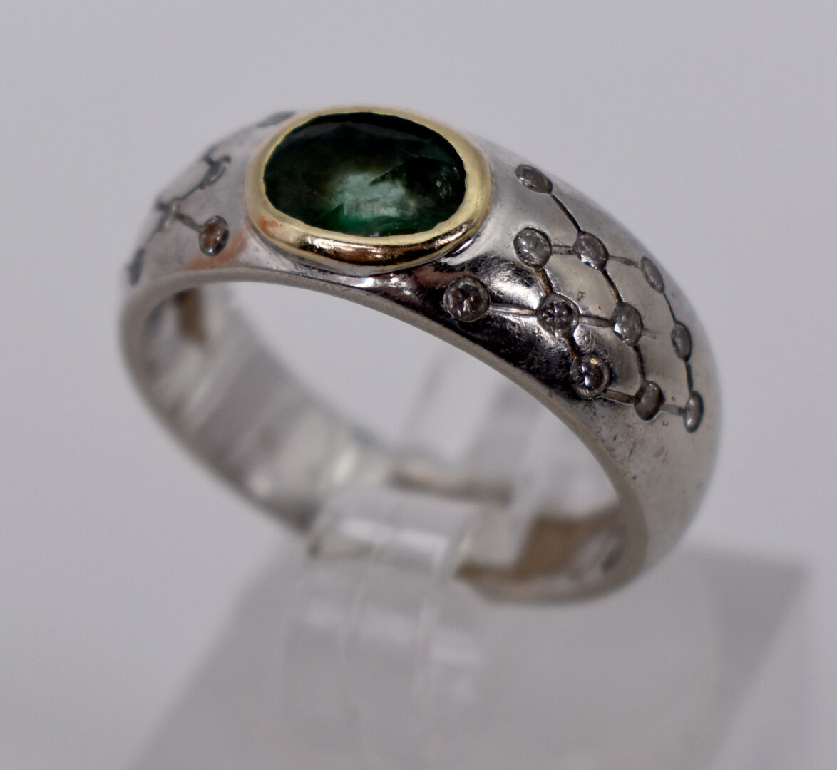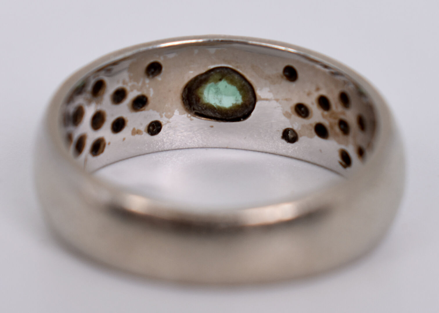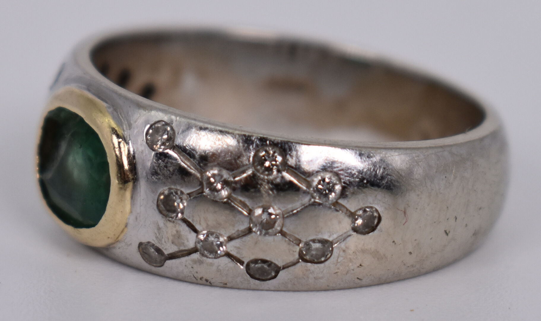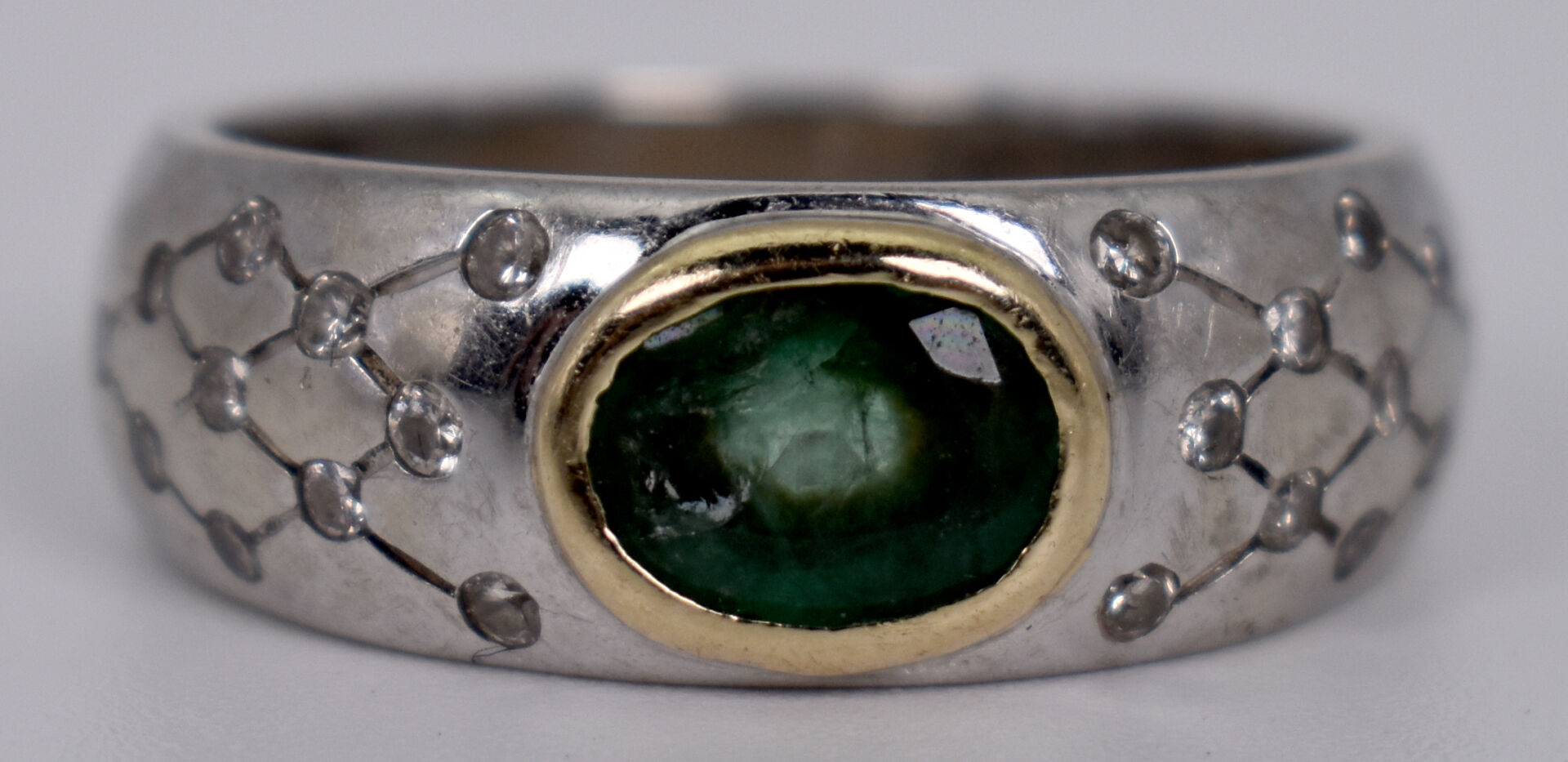 Bague jonc en or gris 9K 385/1000e sertie d’une émeraude ovale et d’éclats de pierres blanches. TDD. : 54. Poids brut : 5,80 g.