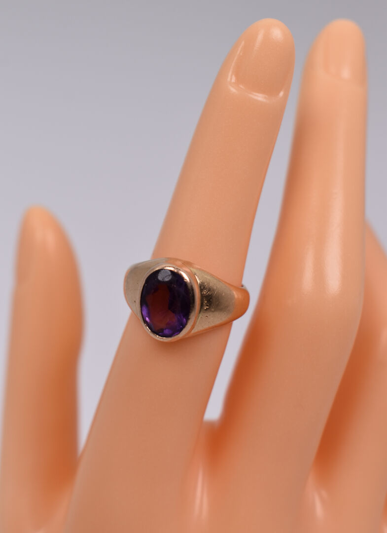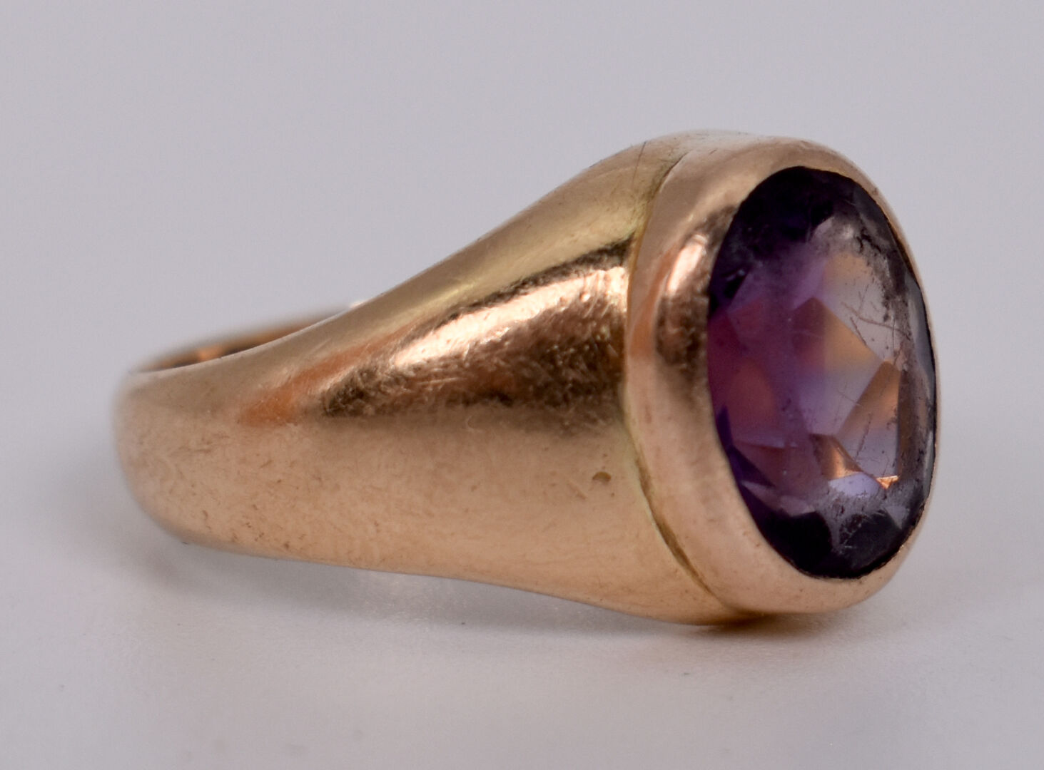 Bague jonc en or jaune 18K 750/1000e ornée d’une pierre mauve (usures). Poids brut : 8,10 g. TDD : 52-53 cm.