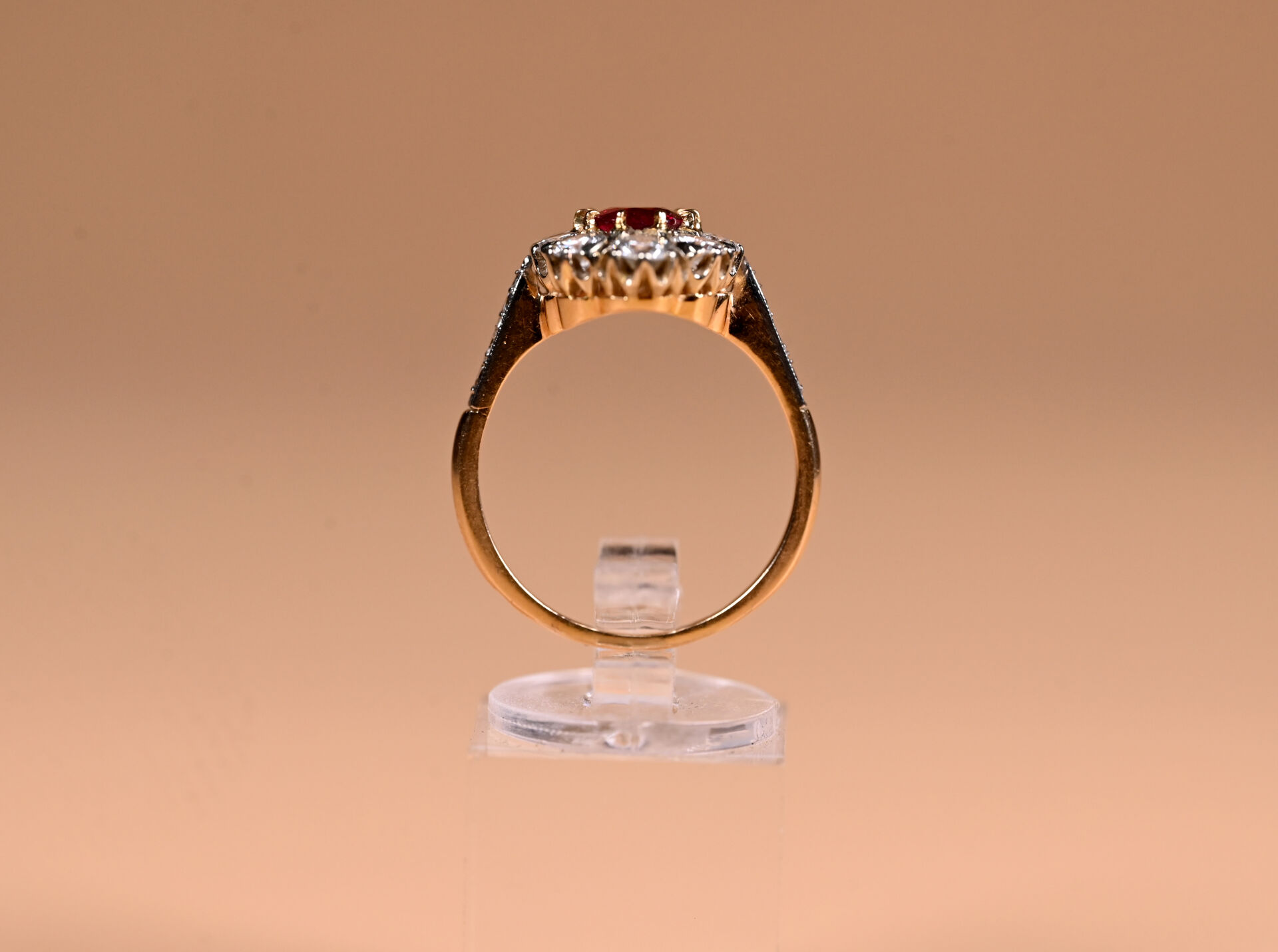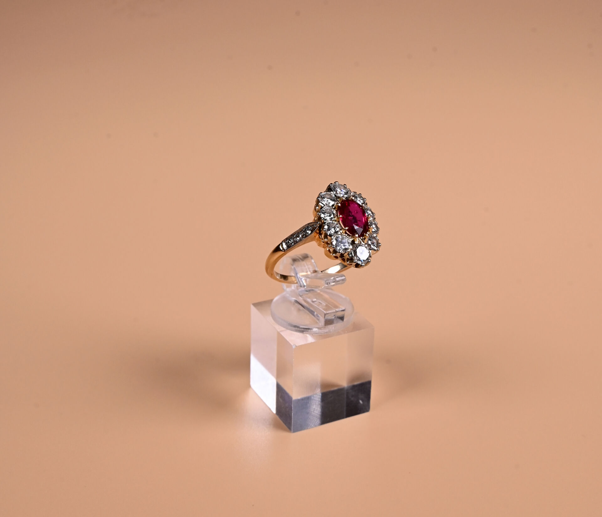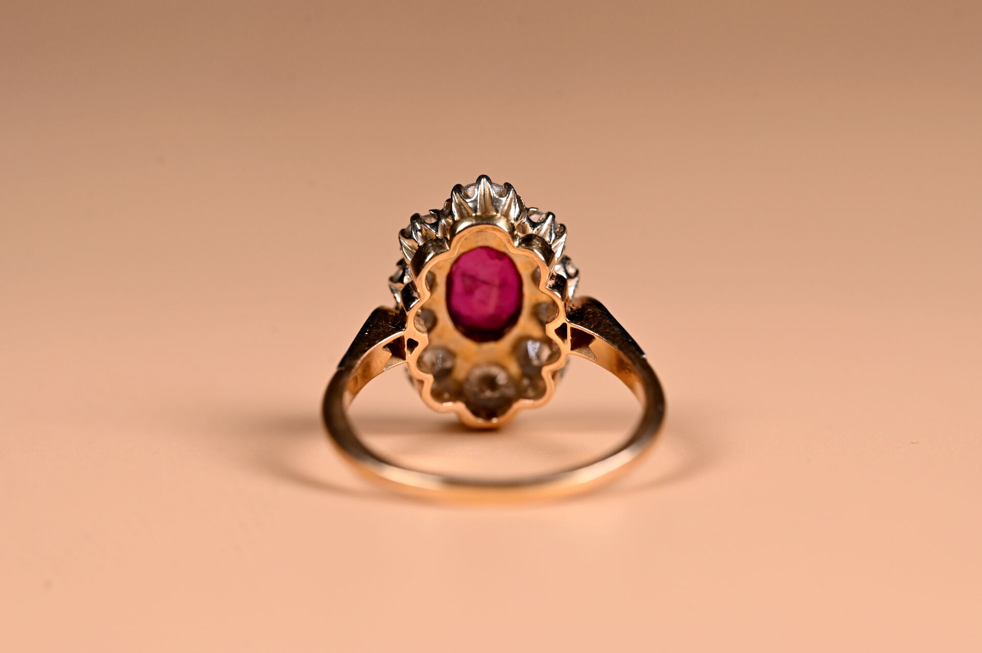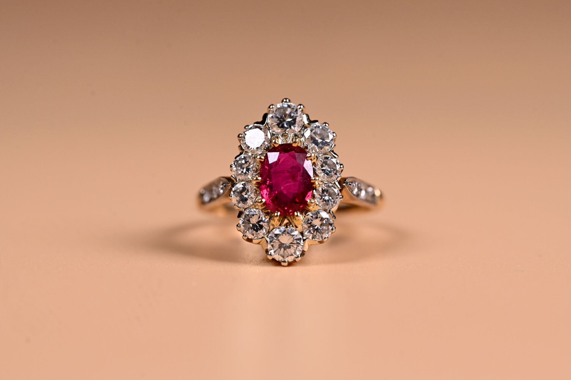 Bague marguerite en deux ors 18K 750/1000e centrée d’un rubis ovale (d’environ 2,2 carats) entouré de 10 diamants taille moderne en chute. Petits diamants sur l’épaulement. TDD. : 62. Poids brut. : 6 g.