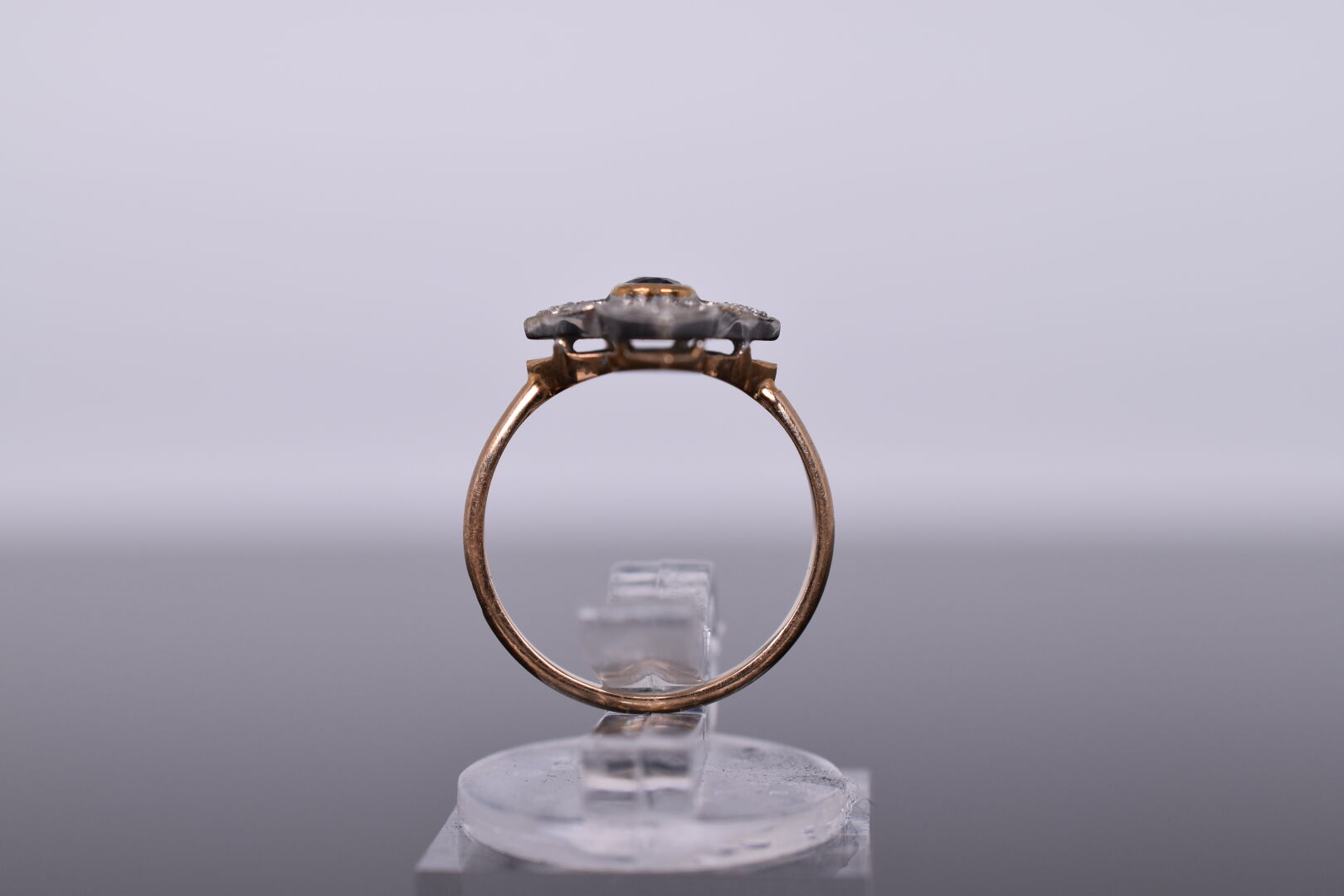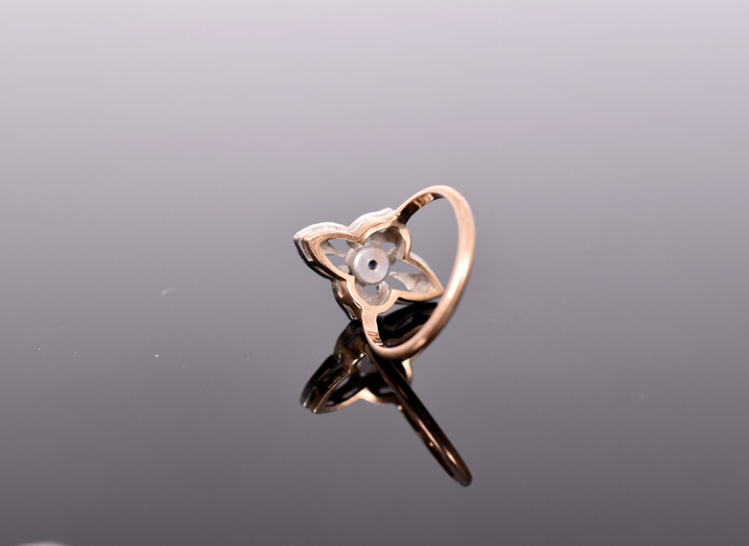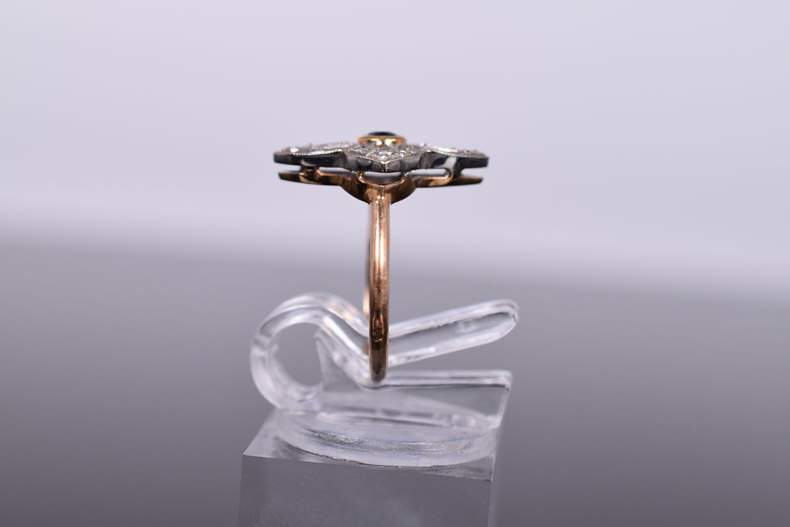 Bague marguerite en or jaune et gris 18K 750/1000e ornée en son centre d’un petit saphir et de pierres blanches. TDD 47. Poids brut : 2,34 g.