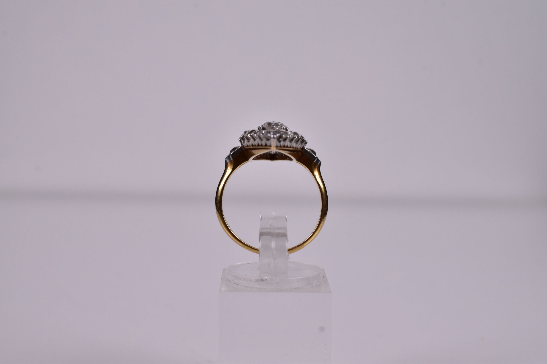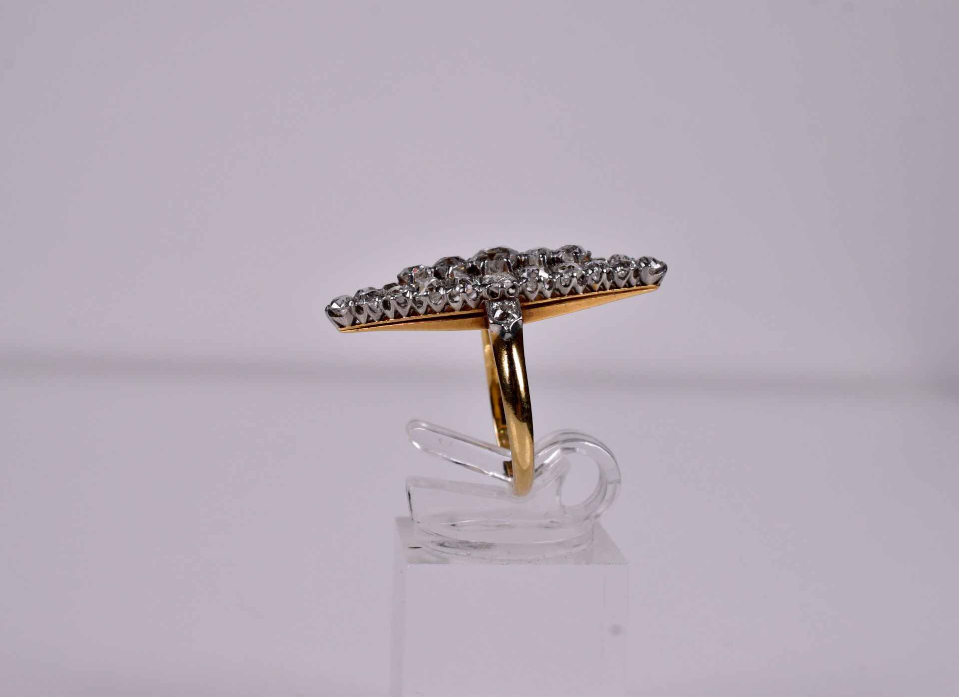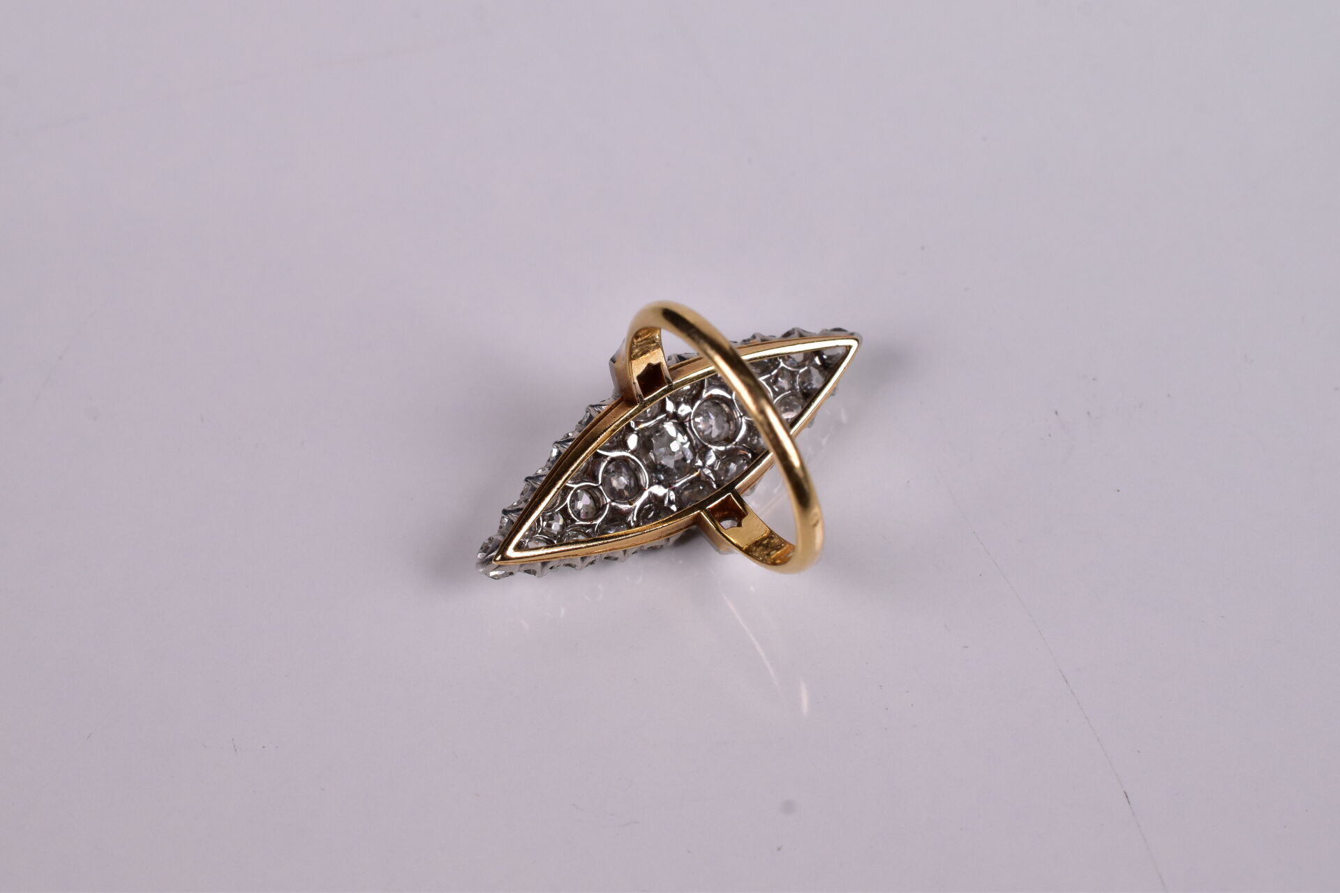 Bague marquise en jaune 18K 750/1000e, plateau orné de diamants taille ancienne, le plus important pesant 0,60 carat environ. Poids total estimé en diamants : 3,30 carats. TDD. : 55. Long. plateau : 3,5 cm. Poids brut. : 7,3 g.