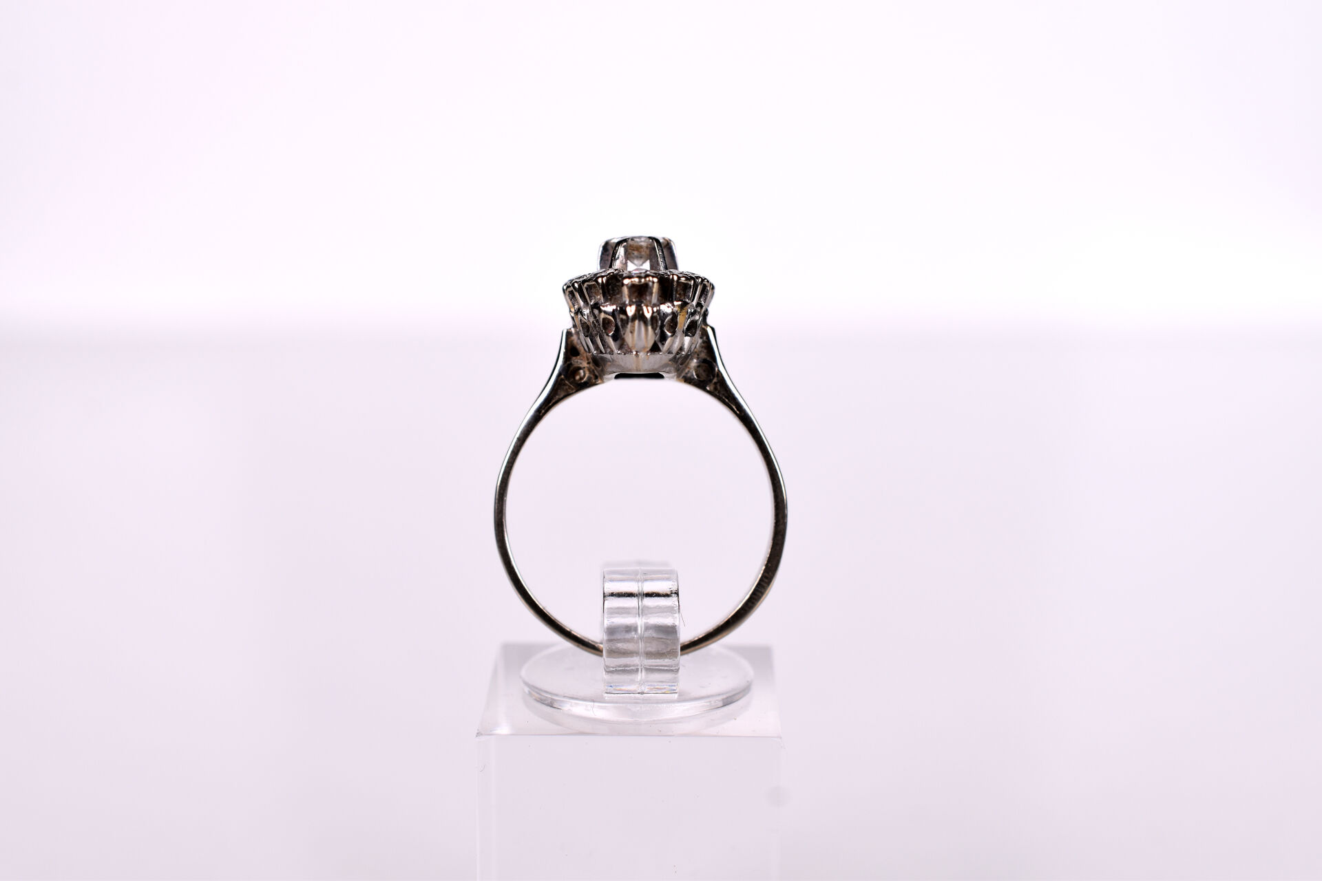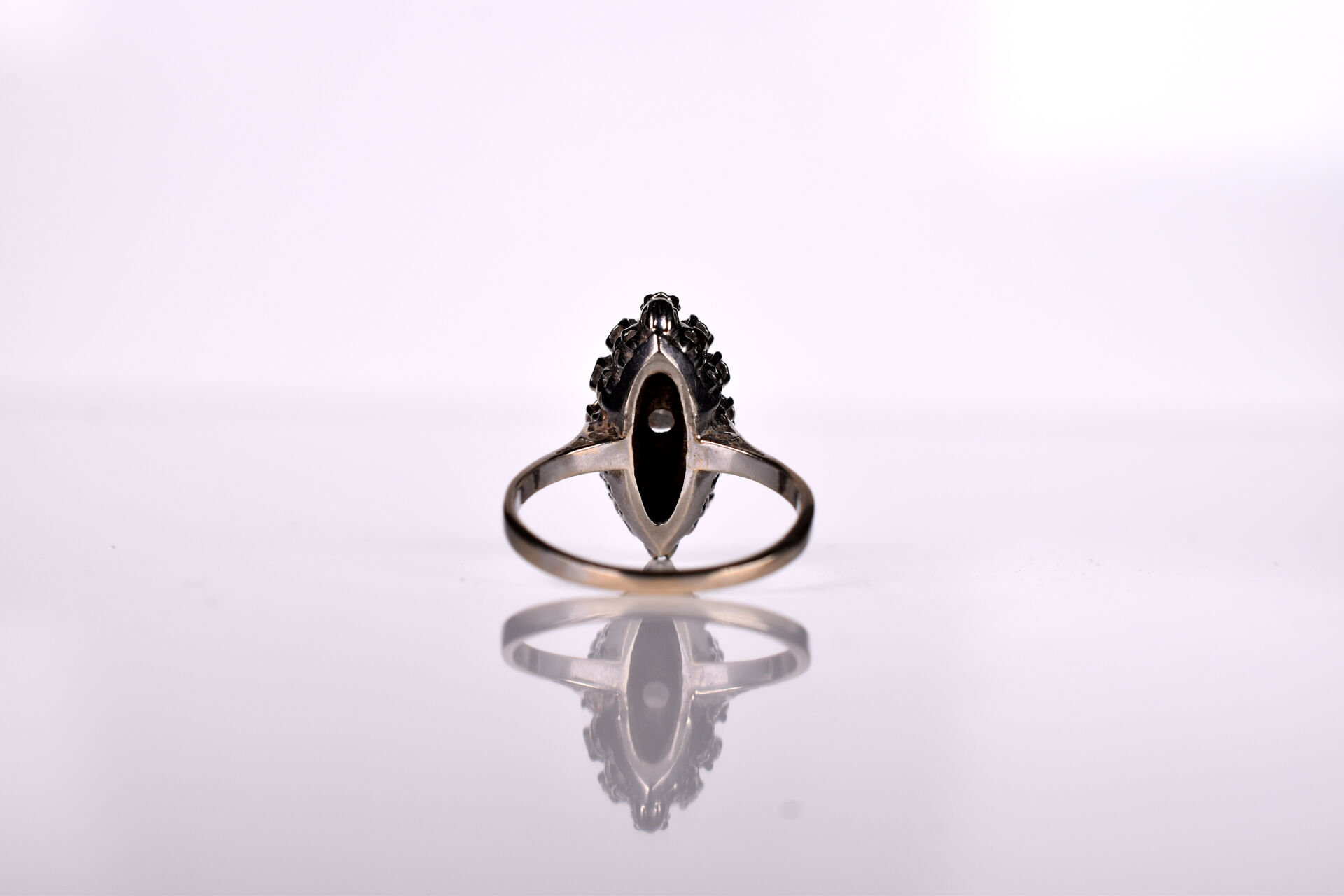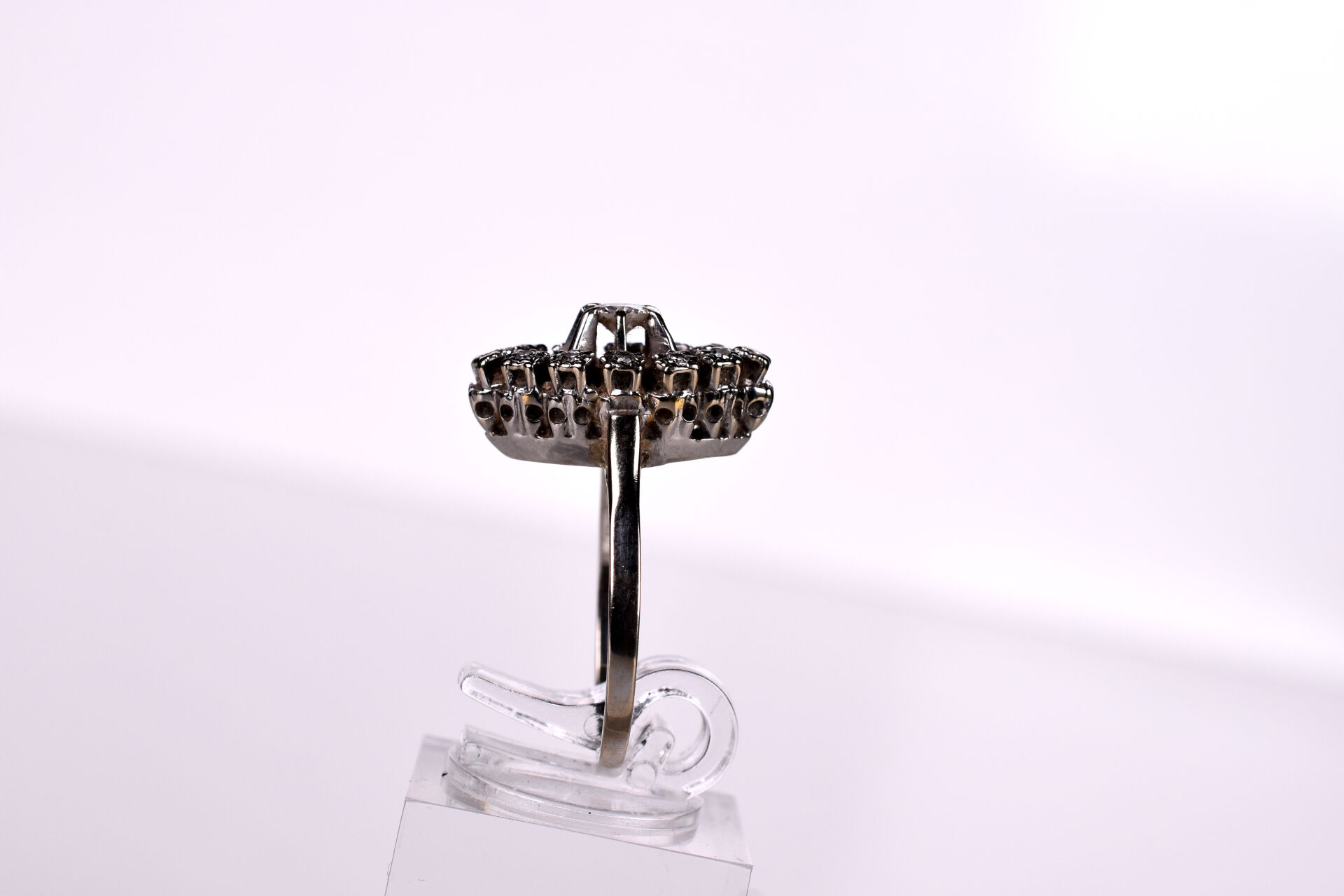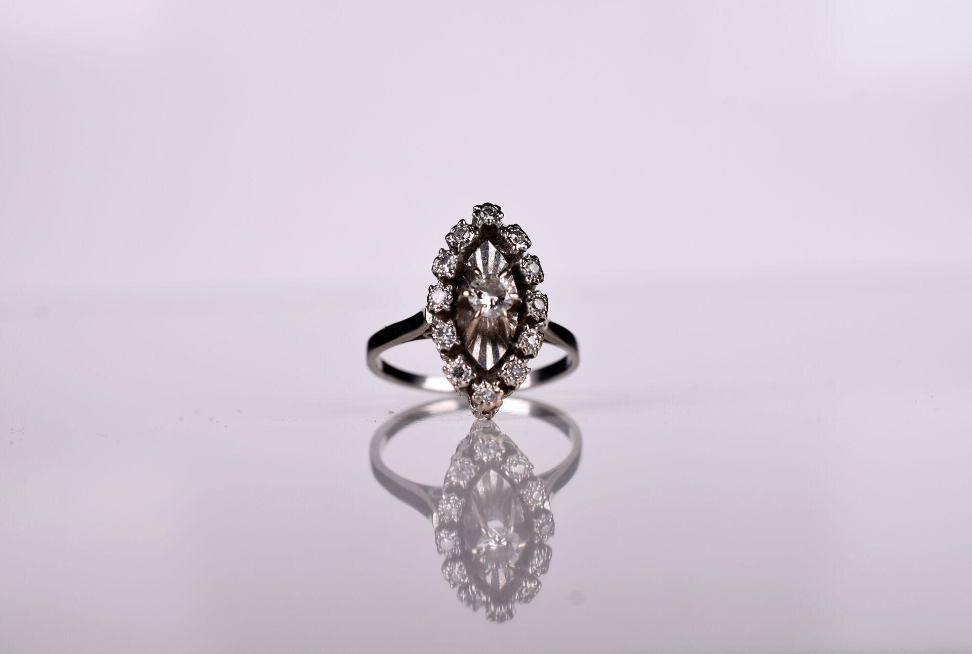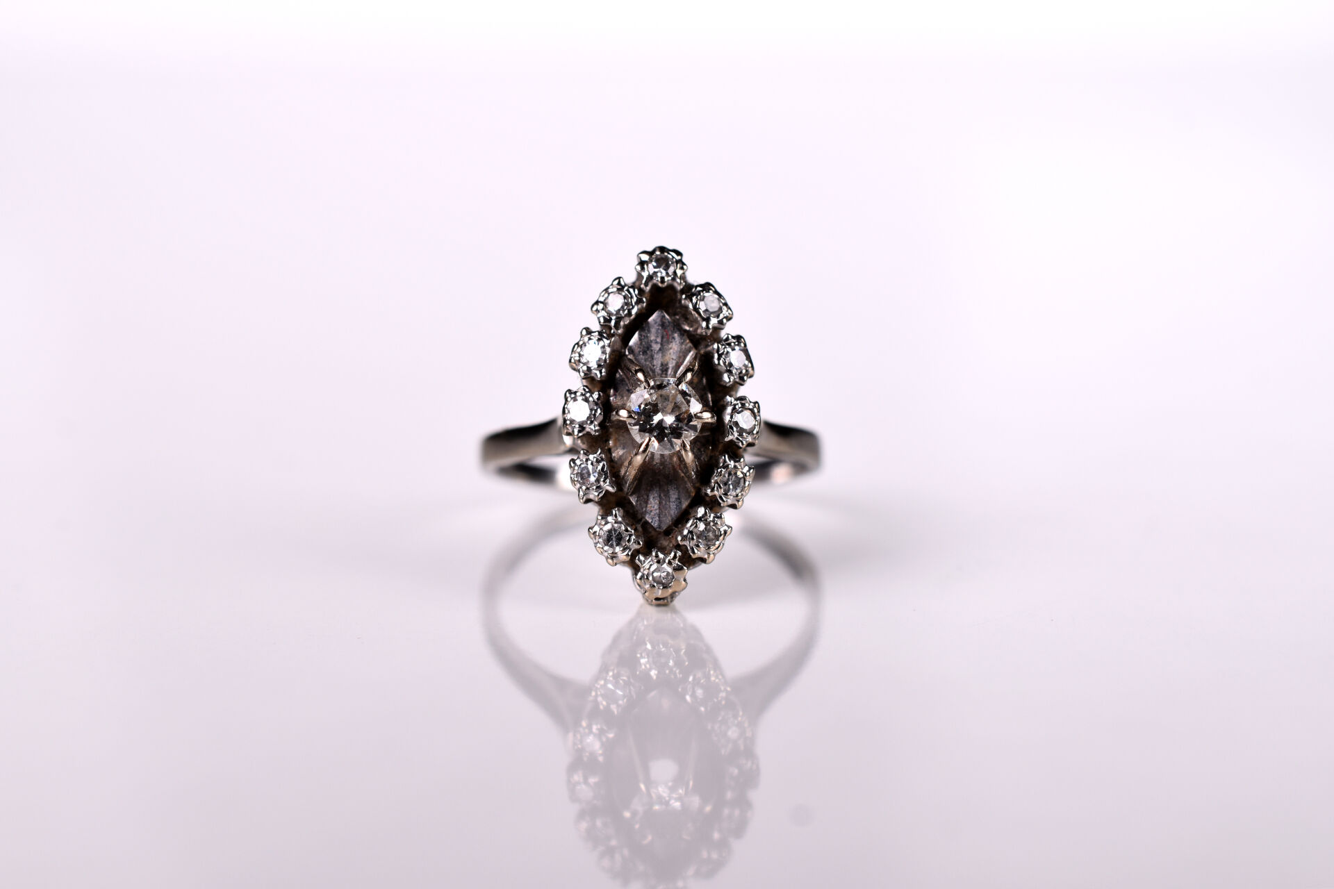 Bague marquise en or gris 18K 750/1000e centrée d’un diamant taille moderne d’environ 0,25 carat dans une ligne de petits diamants. TDD. : 55. Poids brut. : 4,8 g.