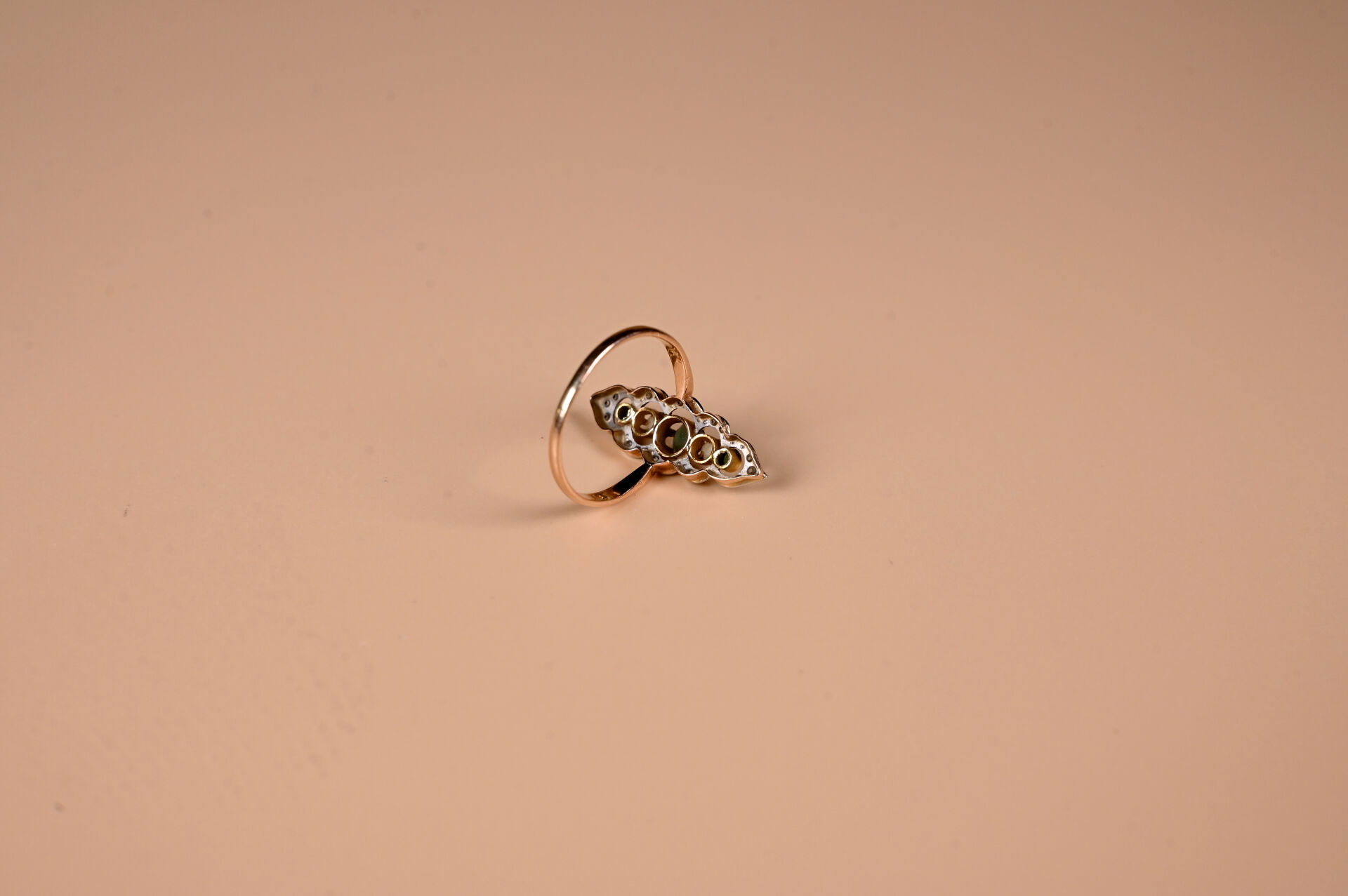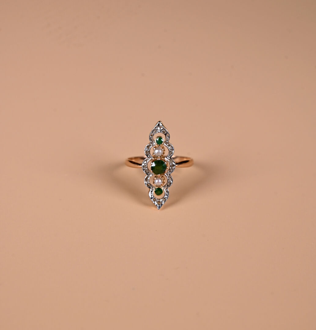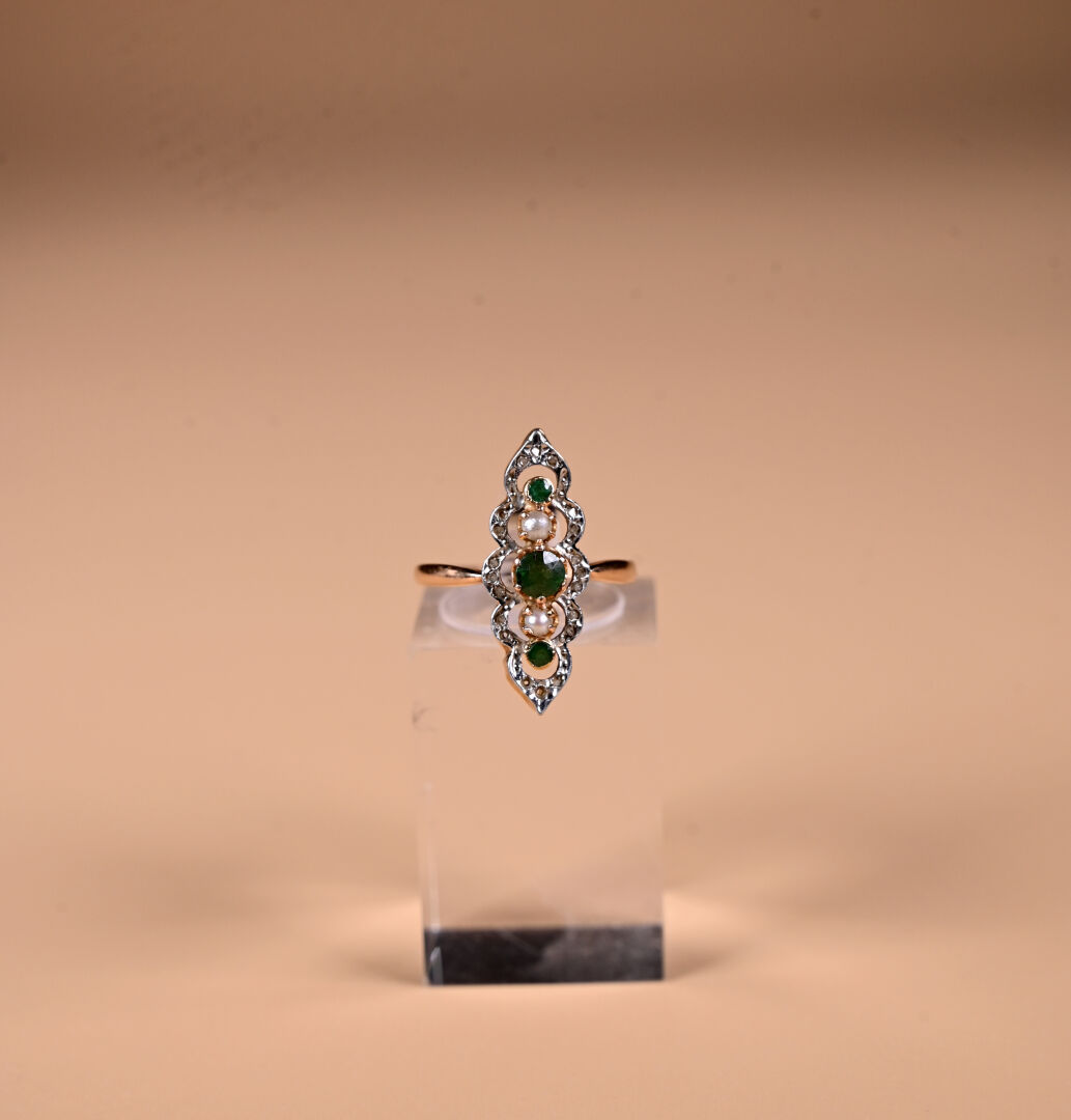 Bague marquise en or rose 18K 750/1000e avec plateau orné d’émeraudes, de demi-perles fines, et de diamants taille rose. Long. du plateau. : 2 cm. TDD. : 52. Poids brut. : 2,10 g.