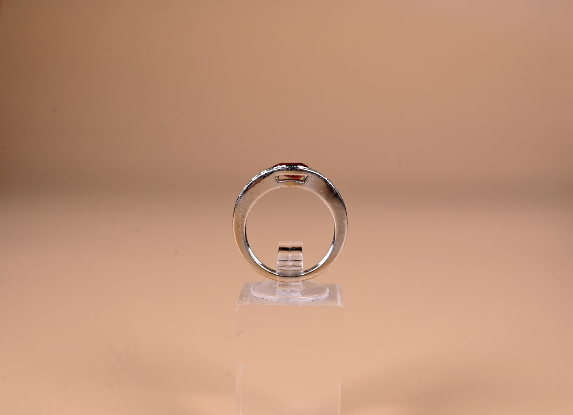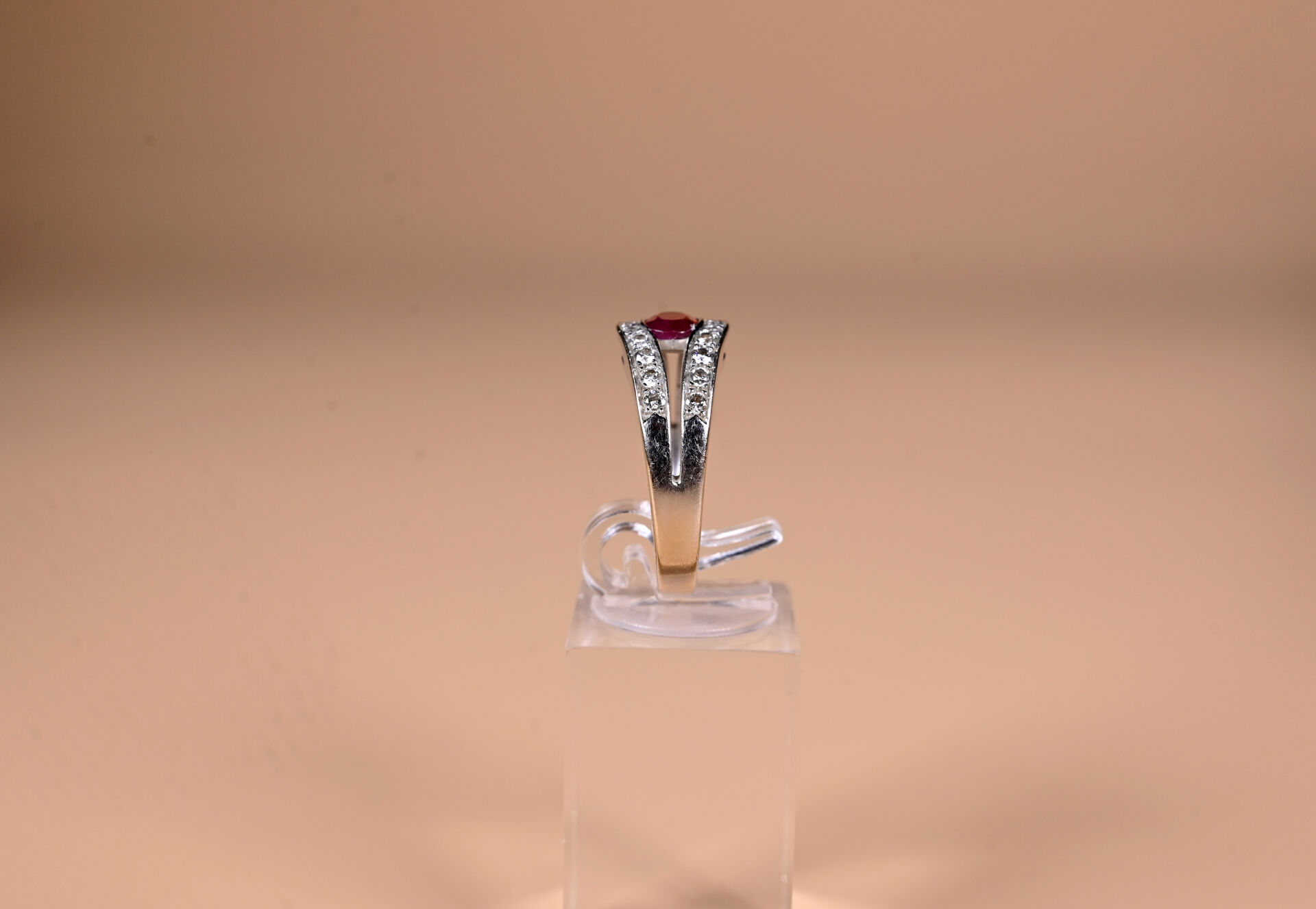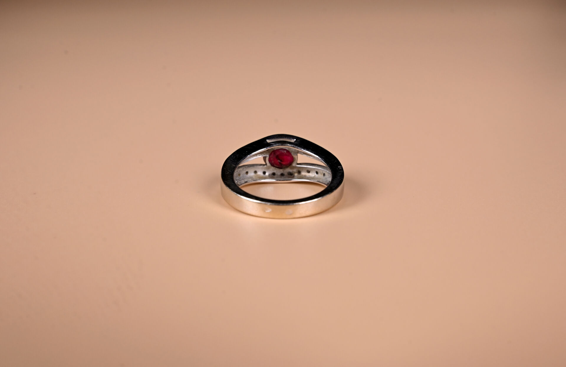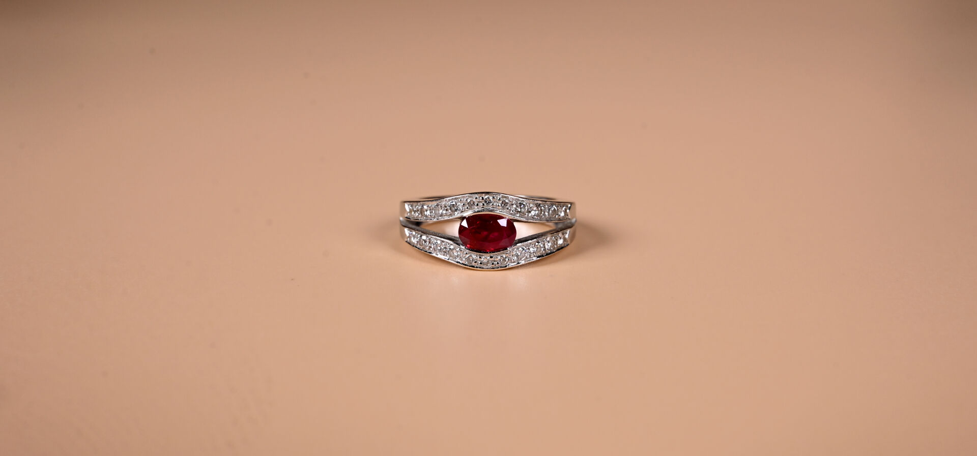 Bague moderne en or gris 18k 750 millièmes présentant deux anneaux diamantés reliés par un rubis ovale (traité). TDD 55. Poids brut : 6,9 g.