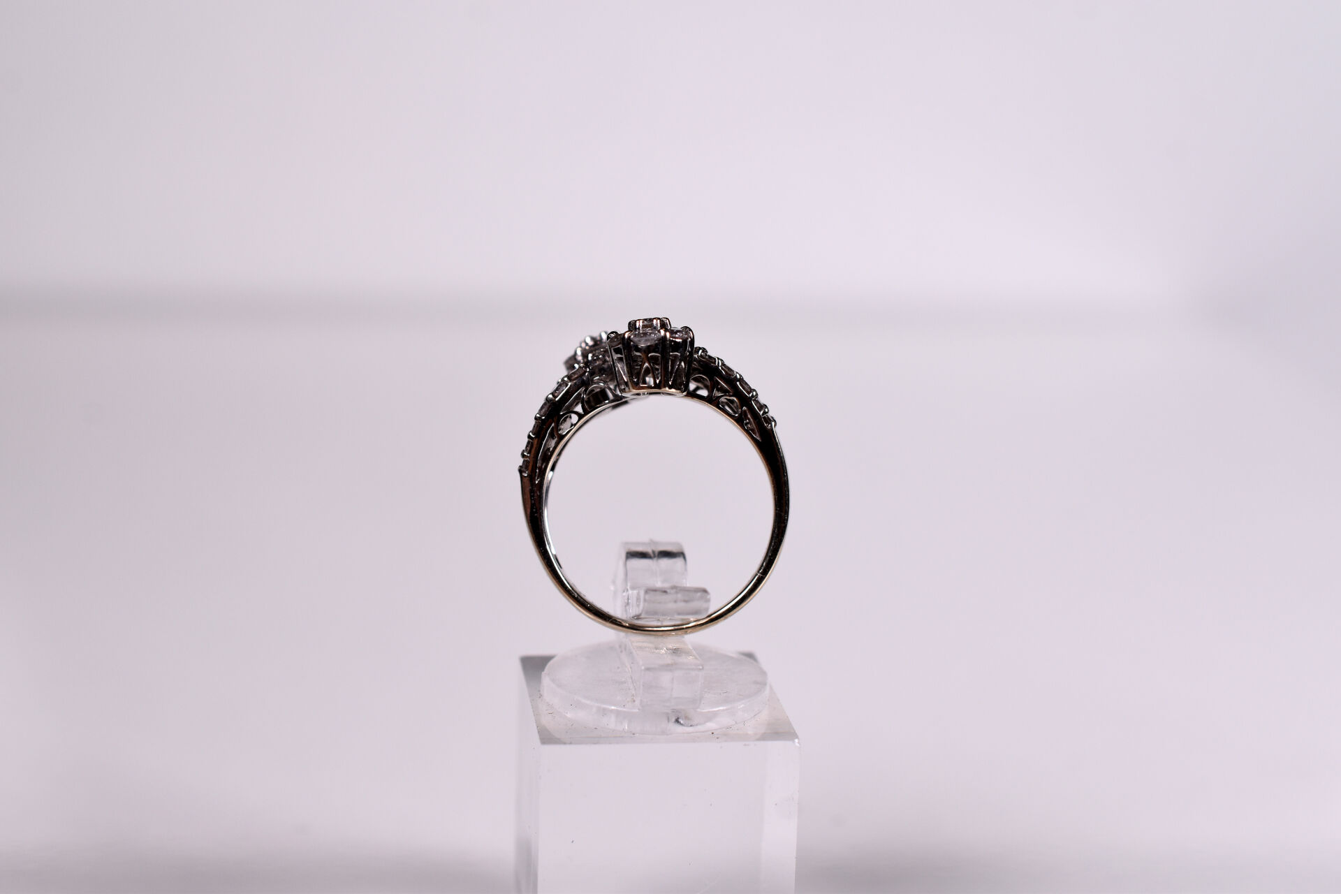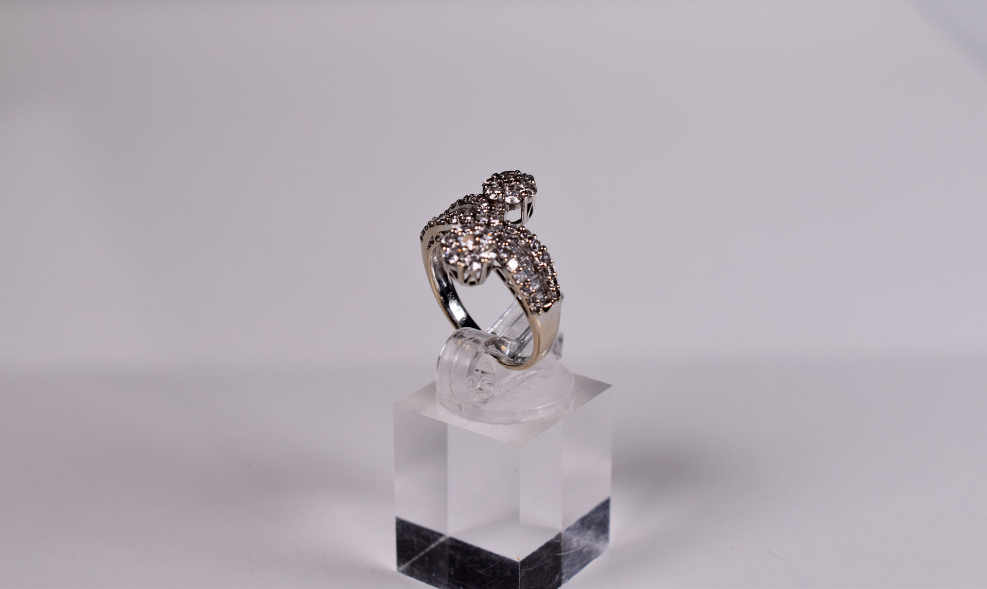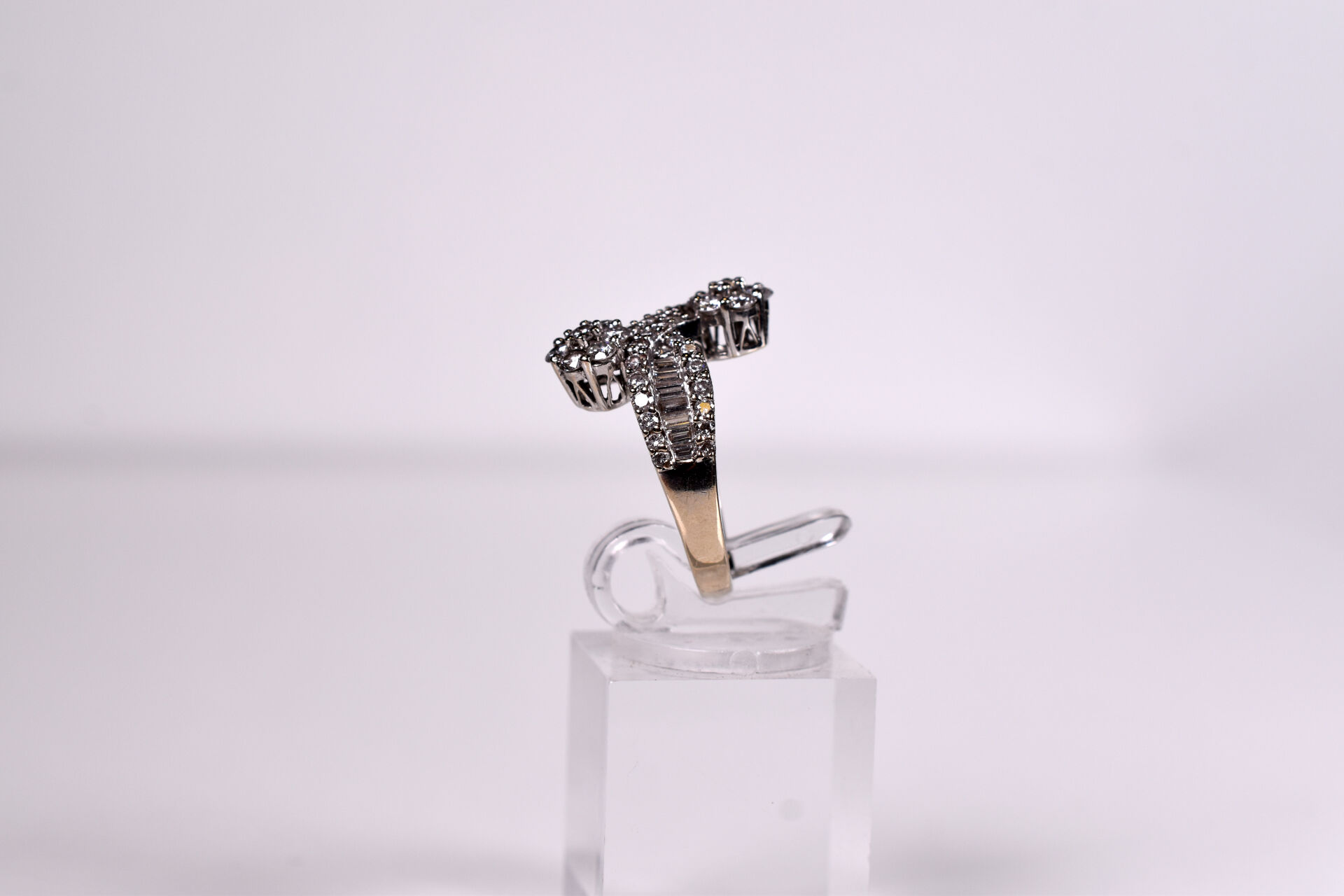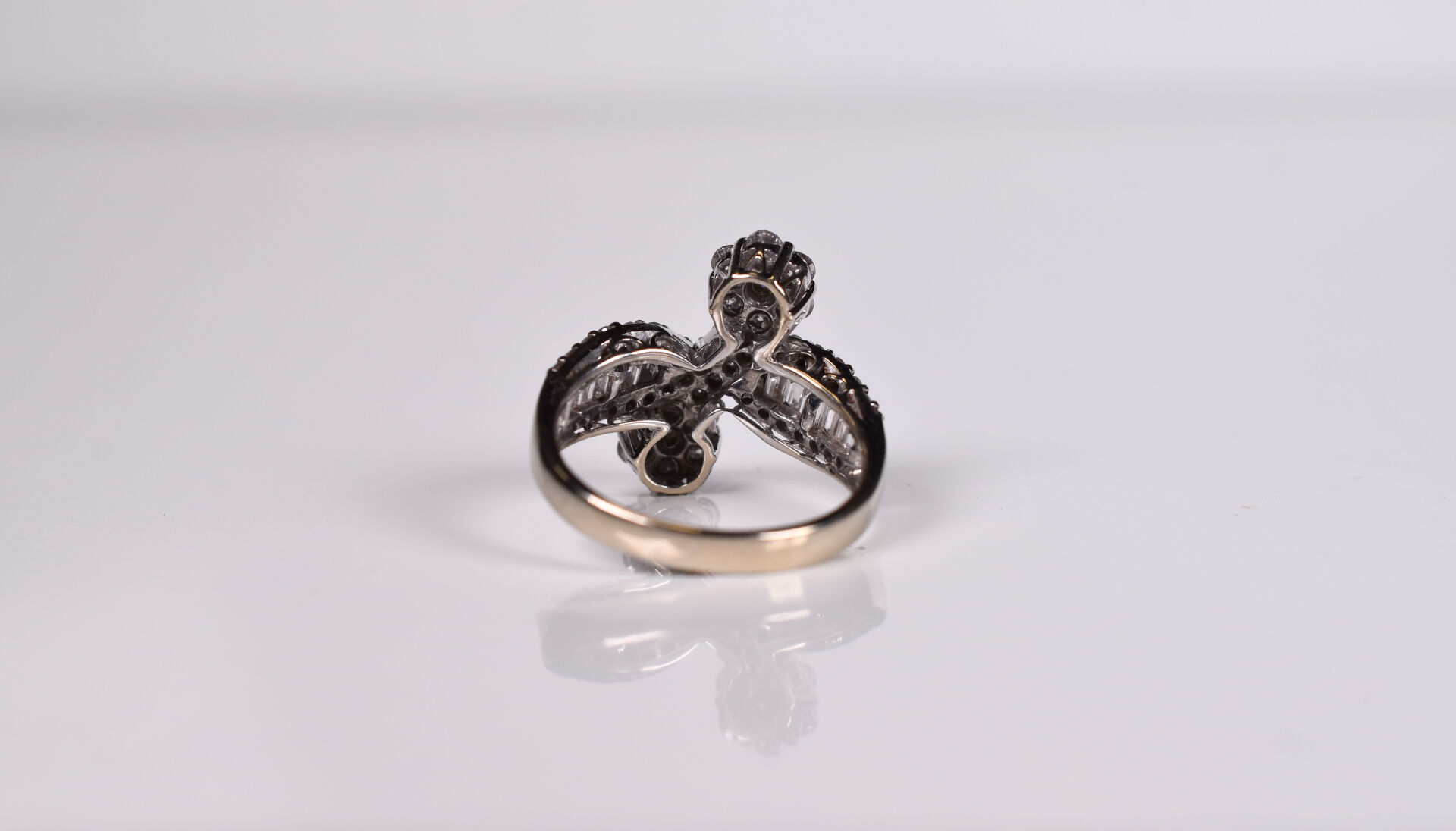 Bague moderne type « vous et moi » et or gris 18K 750/1000e sertie de diamants baguettes et motif de deux fleurs pavées de 7 diamants de 0,04 carats environ. TDD. : 56. Poids brut. : 6 g.