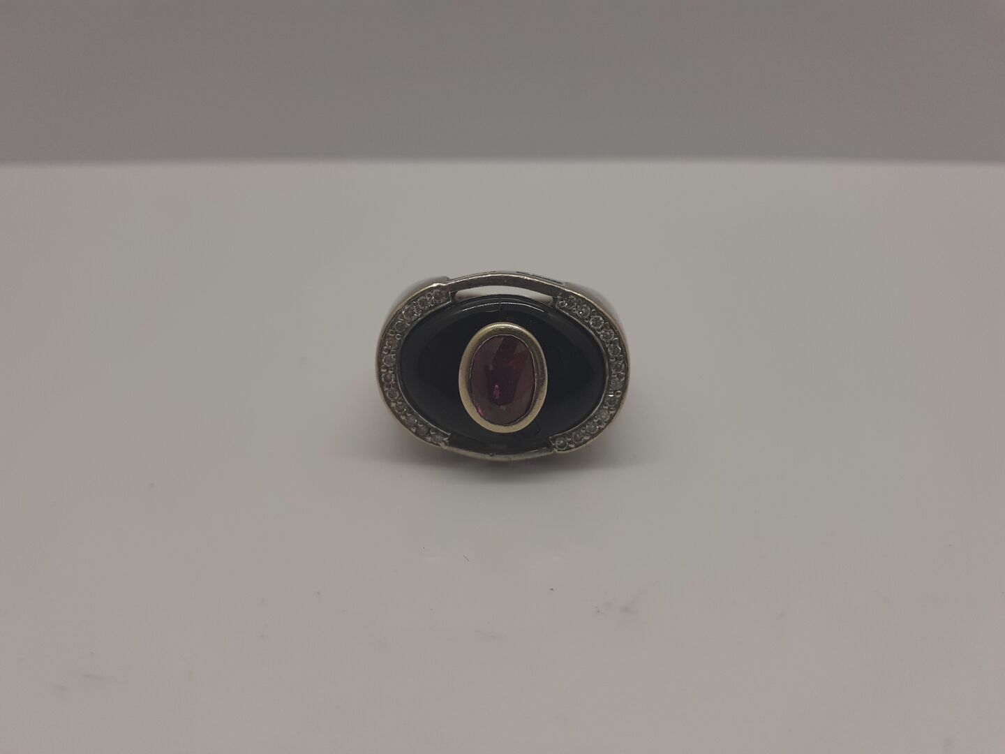 Bague or gris 18k 750/1000e sertie d’une pierre violette (arrêtes usées) cerclée de diamants de poids inférieur à 0,02 carat (chocs – tdd 55) AC. Poids brut = 17,95g.