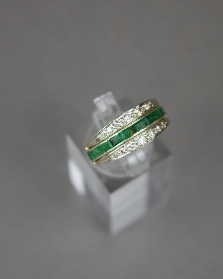 Bague réversible en or gris 9 K 375/1000e sertie de deux rangs de petits diamants, la pluspart de taille ancienne, le plus important d’environ 0.05 carat d’un rang de rubis et émeraudes de taille baguette (manque). TDD 53, Poids brut: 5, 8 g.