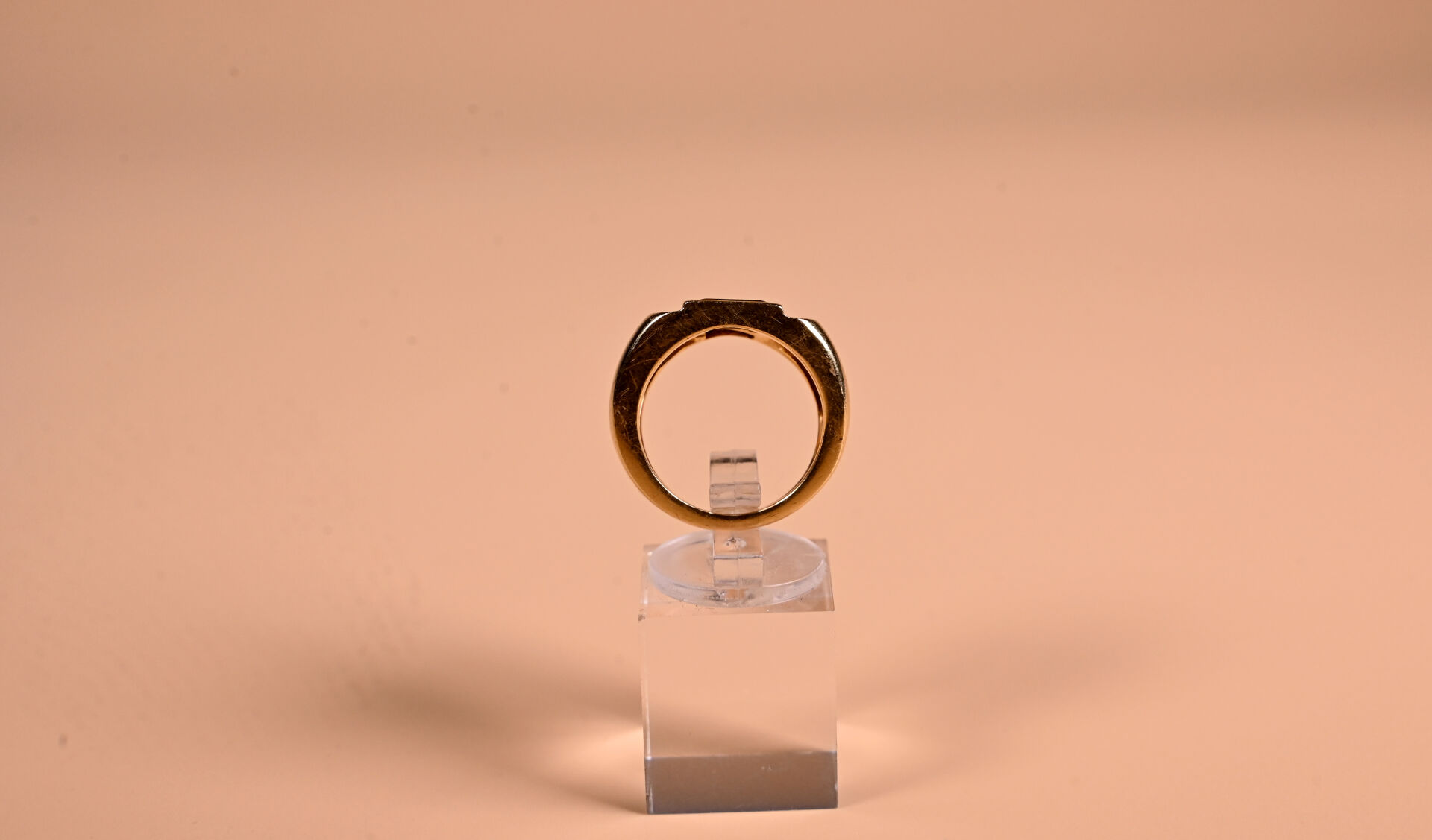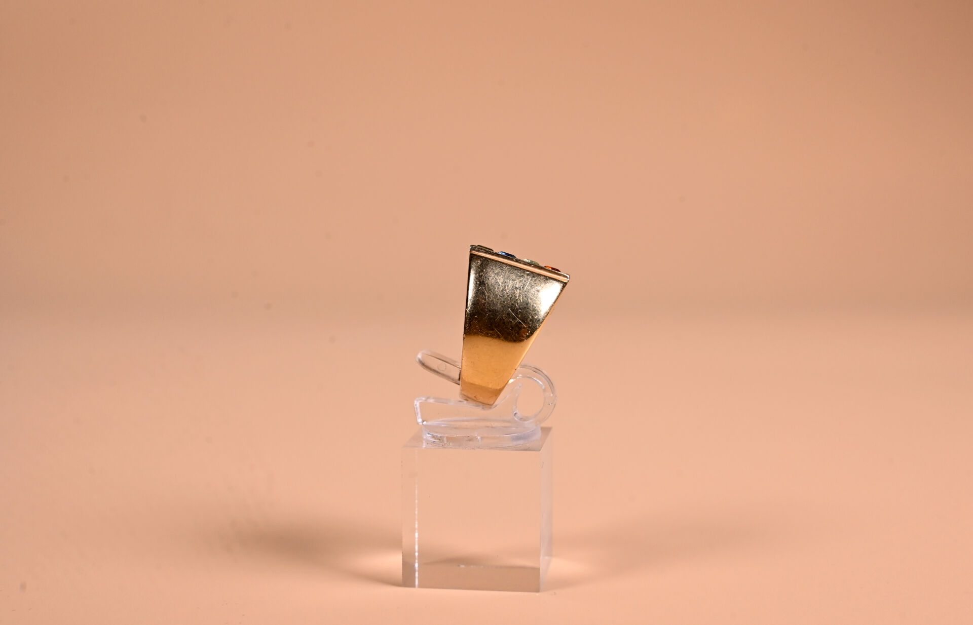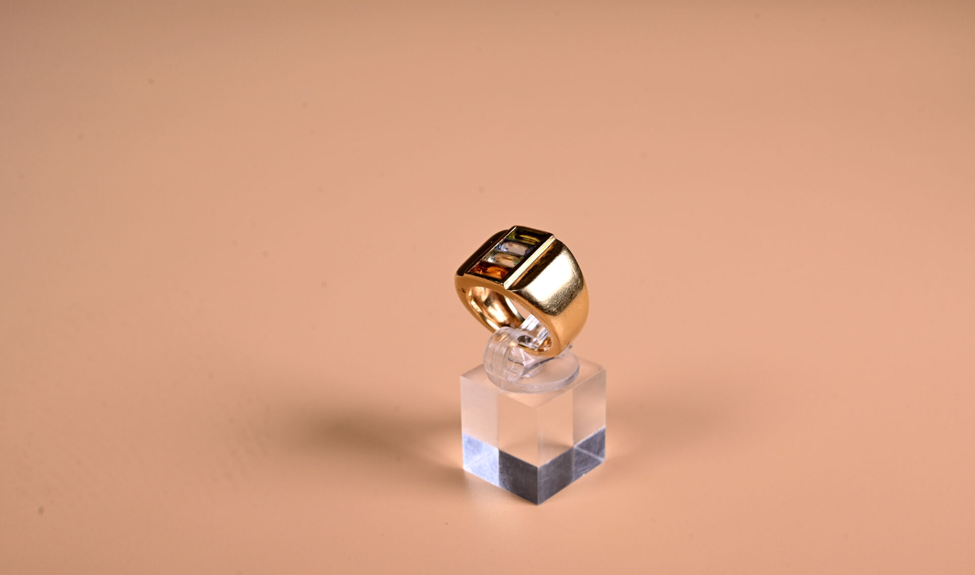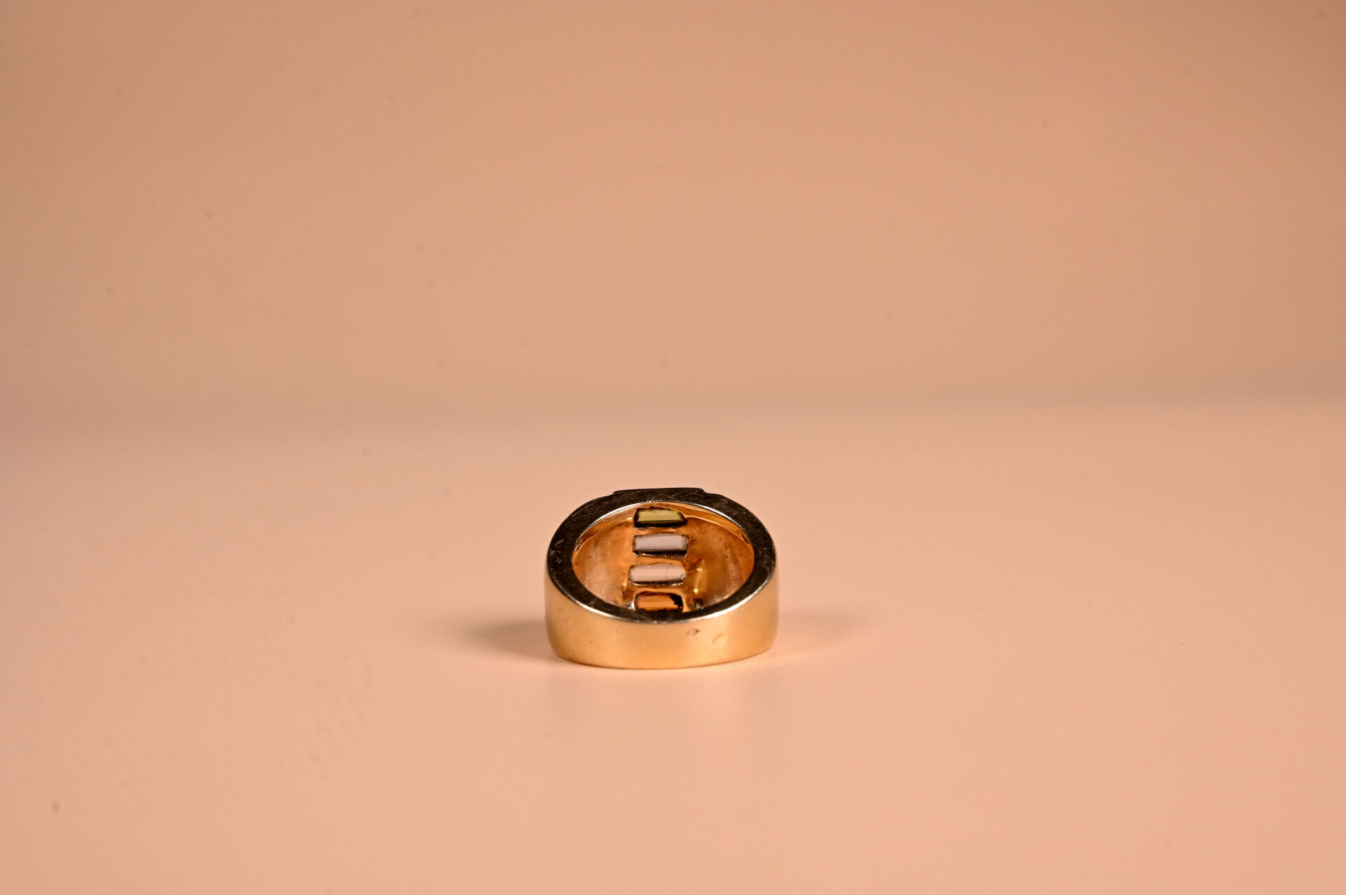 Bague style tank en or jaune 18K 750/1000e centrée de 4 pierre fines en baguette. TDD 56. Poids brut. : 19,4 g.