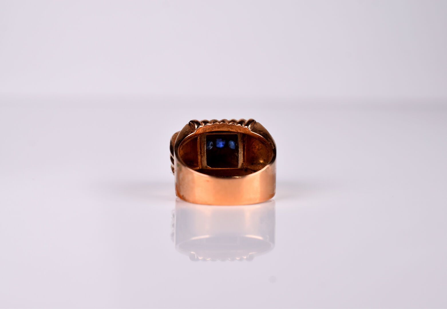 Bague tank en or jaune 18K 750/1000e à plateau carré à ponts godronnés centrés de trois petits saphirs et de diamants taille rose. TDD 54. Poids brut. : 8,6 g.