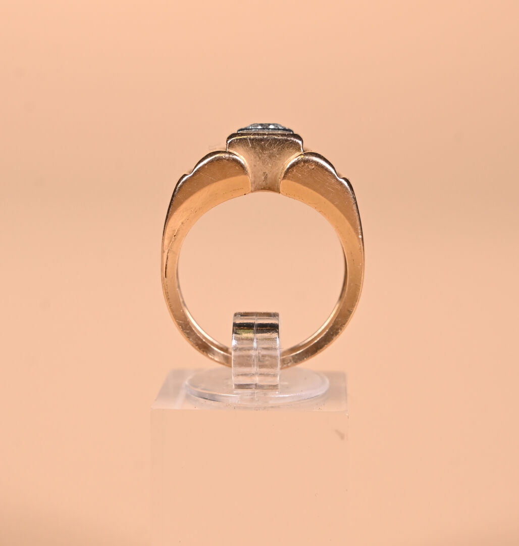 Bague tank en or jaune 18K 750/1000e et diamant demi-taille d’env. 0,15 ct (serti platine). Vers 1940. TDD 56. Poids brut : 7,06 g. A charge : le lot sera poinçonné avant la vente.