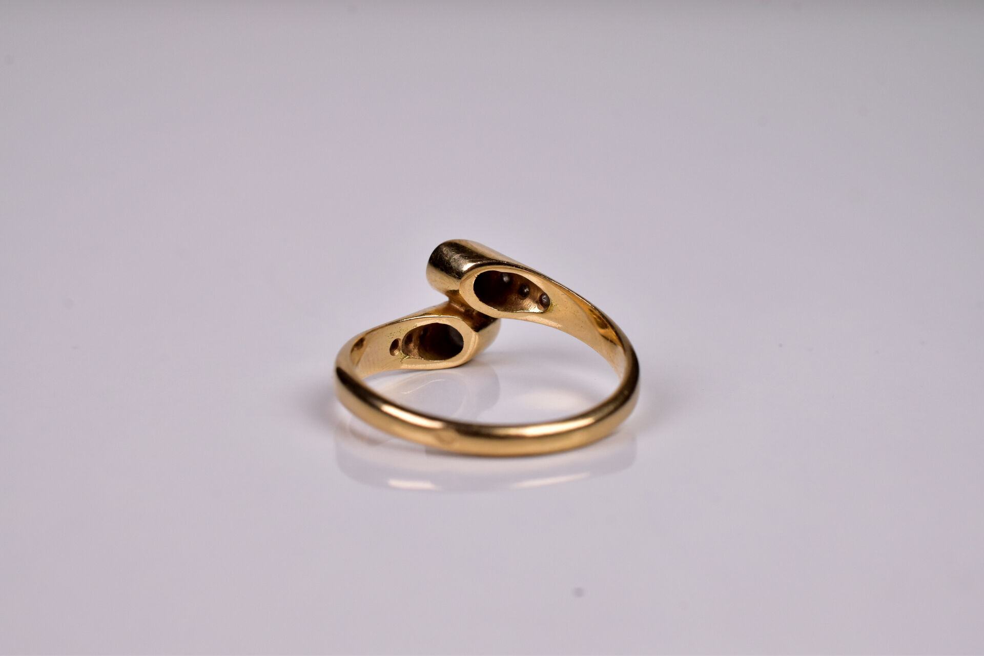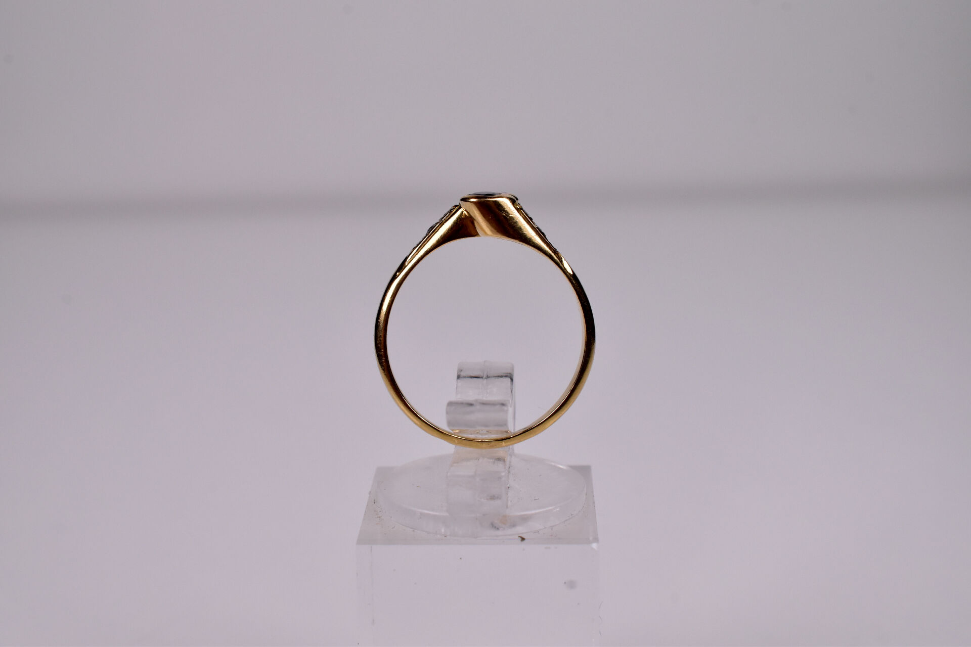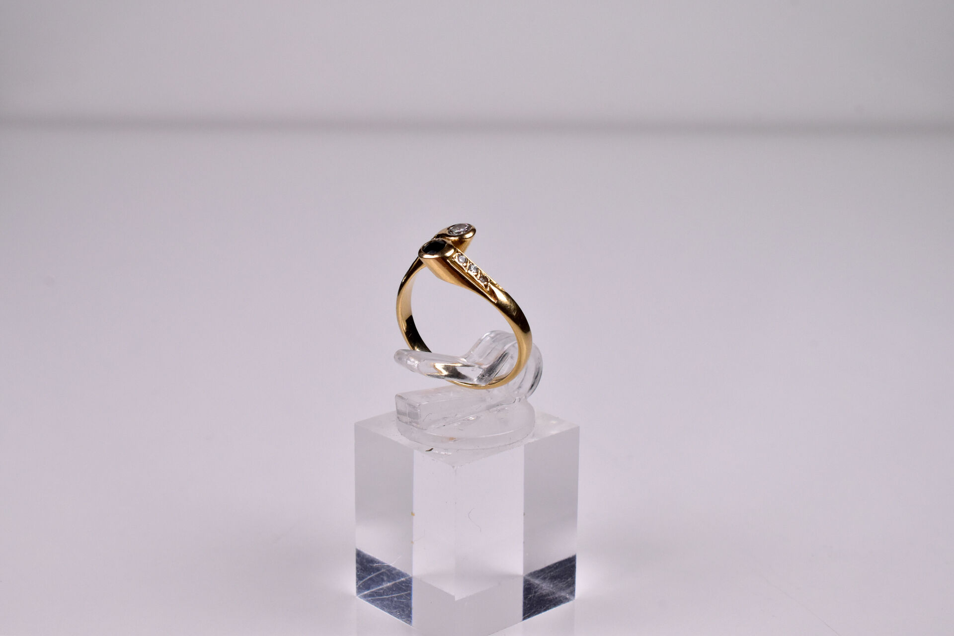 Bague « Vous et moi » en or jaune 18K 750/1000e ornée d’un saphir rond, d’un diamant taille moderne d’environ 0,15 carat et de petits diamants sur l’épaulement. TDD 53. Poids brut. : 2,7 g.