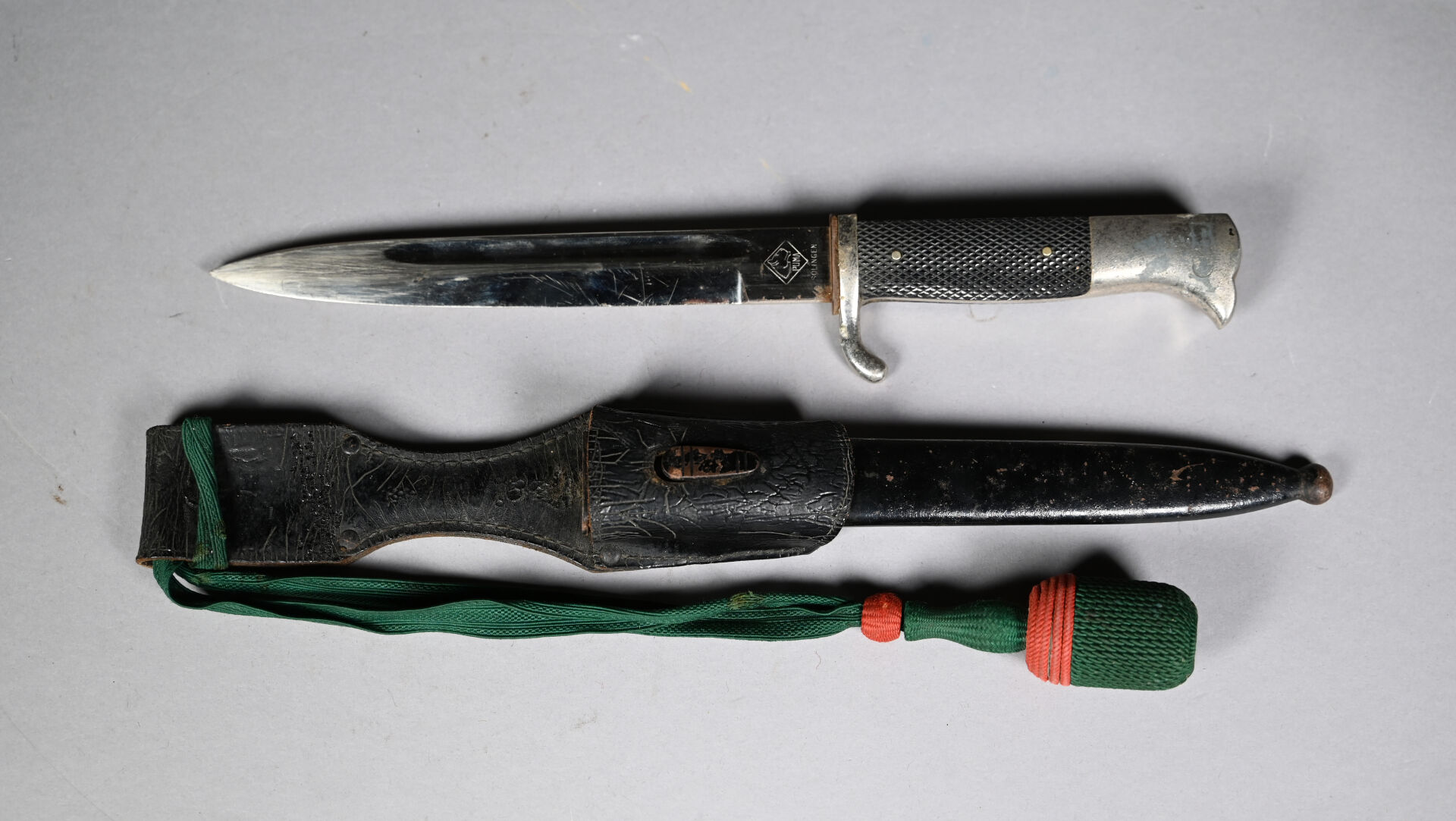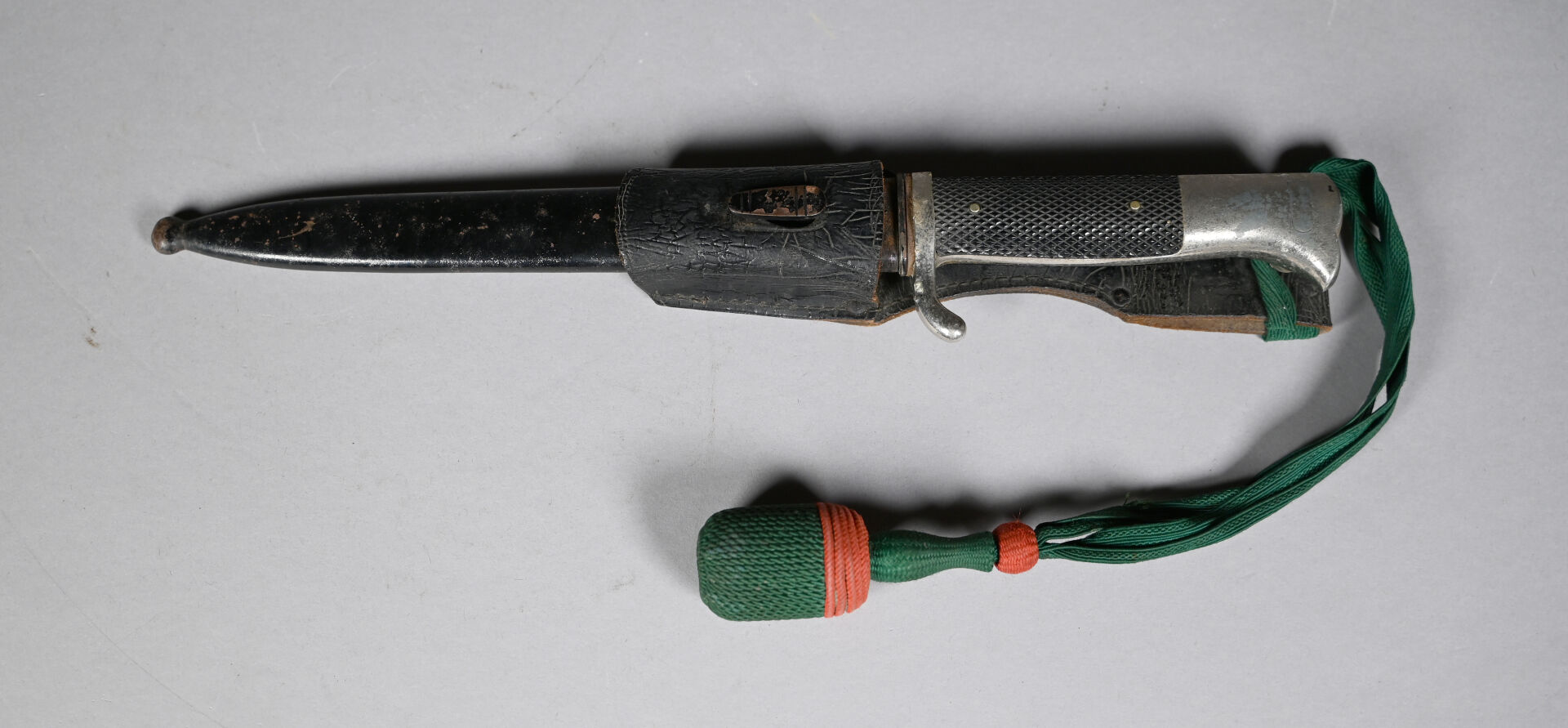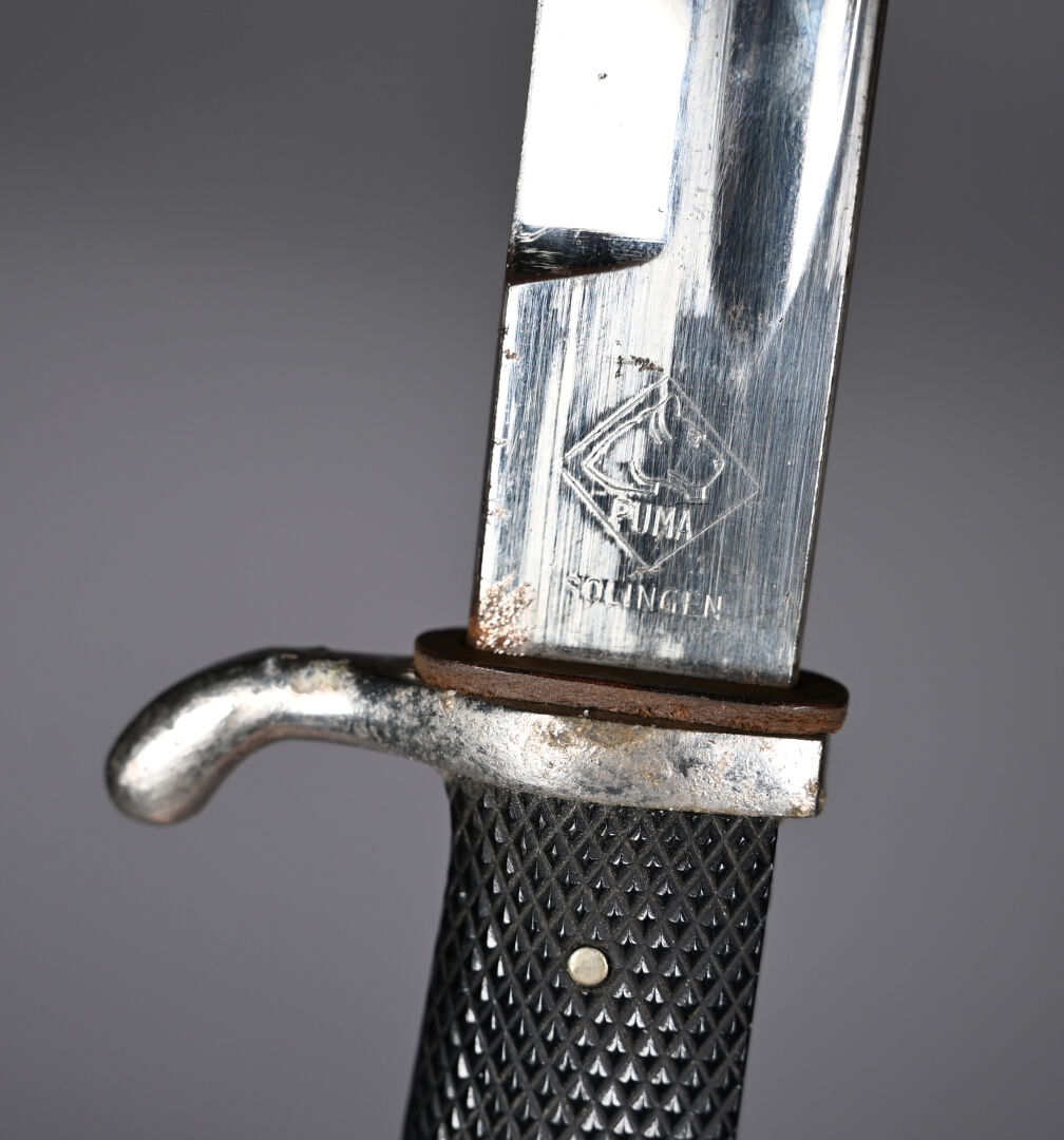 Baïonnette Allemande de sortie non réglementaire fabrication « PUMA » entre deux guerres, plaquettes bakélite quadrillée, lame nickelée, avec son fourreau en tôle d’acier laqué noir, avec sa dragonne en laine verte et rouge et son porte fourreau en cuir noir. Lame SOLIGEN. Long. totale :32,5 cm. (Etat 1)
