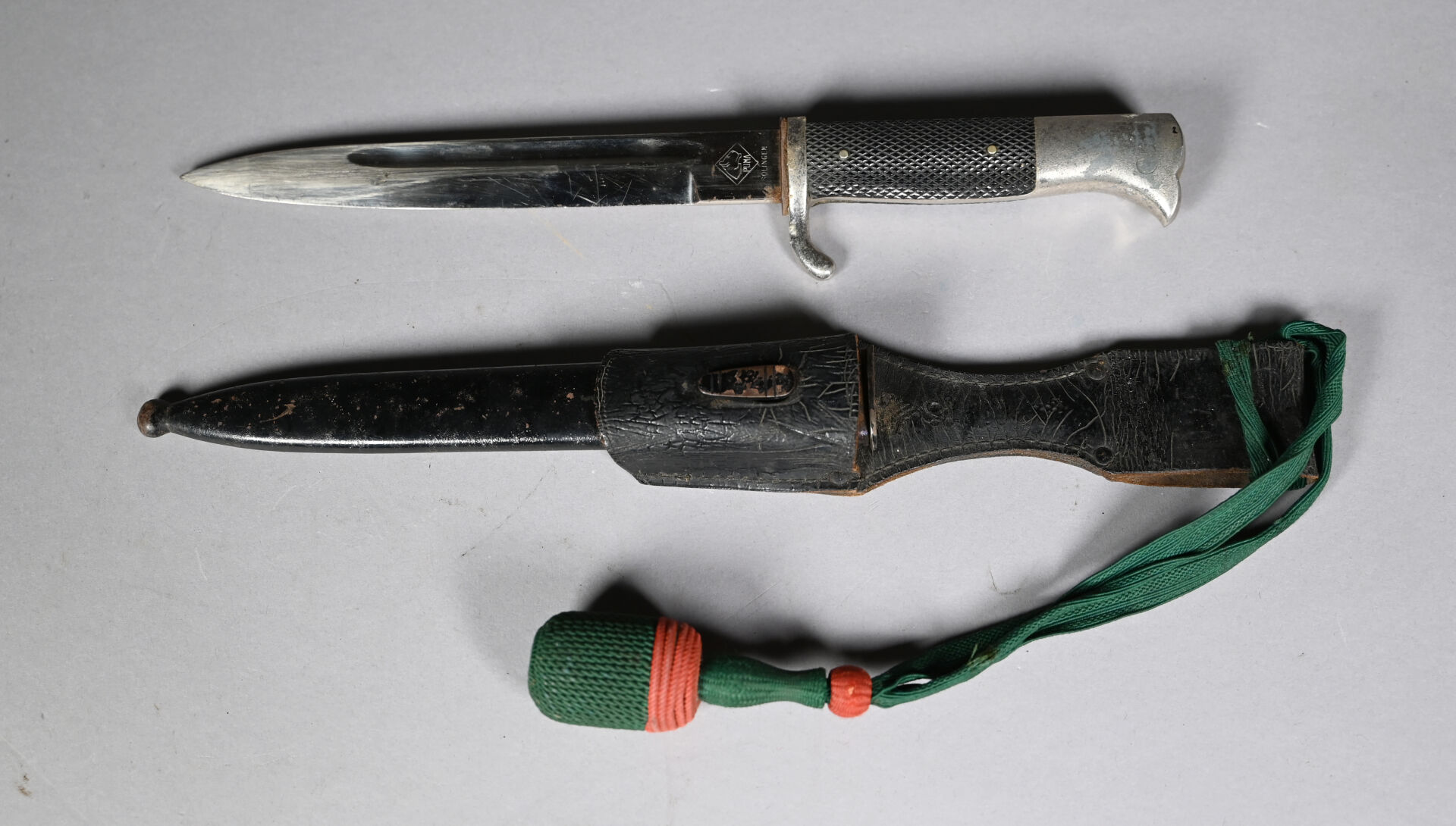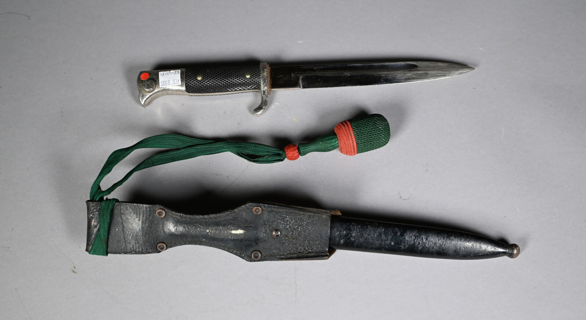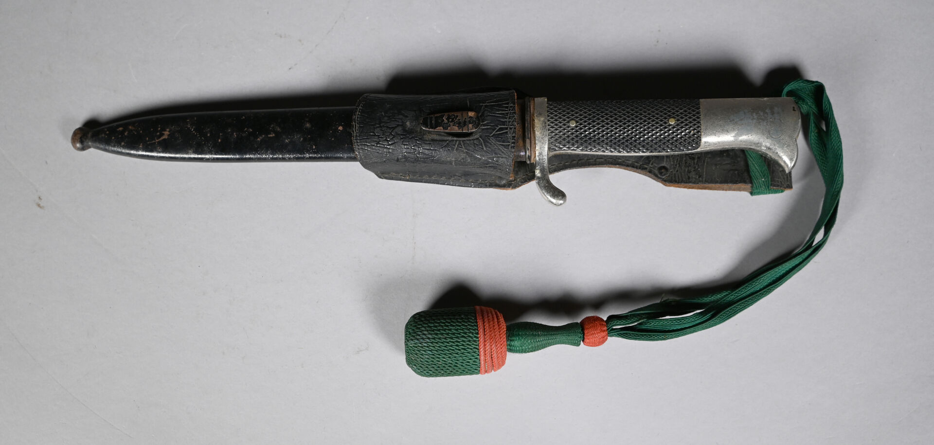 Baïonnette Allemande de sortie non réglementaire fabrication « PUMA » entre deux guerres, plaquettes bakélite quadrillée, lame nickelée, avec son fourreau en tôle d’acier laqué noir, avec sa dragonne en laine verte et rouge et son porte fourreau en cuir noir. Lame SOLIGEN. Long. totale :32,5 cm. (Etat 1)