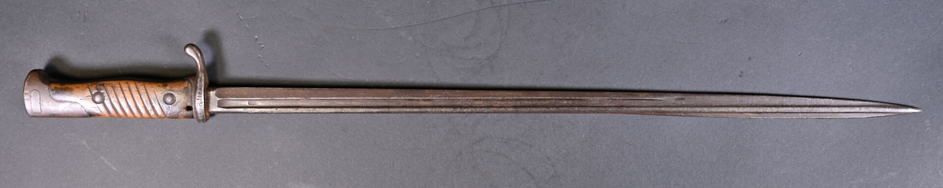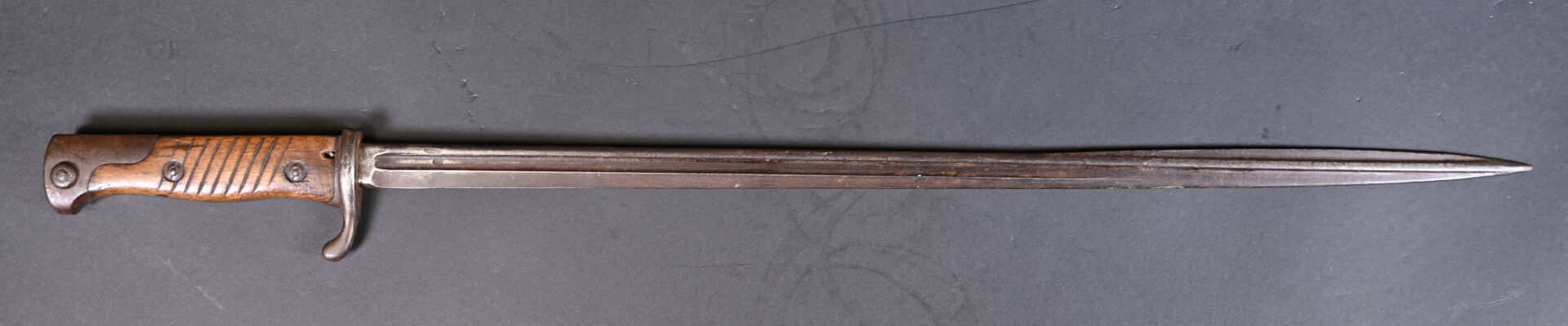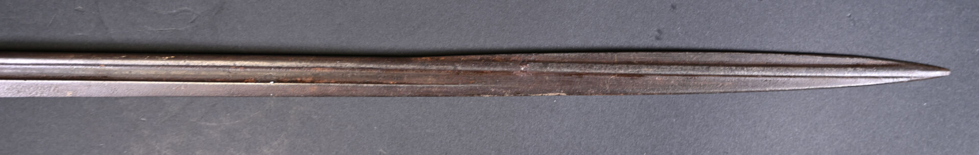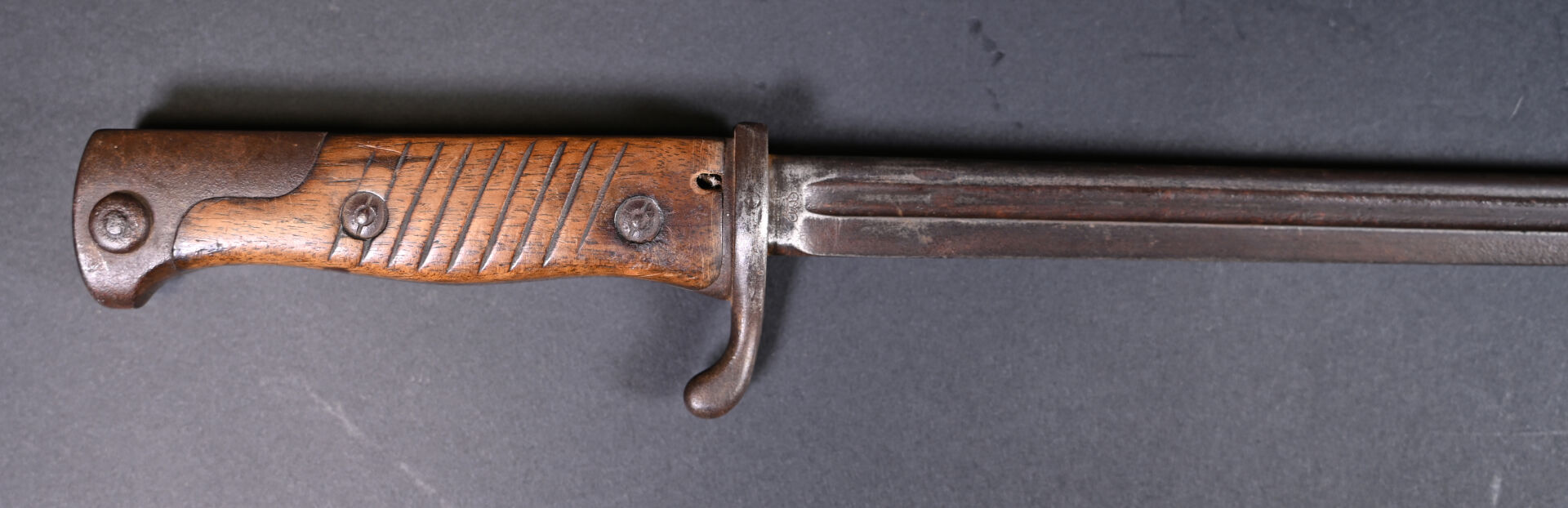 Baïonnette allemande modèle 1898 seconde version (deux plaquettes). Lame signée au ricasso de l’arsenal d’Erfurt. Croisière de garde avec réception régimentaire 140. R. 11.38″ (38ème arme de la 11ème compagnie du 140ème régiment d’infanterie « 4ème de Thuringe »). Pas de fourreau. (État 2).