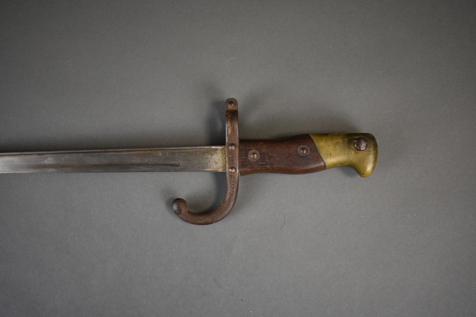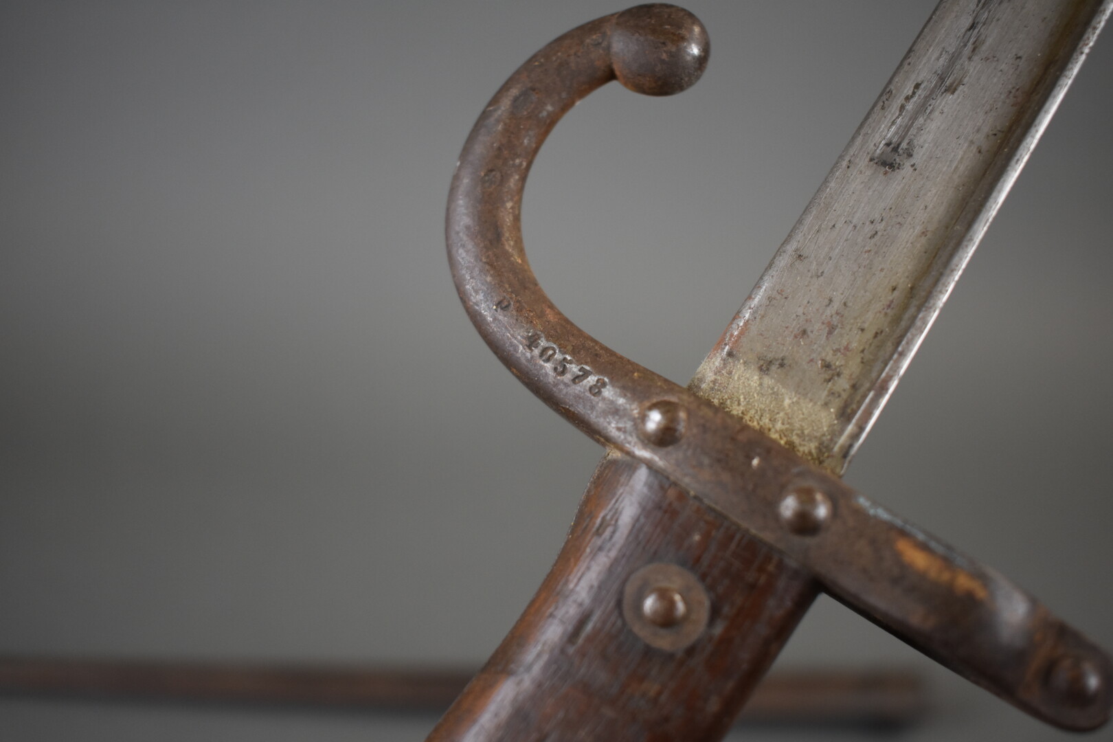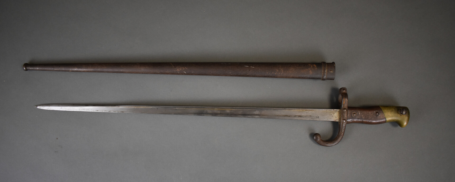 Baïonnette de fusil Gras infanterie dans son fourreau fabrication « Manufacture d’Armes de Saint Étienne janvier 1880 ». Fourreau au numéro. État 2.